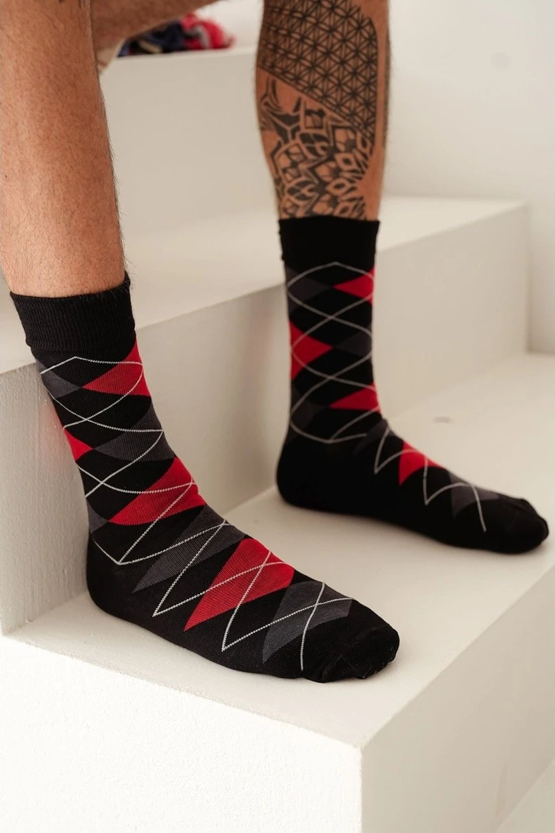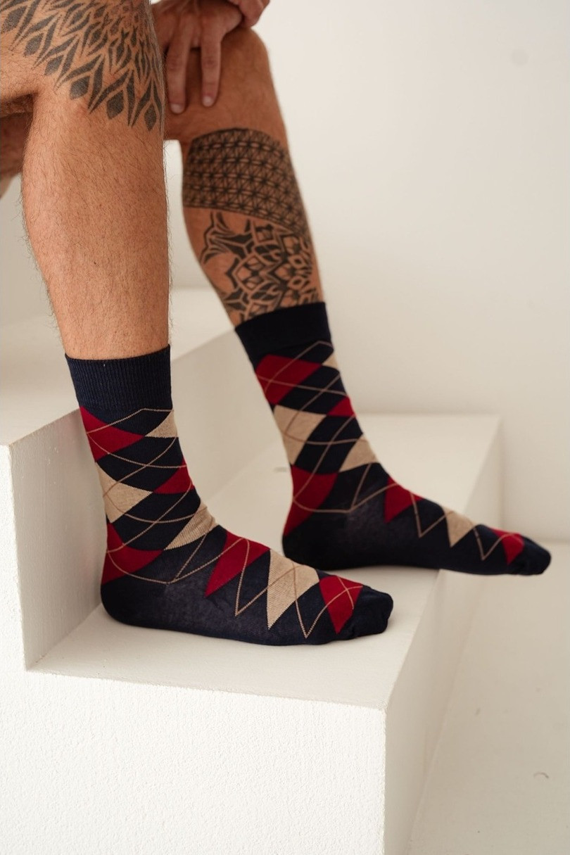 Pánské ponožky Romby jsou klasikou v moderním vydání. Díky stylovému geometrickému vzoru se hodí jak k elegantnímu obleku, tak ke každodennímu oblečení. Jsou vyrobeny z kvalitní bavlny, jsou měkké, vzdušné a mimořádně pohodlné na nošení. Směs polyamidu a elastanu zajišťuje pružnost a dokonalé přizpůsobení noze. Jsou ideální volbou pro muže, kteří ocení pohodlí, kvalitu a nadčasový styl.