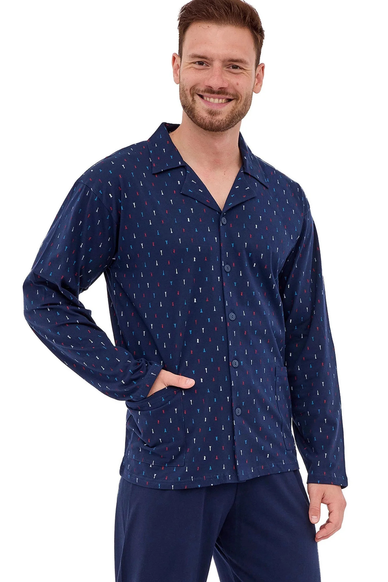 Pánské pyžamo 114/71 plus CORNETTE - z vysoce jakostní bavlny - tmavě modrá vzorovaná košile s dlouhými rukávy a kapsami - s límečkem - zapínání na knoflíky - pohodlné jednobarevné dlouhé kalhoty