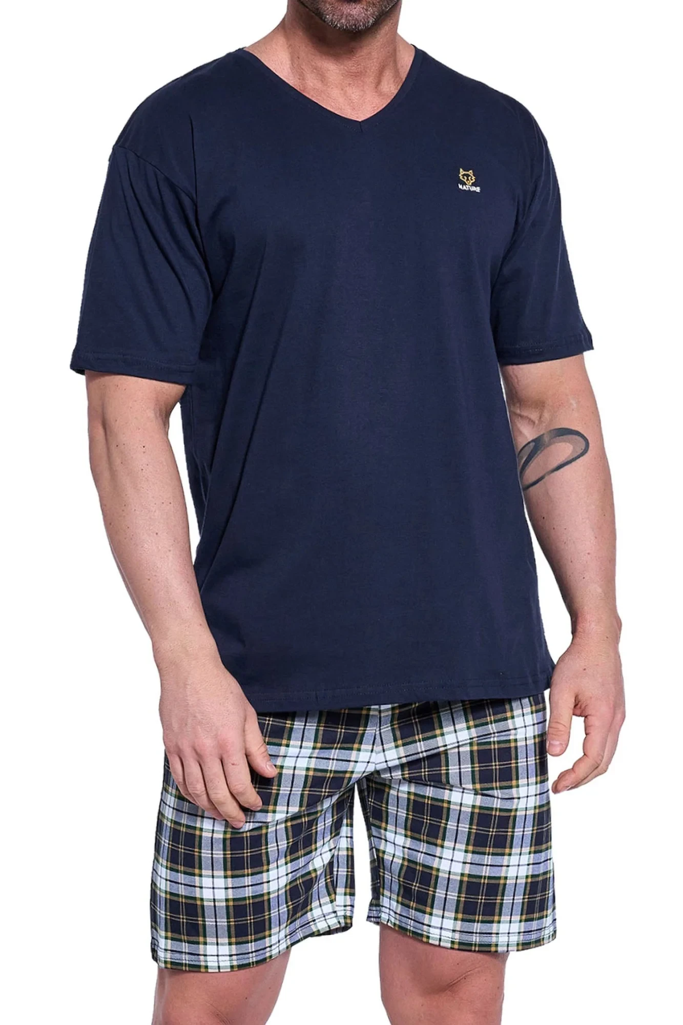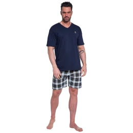 Pánské pyžamo 326/181 Nature CORNETTE - z vysoce jakostní bavlny - tmavě modré tričko s krátkými rukávy - půlkulatý výstřih - ozdobené potiskem na přední straně - kárované kraťasyMateriálové složení: 100% bavlna