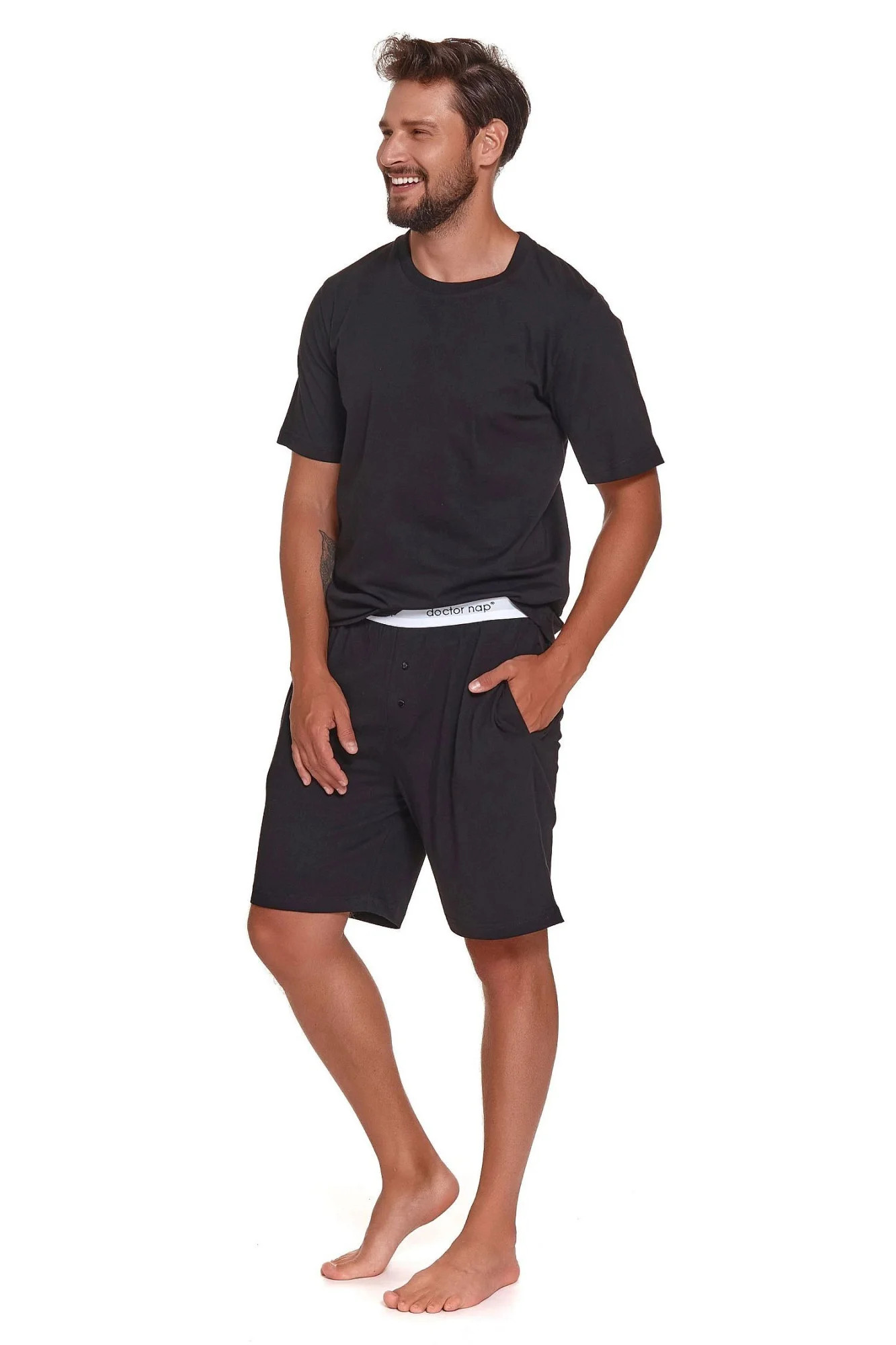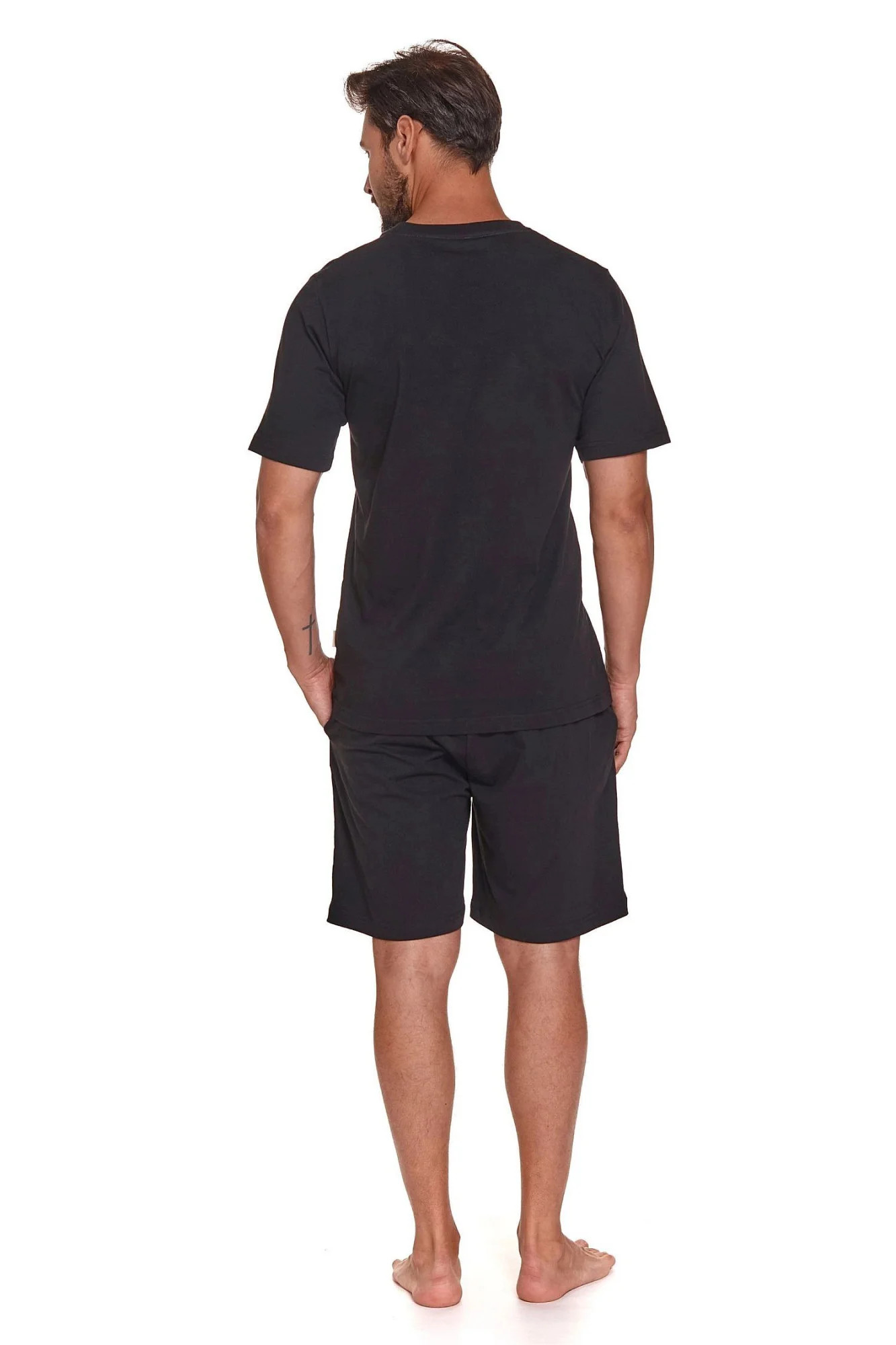Pánské pyžamo 4332 black Doctornap - z vysoce jakostní bavlny - černé tričko s krátkými rukávy - na přední straně kapsička - delší šortky černé barvy - zapínání v rozkroku - elastická guma v pase s nápisem - certifikát OEKO-TEX Standard 100