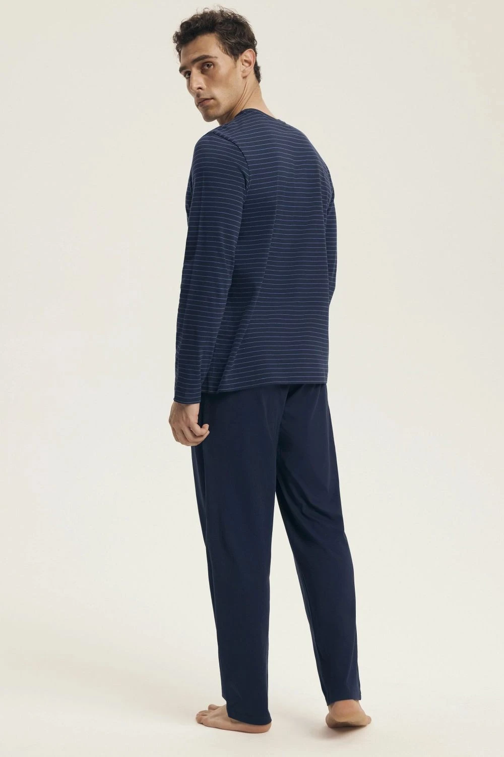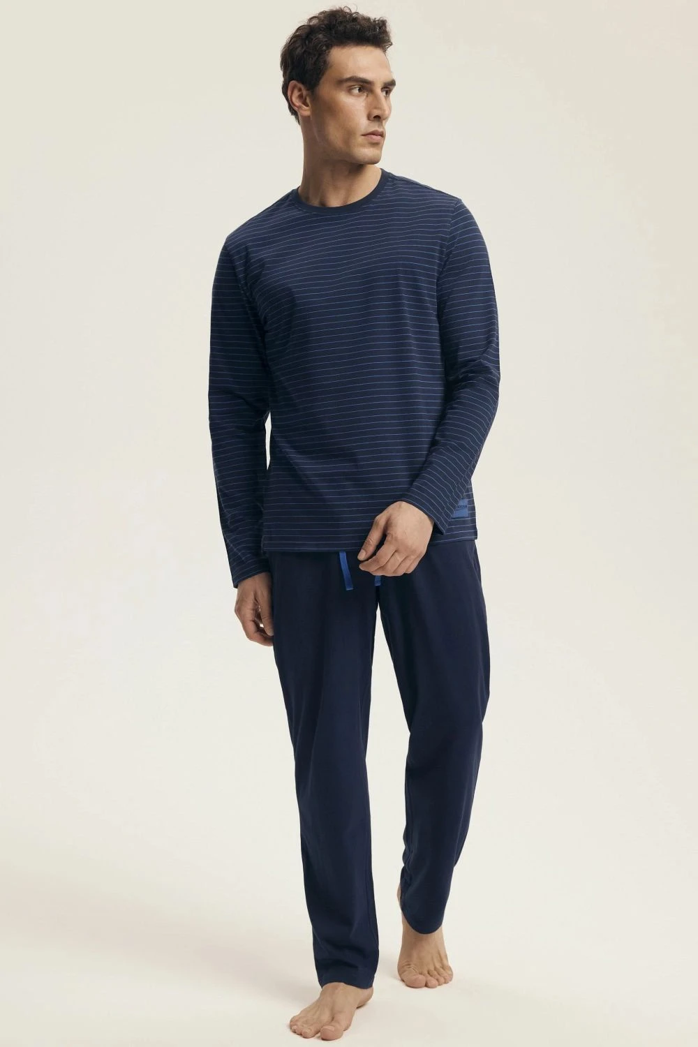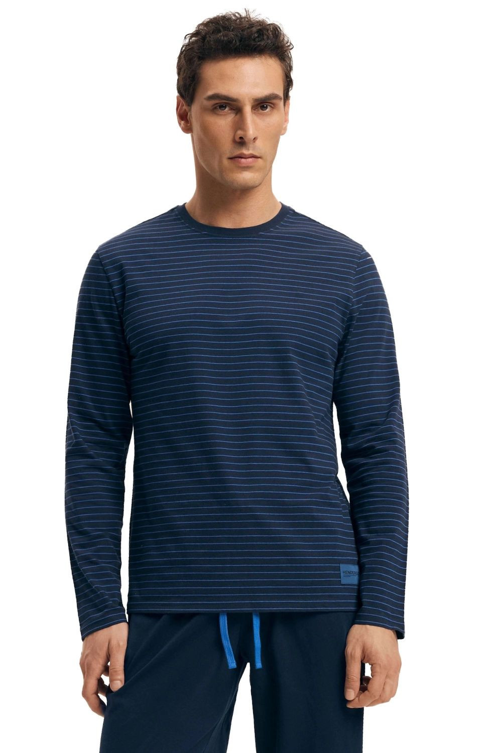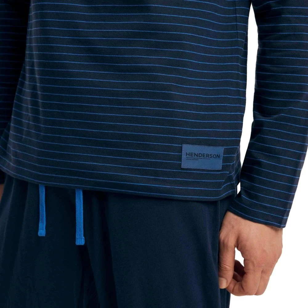Pánské pyžamo 43455 New blue HENDERSON - z vysoce jakostní bavlny - šedé tričko s dlouhými rukávy - s pruhy - dlouhé jednobarevné kalhoty - elastický pas - zavazování na šňůrku