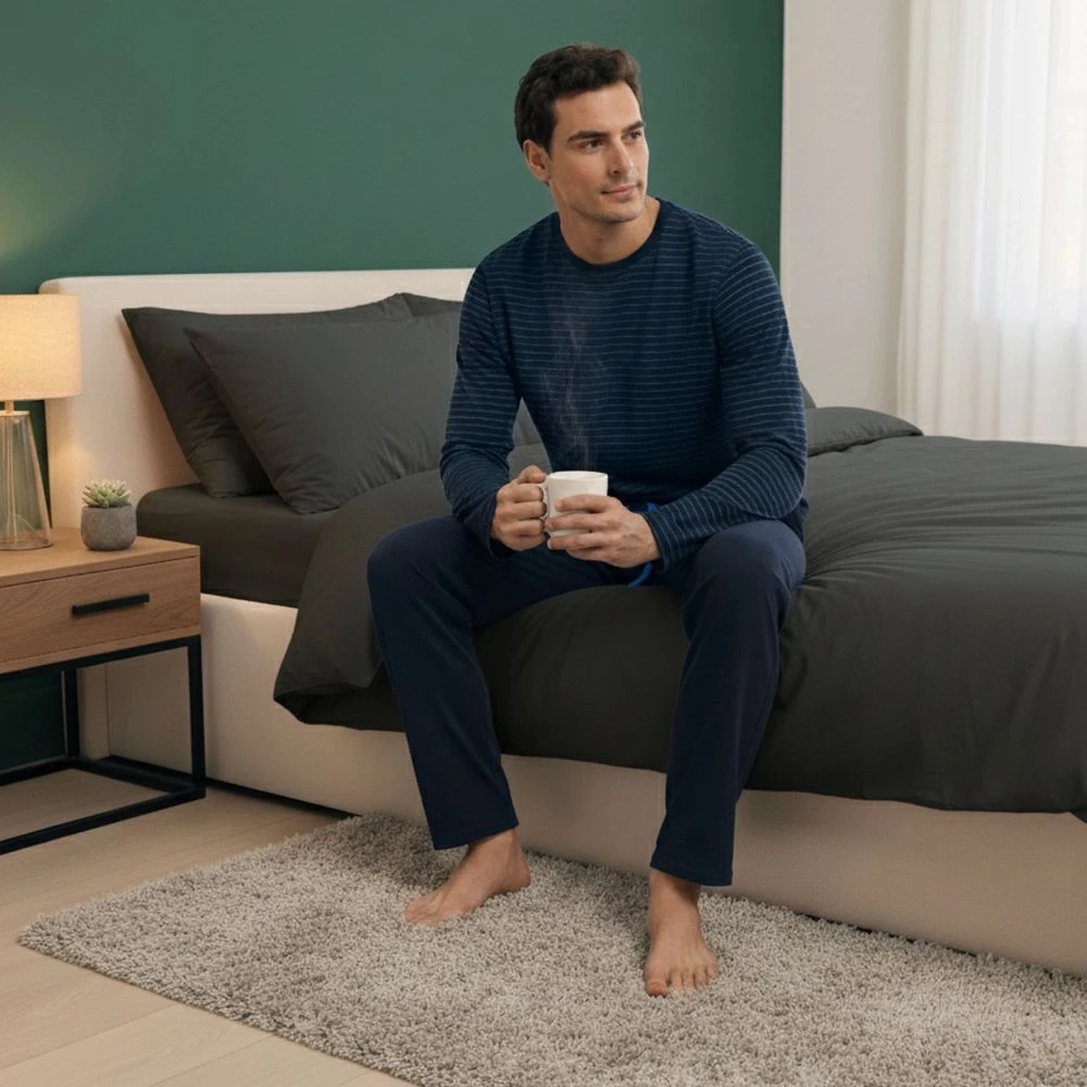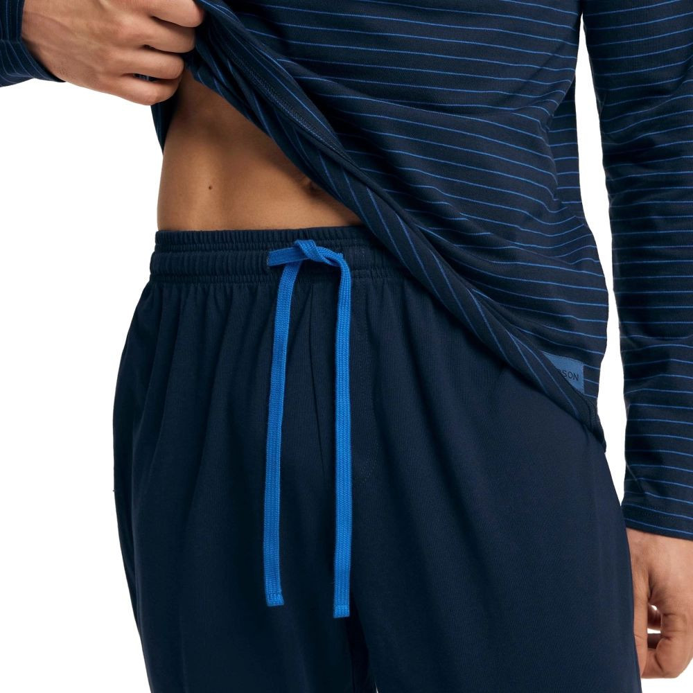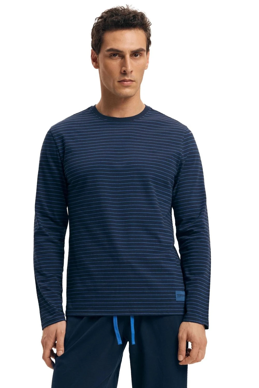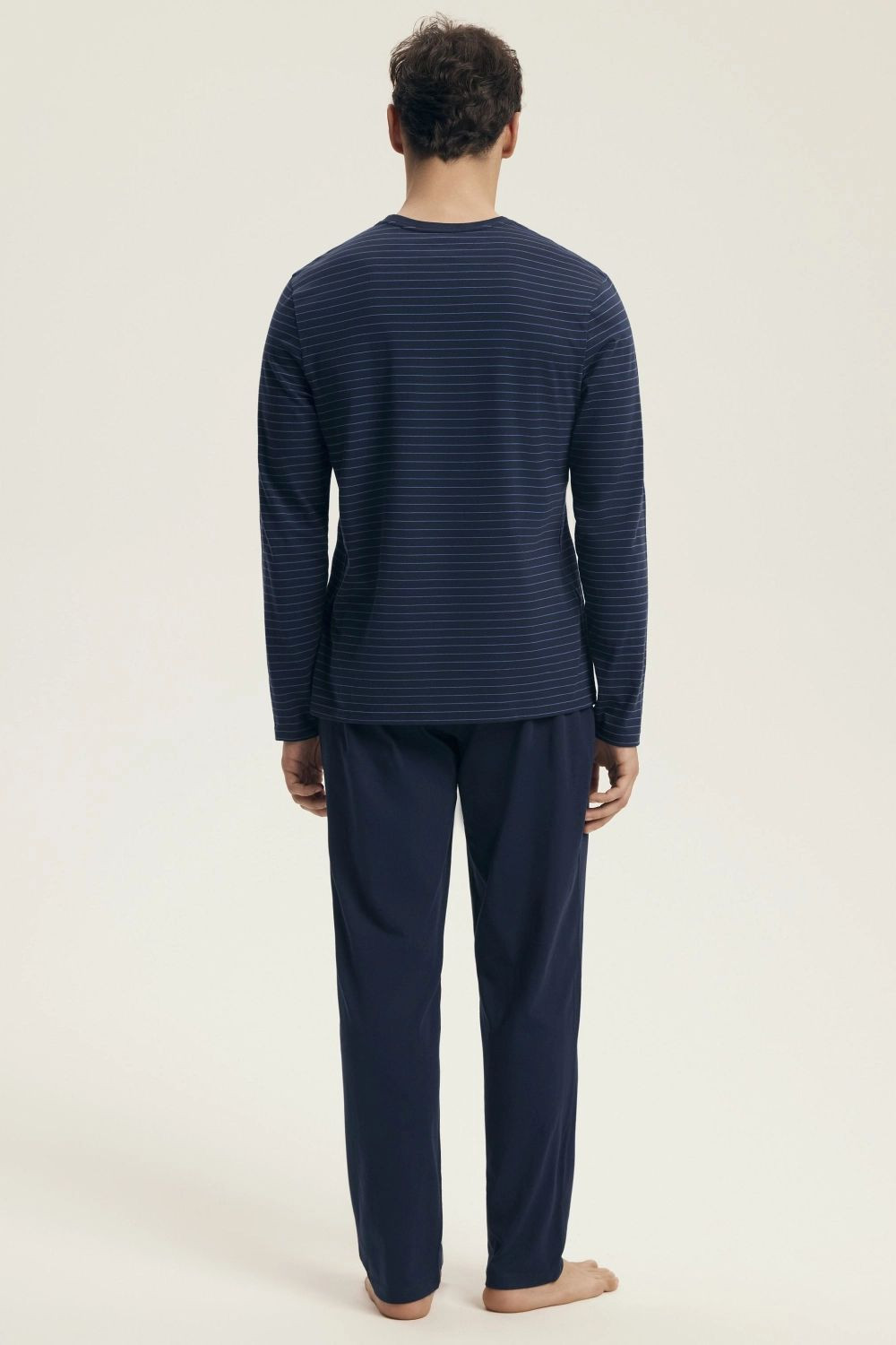 Pánské pyžamo 43455 New blue HENDERSON - z vysoce jakostní bavlny - šedé tričko s dlouhými rukávy - s pruhy - dlouhé jednobarevné kalhoty - elastický pas - zavazování na šňůrku
