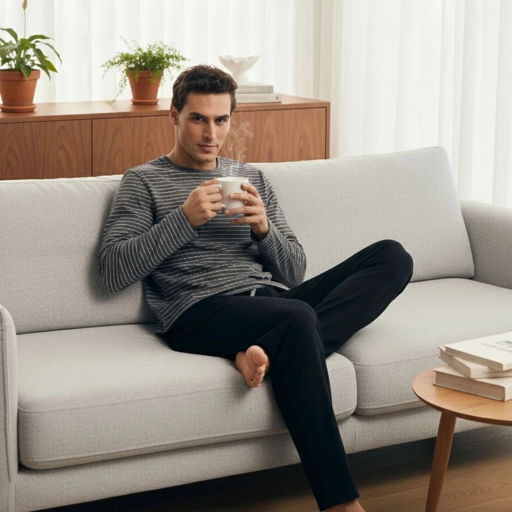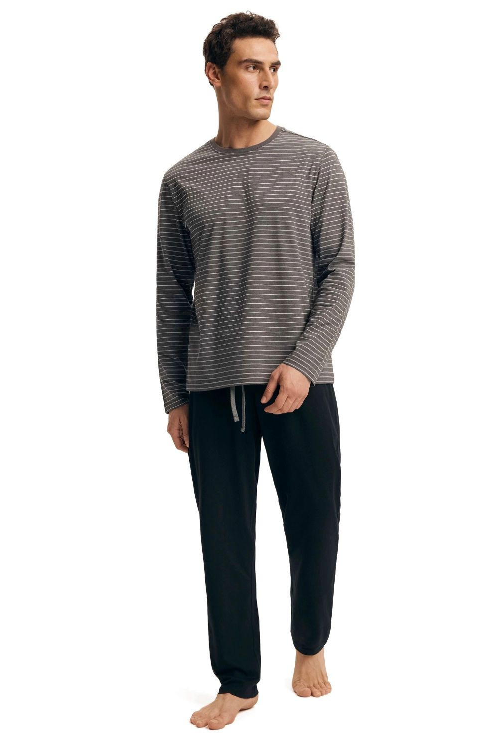 Pánské pyžamo 43455 New grey HENDERSON - z vysoce jakostní bavlny - šedé tričko s dlouhými rukávy - s pruhy - dlouhé jednobarevné kalhoty - elastický pas - zavazování na šňůrku