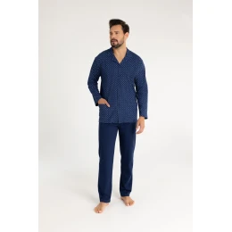 Piżama męska 486 J/25 marki Regina to klasyczny model o eleganckim, ponadczasowym charakterze. Górna część piżamy to rozpinana koszula z długim rękawem, kołnierzykiem oraz wzorem w kratę. Na wysokości bioder znajdują się praktyczne kieszenie, które zwiększają funkcjonalność piżamy. Do zestawu dołączone są jednolite spodnie z prostymi nogawkami, zapewniające komfort i swobodę ruchów. Całość wykonana została z wysokogatunkowej, 100% bawełny, która jest miękka, oddychająca i przyjazna dla skóry. To idealna piżama na chłodniejsze noce – stylowa, praktyczna i niezwykle wygodna.
