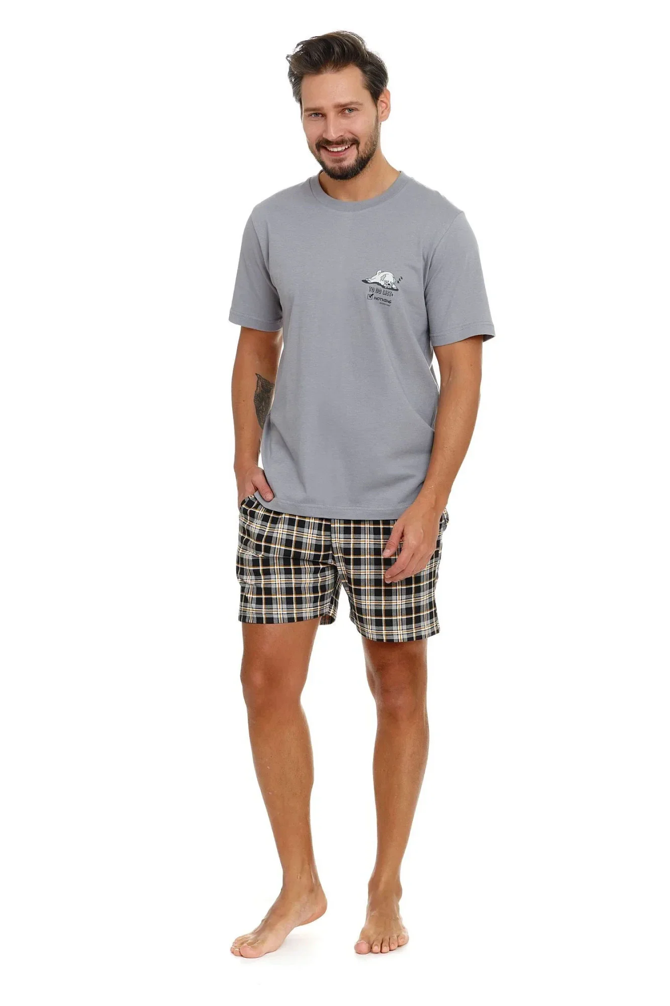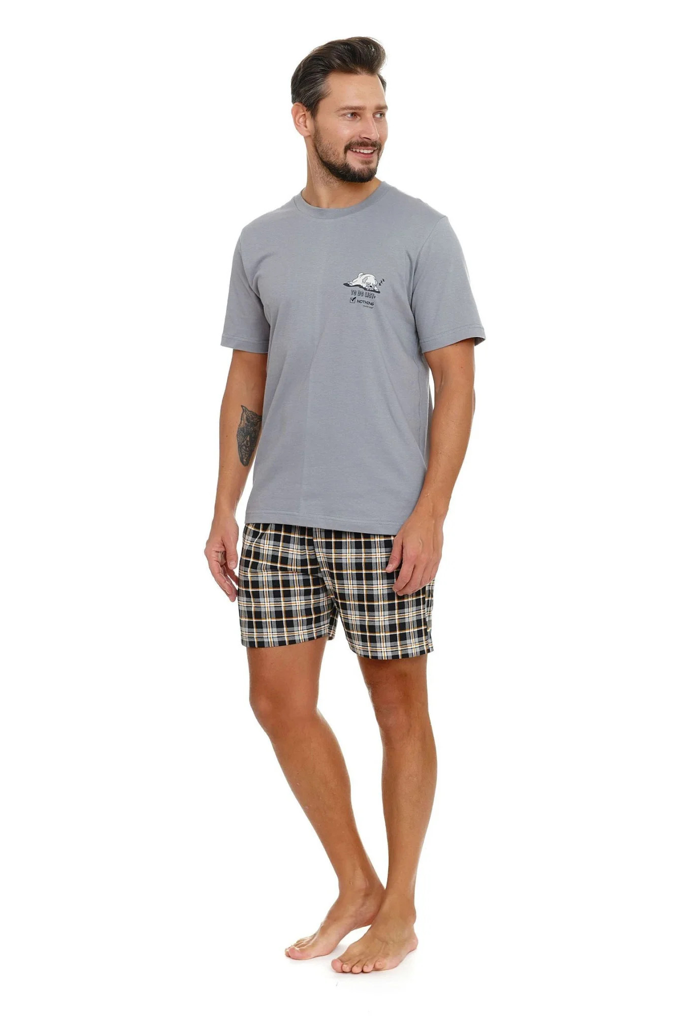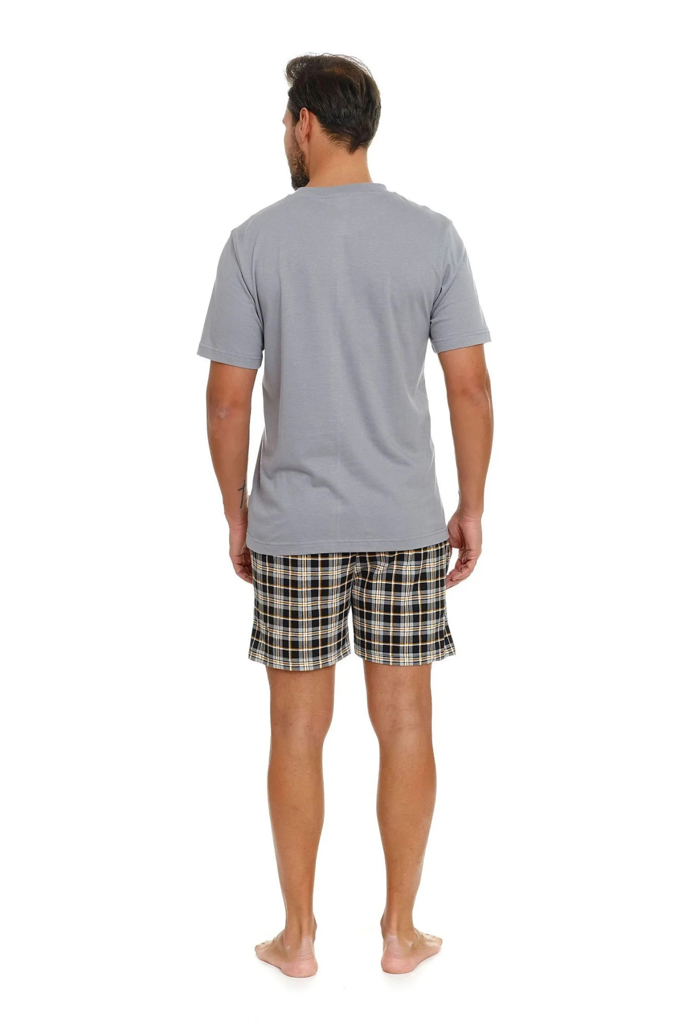 Pánské pyžamo 5153 Doctornap - z vysoce jakostní bavlny - šedé tričko s krátkými rukávy - zdobené potiskem na přední straně - kostkované kraťasy s kapsami - certifikát OEKO-TEX Standard 100