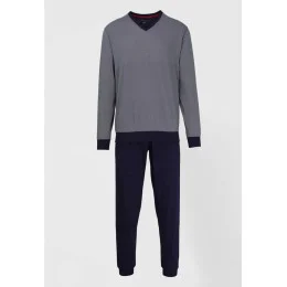 Pánské pyžamo značky Bugatti. Pyžamo má tmavě modré dlouhé kalhoty, tričko má výstřih do V a vzor.