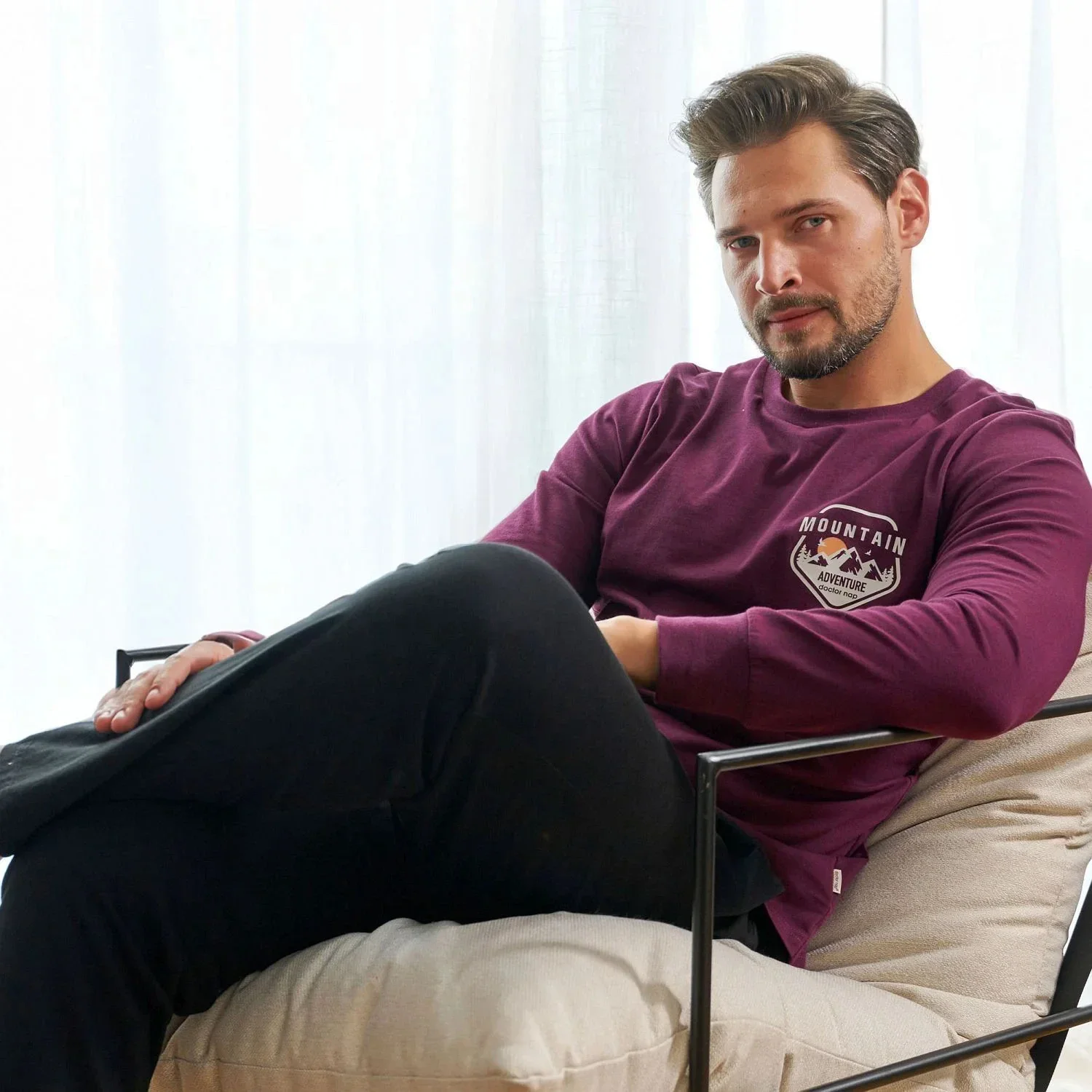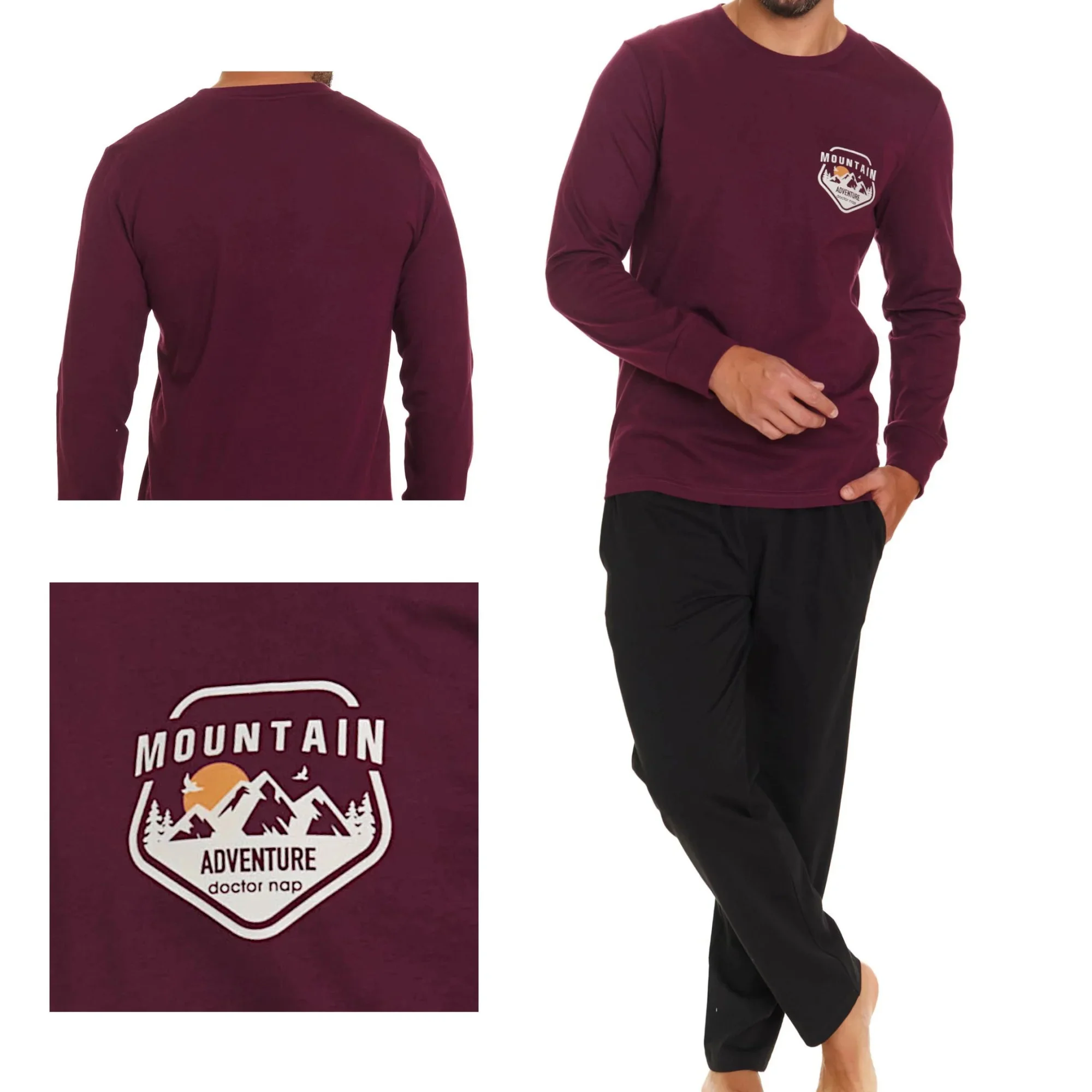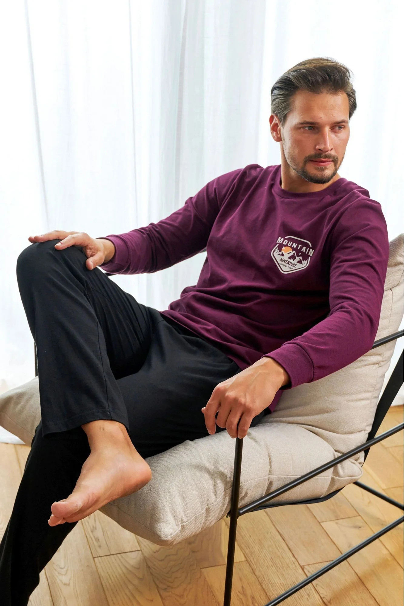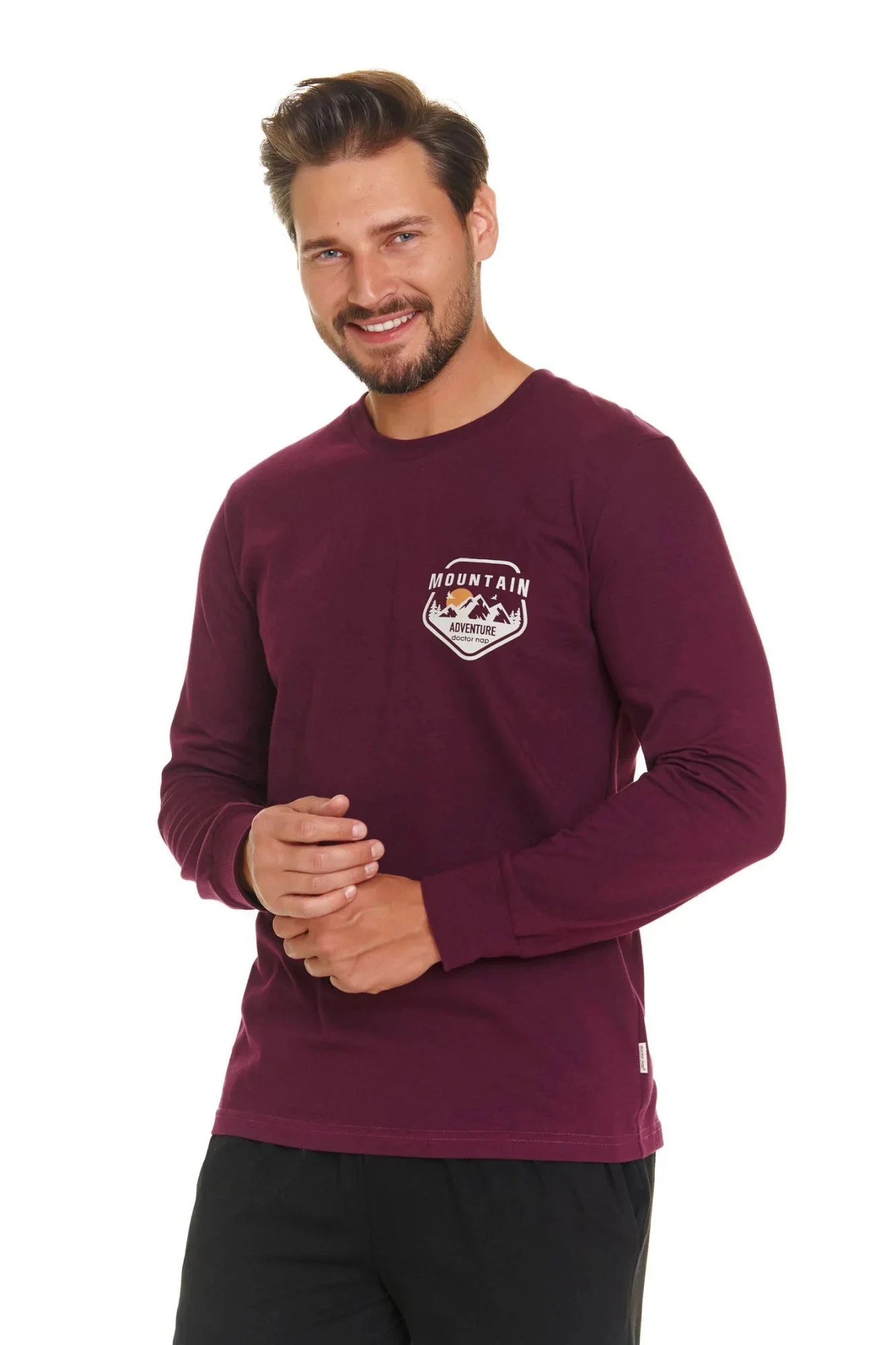 Pánské pyžamo 7139 wine plus Doctornap - z vysoce jakostní bavlny - vínové tričko s dlouhými rukávy - na přední straně potisk - dlouhé kalhoty černé barvy s kapsami - certifikát OEKO-TEX Standard 100