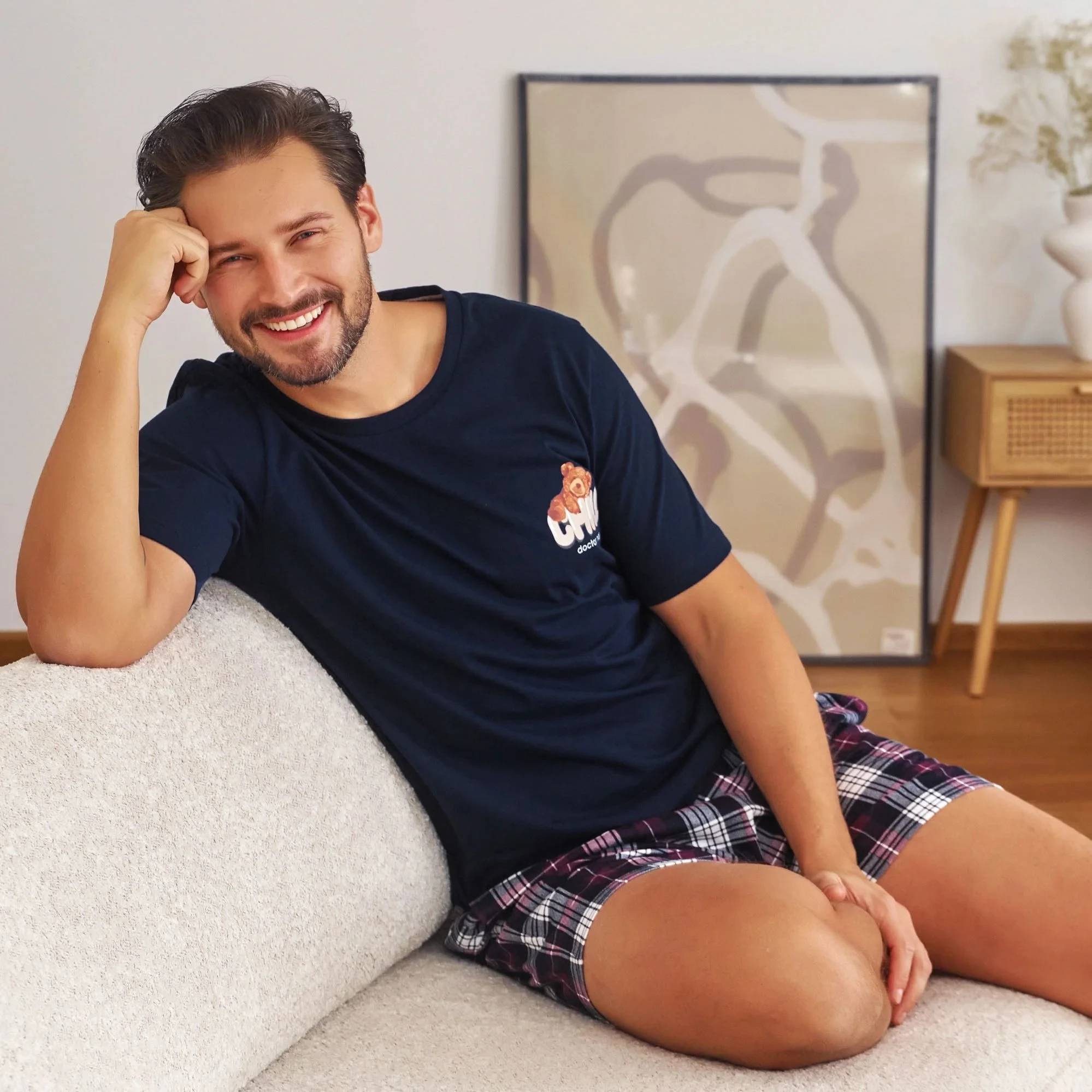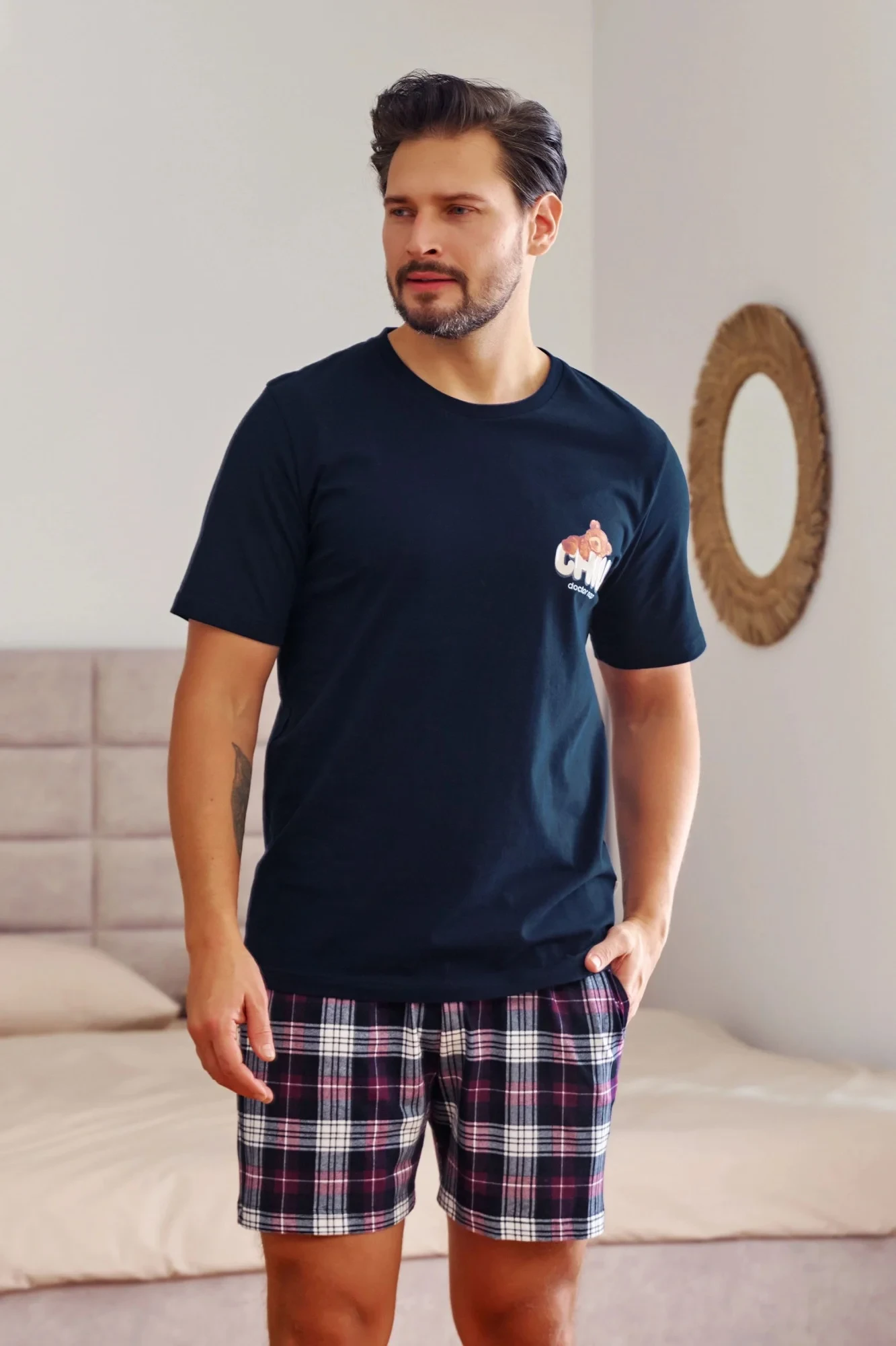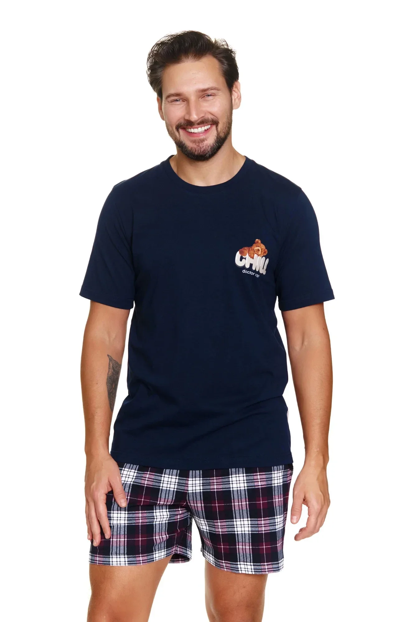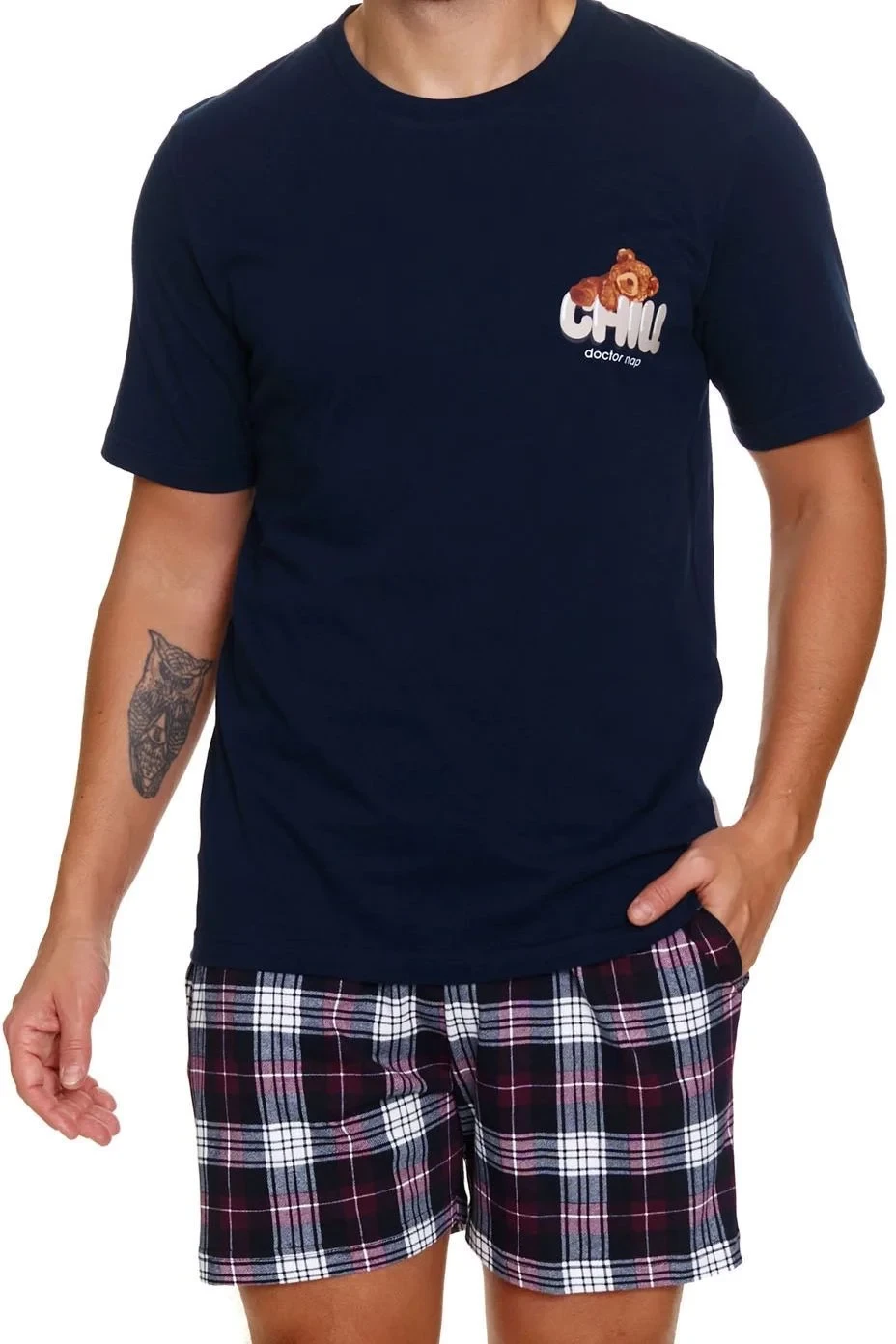 Pánské pyžamo 7201 blue Doctornap - z vysoce jakostní bavlny - tmavě modré tričko s krátkými rukávy - ozdobené potiskem na přední straně - kárované šortky s kapsami na bocích - certifikát OEKO-TEX Standard 100