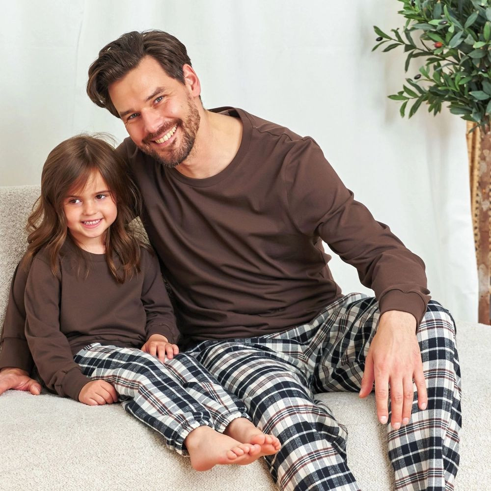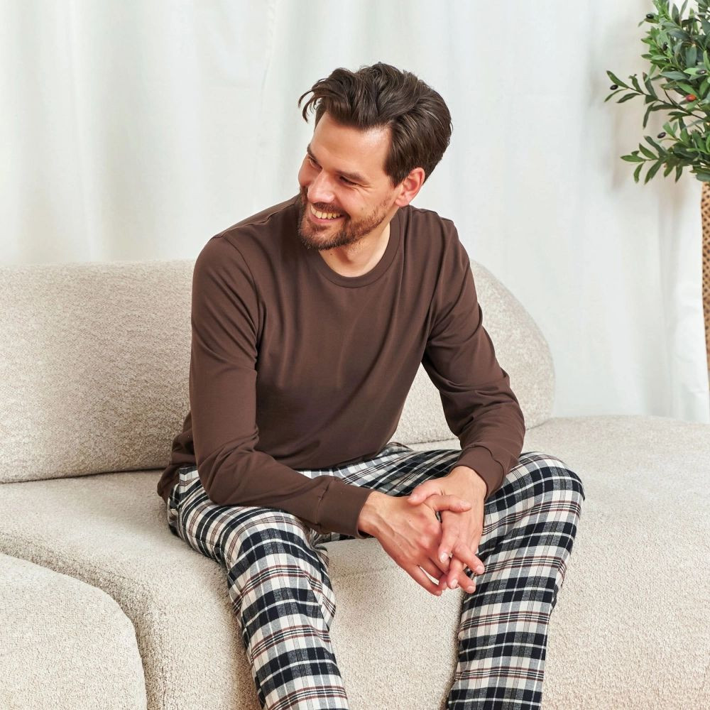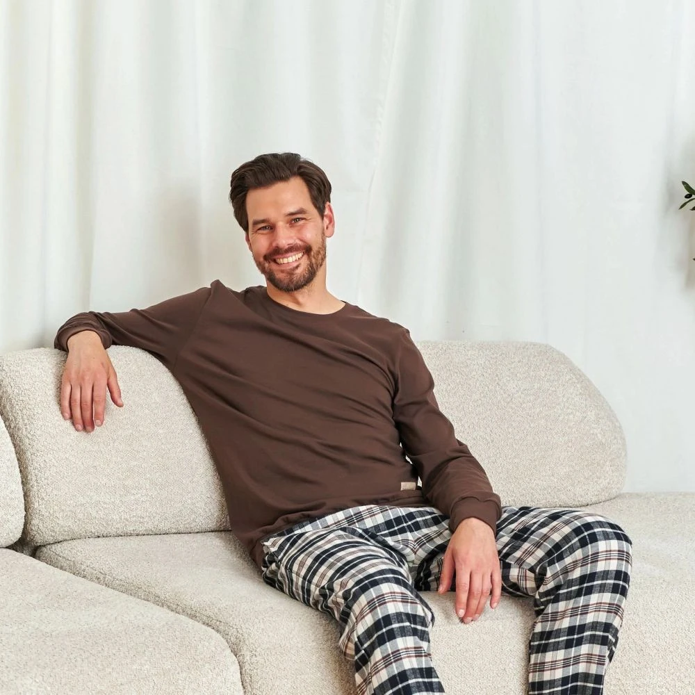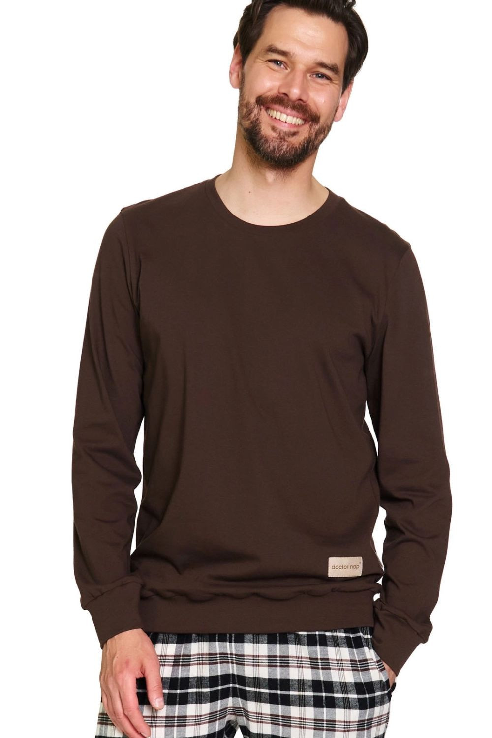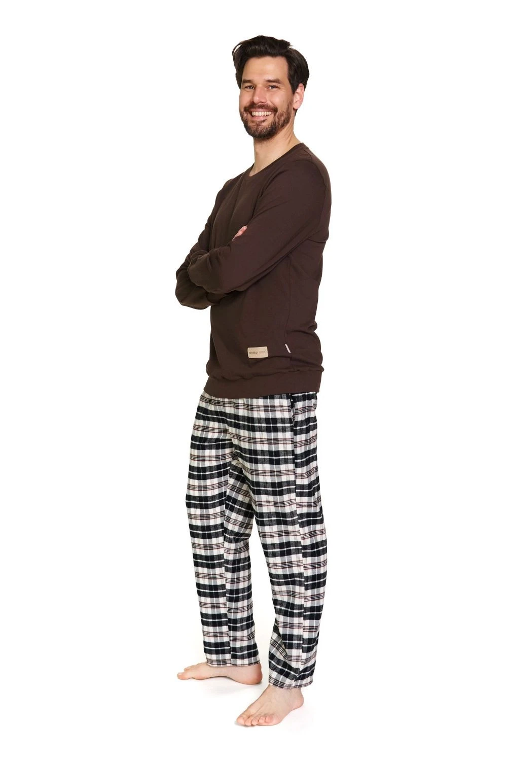 Pánské pyžamo 7334 Doctornap - z vysoce jakostní bavlny - hnědé tričko s dlouhými rukávy - dlouhé kárované flanelové kalhoty s kapsami - rukávy zakončené manžetami