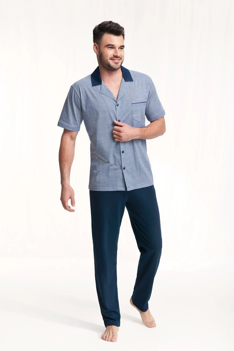 Pánské pyžamo z výjimečně měkké bavlny. Blůza s krátkými rukávy v jemné kostkované barvě, zapínání na knoflíky, s límečkem a kapsami. Dlouhé kalhoty, hladké.