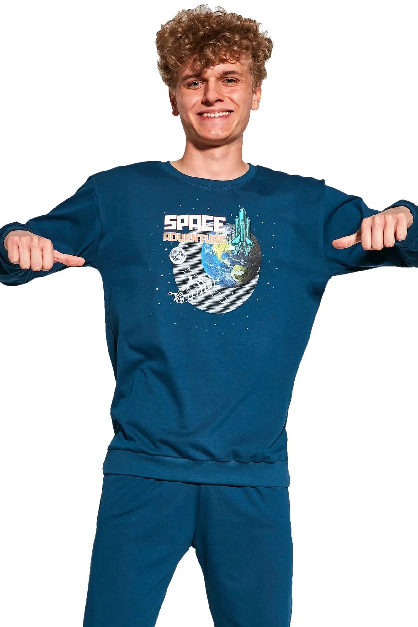 Pánské pyžamo 998/47 Space CORNETTE - tmavě modrá barva - vyrobené z vysoce kvalitní a měkké bavlny - tričko je tmavě modré barvy s dlouhými rukávy - zdobené barevným potiskem - dlouhé jednobarevné kalhoty mají pohodlnou gumu v paseMateriálové složení: 100% bavlna