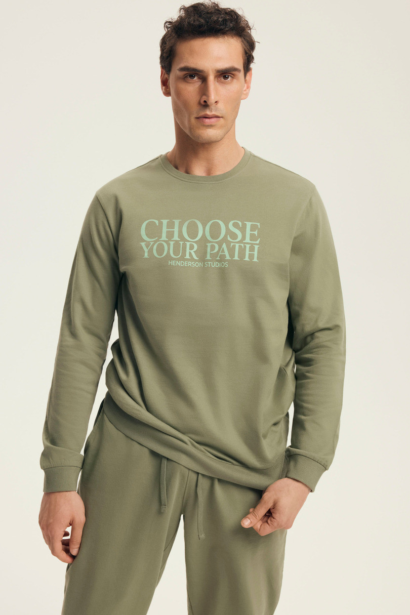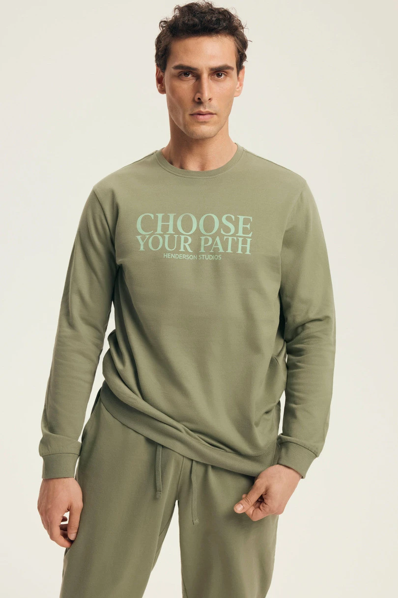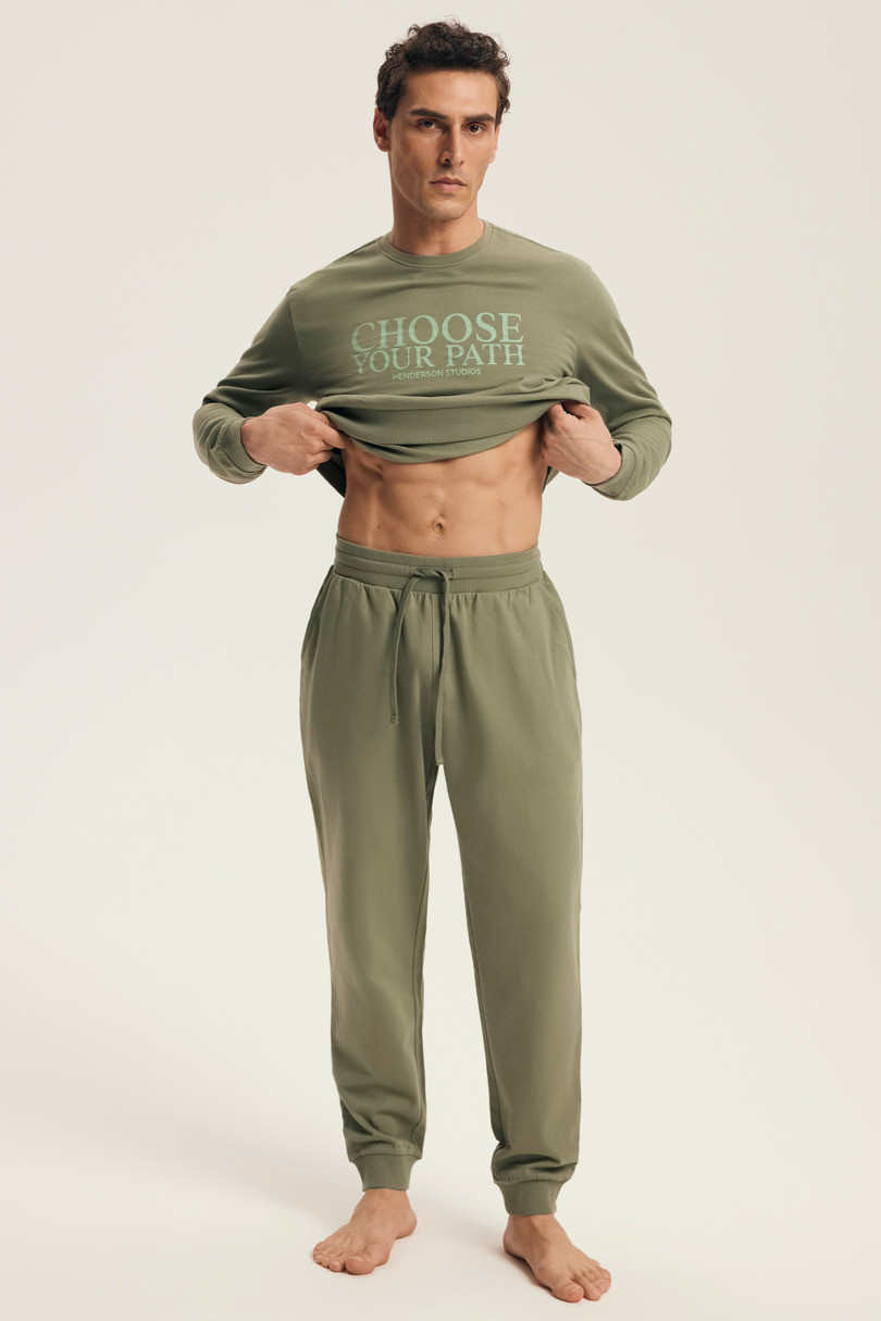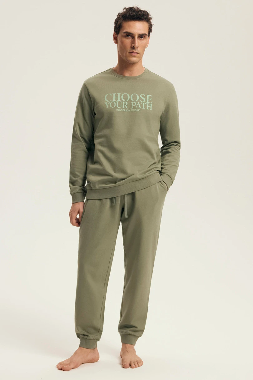 Piżama męska YOUR 43484 AW25 to idealne połączenie wygody, nowoczesnego stylu i naturalnych materiałów. Wykonana w 100% z wysokiej jakości bawełny, zapewnia oddychalność, miękkość i komfort przez całą noc. Bluzka z długim rękawem z napisem „CHOOSE YOUR PATH” oraz długie spodnie z elastycznym pasem i ściągaczami to nie tylko piżama, ale także doskonały strój do relaksu w domu. Klasyczny oliwkowy kolor i sportowy krój czynią ją uniwersalnym wyborem dla każdego mężczyzny.