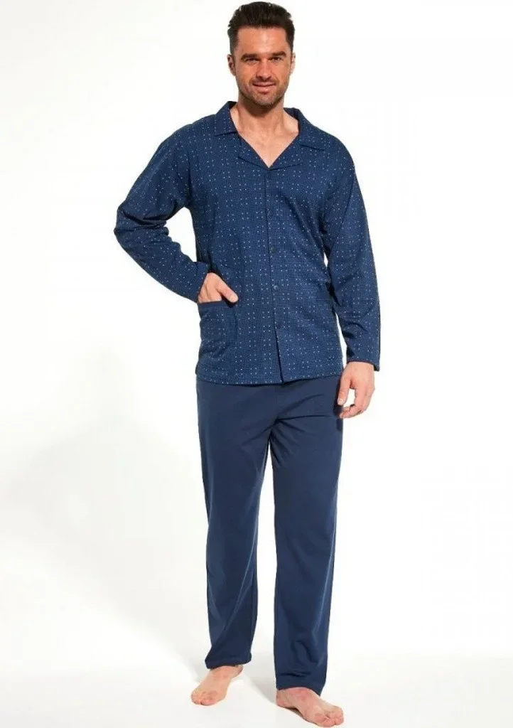 Pánské rozepínací pyžamo od značky Cornette, které je vyrobené z velmi kvalitní bavlny. Vzorovaný vrchní díl pyžama má límeček, kapsy a zapíná se knoflíky. Komplet doplňují dlouhé jednobarevné kalhoty bez úpletů. Vzor vrchního dílu je podle druhého obrázku.