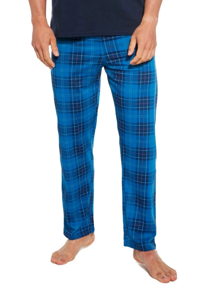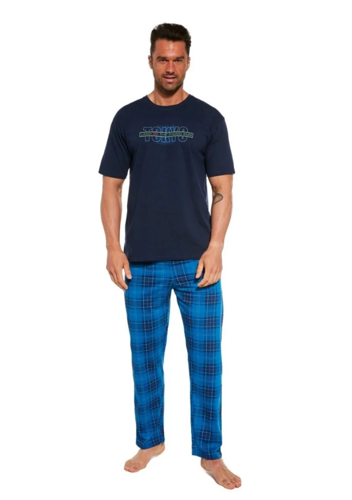 Pohodlné bavlněné pánské pyžamo s krátkým rukávem a dlouhými kalhoty od značky Cornette. Vrchní díl má kulatý výstřih a v přední části potisk. Pyžamo má kalhoty bez úpletů, v pase je všitá pohodlná guma.