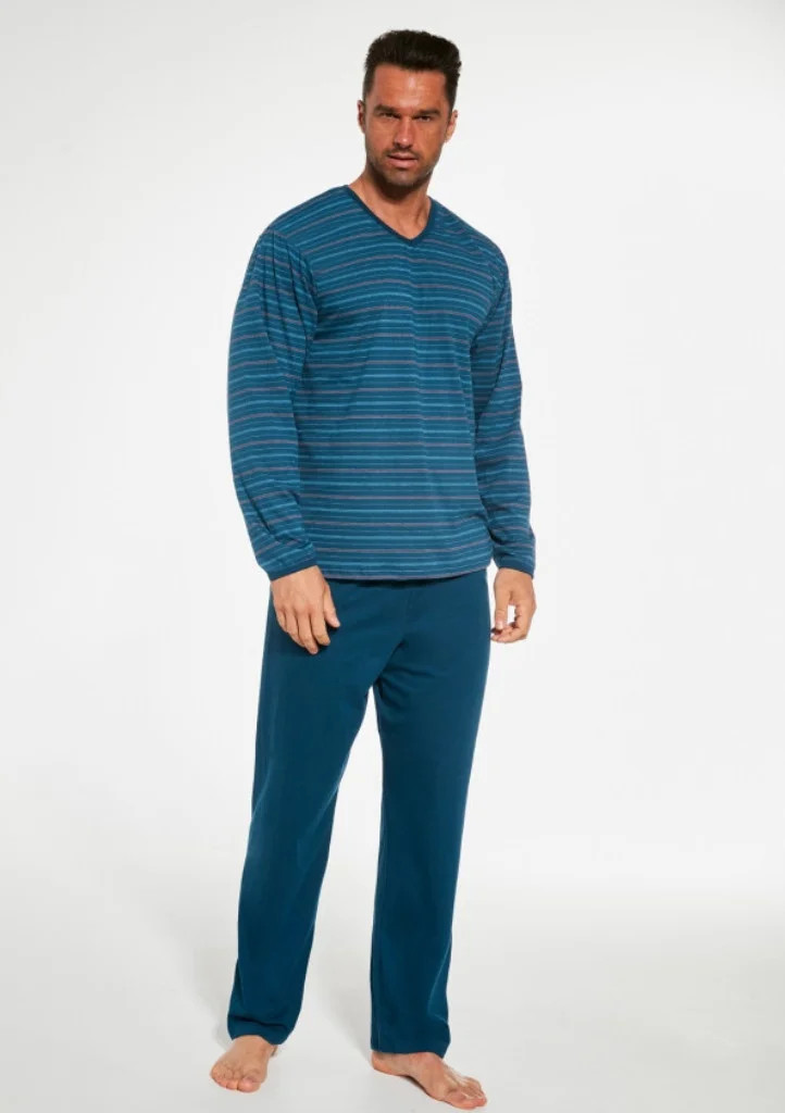 Pohodlné bavlněné pánské pyžamo s dlouhým rukávem a kalhoty od značky Cornette. Vrchní díl má na obou stranách potisk a má výstřih do V. Pyžamo má dlouhé kalhoty, bez úpletů. V pase je všitá pohodlná guma.