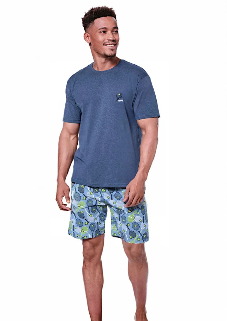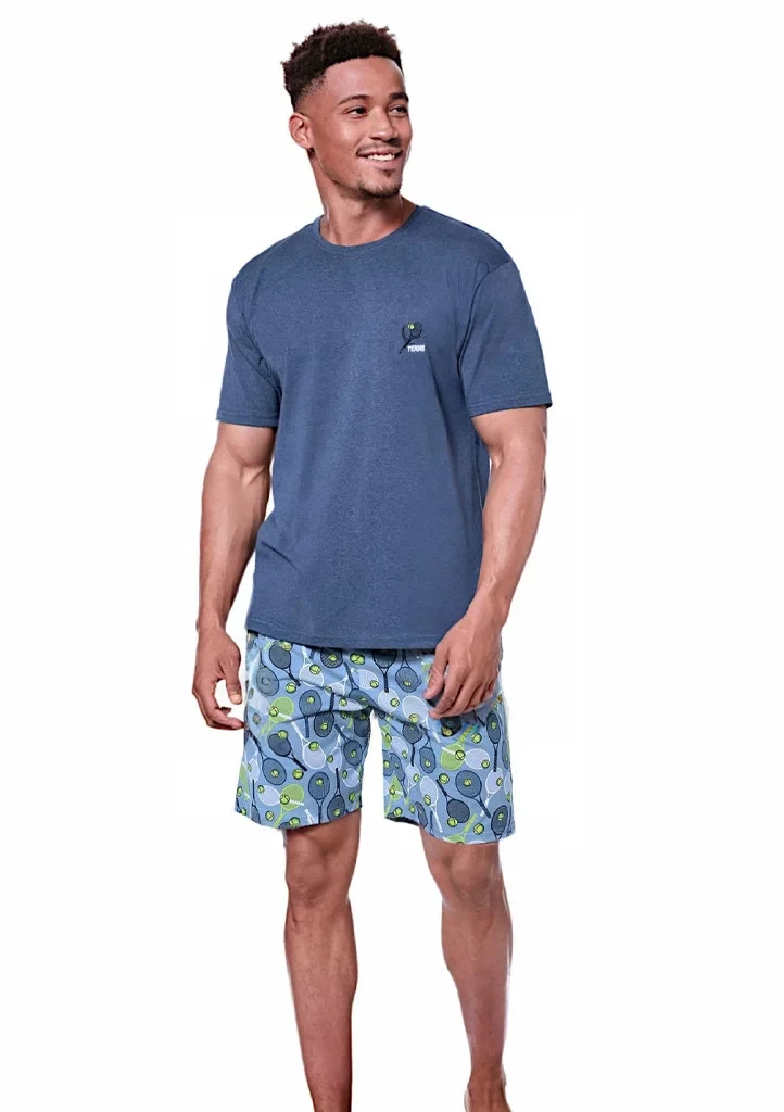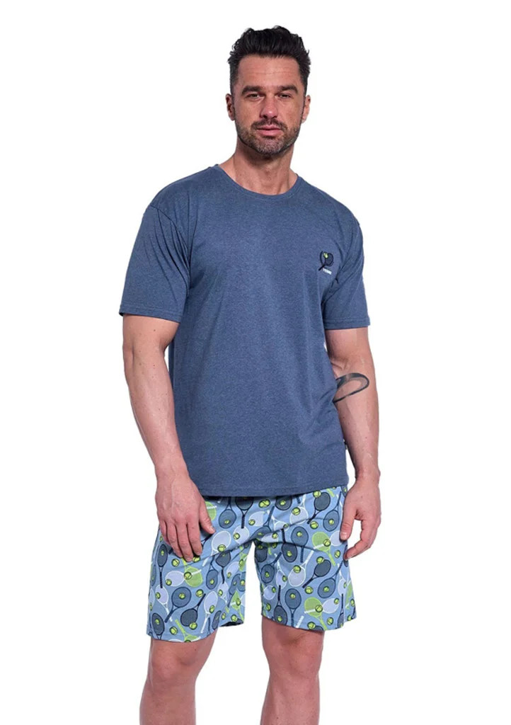 Pánské pyžamo CORNETTE je vyrobeno z vysoce kvalitní bavlny a nabízí maximální pohodlí během spánku i odpočinku. Součástí je džínově modré tričko s krátkými rukávy, půlkulatým výstřihem a stylovým potiskem na přední straně. Pyžamo doplňují pohodlné vzorované kraťasy, které ladí s celkovým sportovně-ležérním vzhledem.