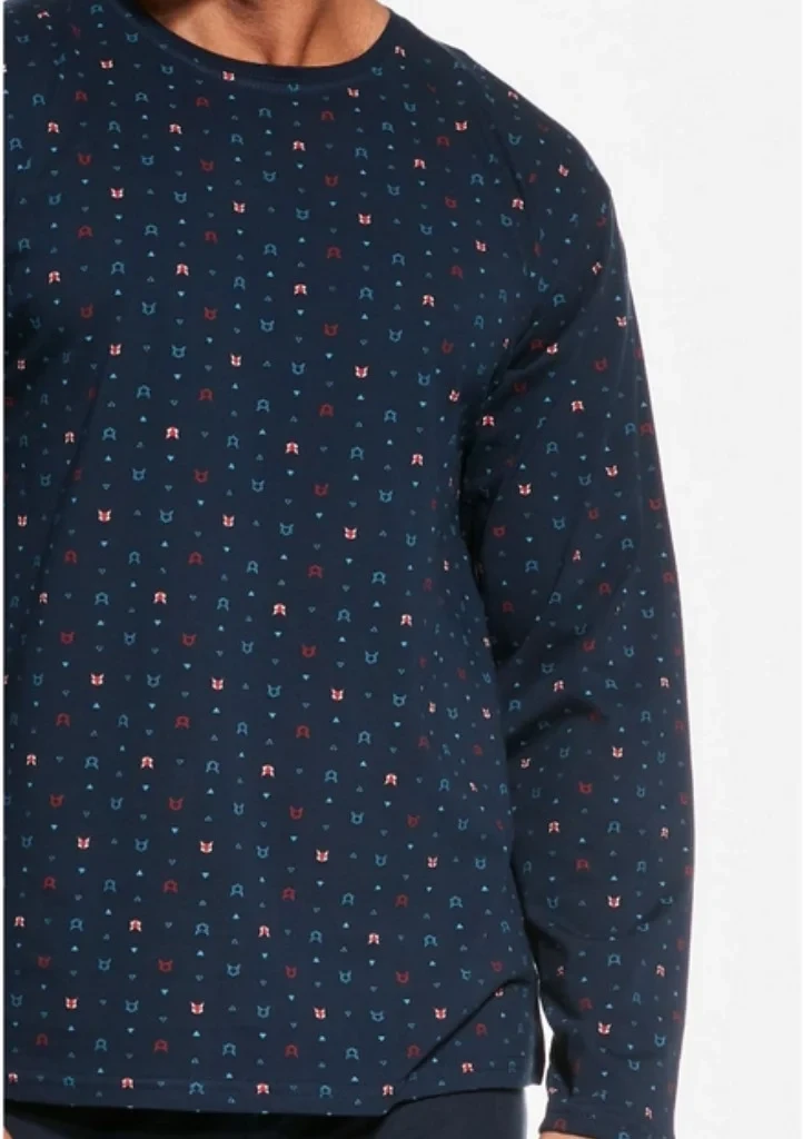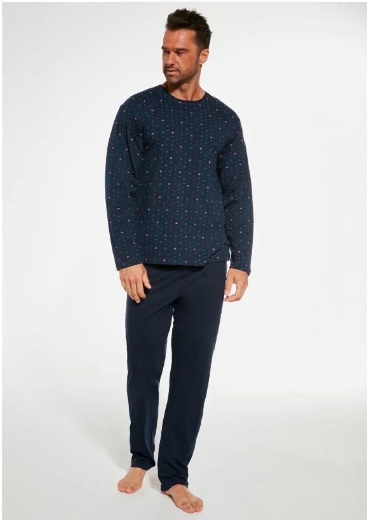 Pohodlné bavlněné pánské pyžamo s dlouhým rukávem a kalhoty od značky Cornette. Vrchní díl má na obou stranách potisk a má kulatý výstřih. Pyžamo má dlouhé kalhoty, bez úpletů. V pase je všitá pohodlná guma.