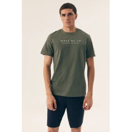 Piżama męska wykonana z bawełny koszulka z krótkim rękawem. Dekolt okrągły, z przodu nadruk. Spodenki z dzianiny o strukturze "wafla". W pasie guma i sznurek do regulacji obwodu pasa.