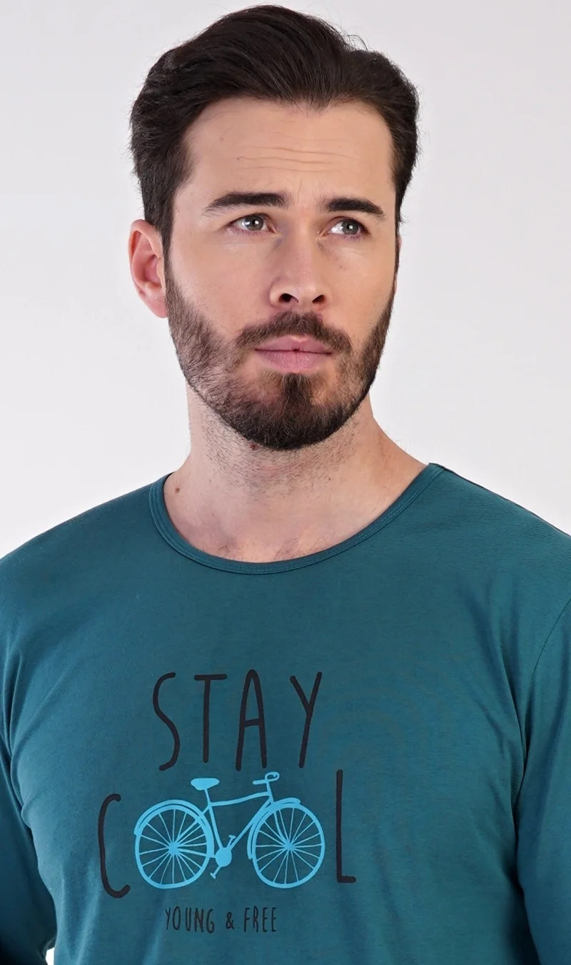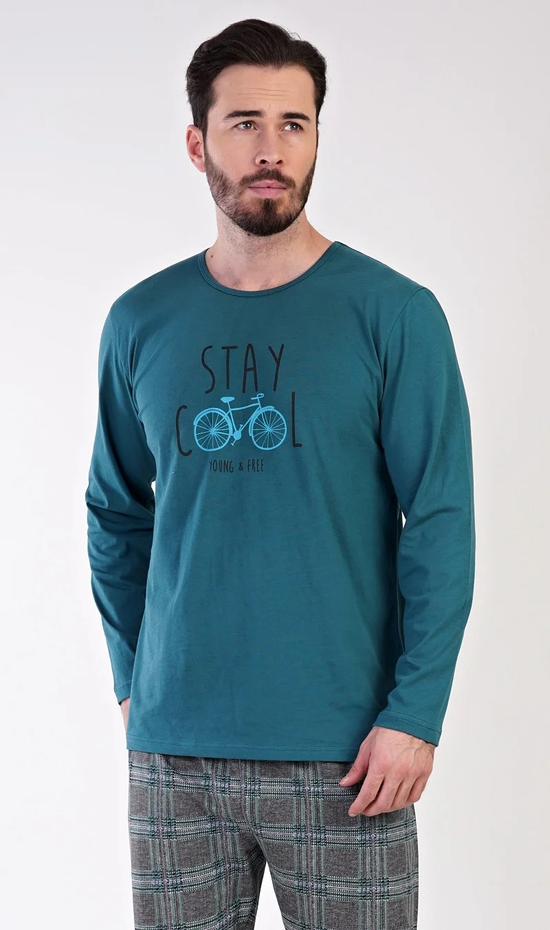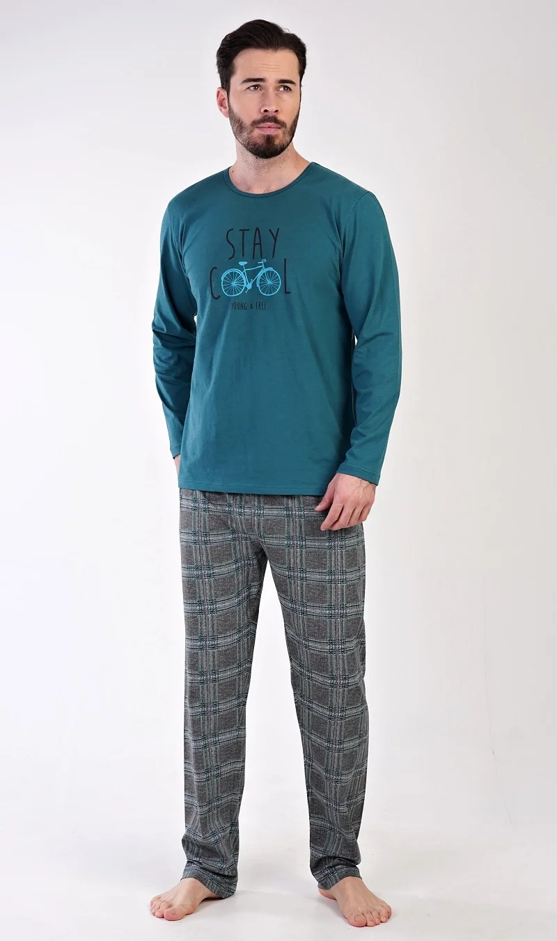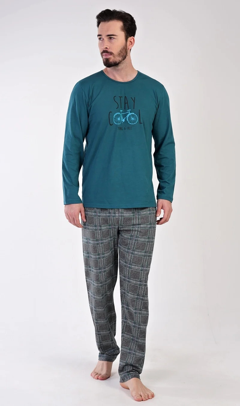 Pánské bavlněné pyžamo dlouhé Adam. Pánské pyžamo se skládá z trika s dlouhým rukávem a dlouhých kalhot. Jednobarevné triko s kulatým výstřihem je zdobeno obrázkem kola a nápisem 'Stay cool, young and free'. Kostkované kalhoty mají v pase gumu a šňůrku na stažení. Nemají kapsy. Použitý materiál je příjemný a poddajný na dotek. Podíl bavlny u kalhot i trika je 100%.