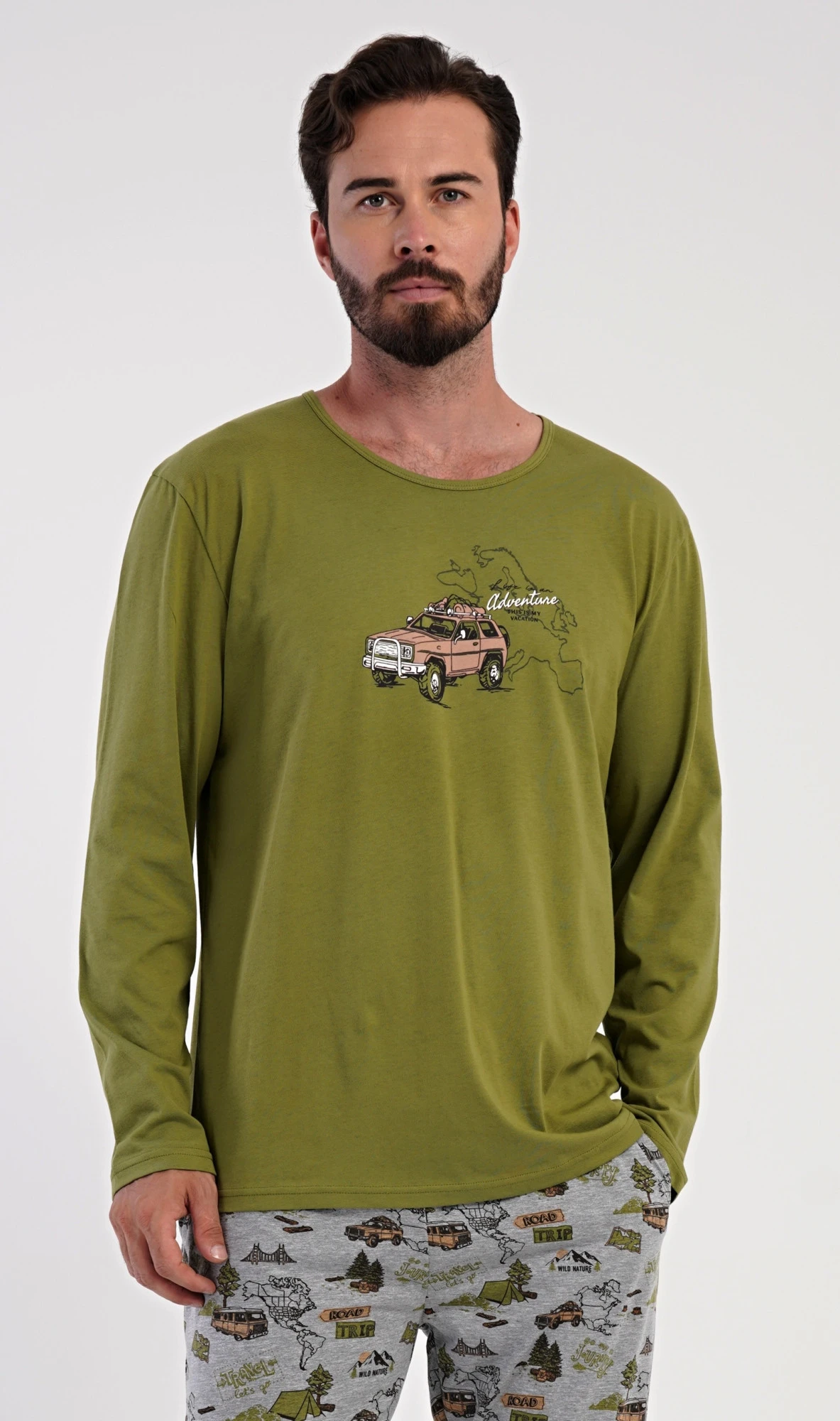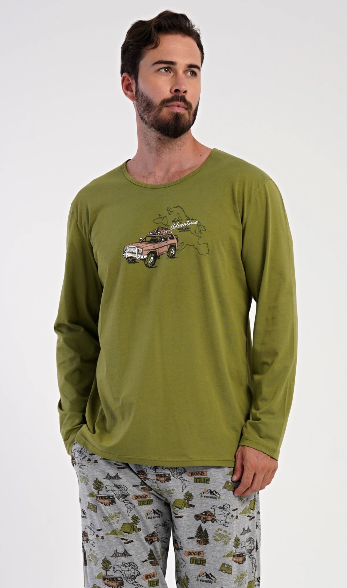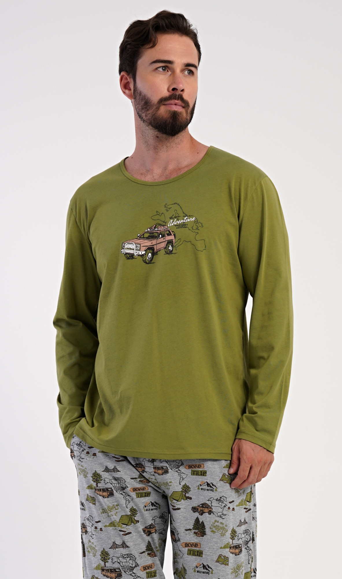 Pánské dlouhé pyžamo Adventure. Pánské pyžamo se skládá z trika s dlouhým rukávem a dlouhých kalhot. Triko je jednobarevné, zdobené na hrudi obrázkem terénního auta. Kalhoty mají v pase gumu, šňůrku na stažení a praktické kapsy. Použitý materiál je příjemný a poddaný na dotek. Obsah bavlny u trika je 100% a u kalhot 70%.