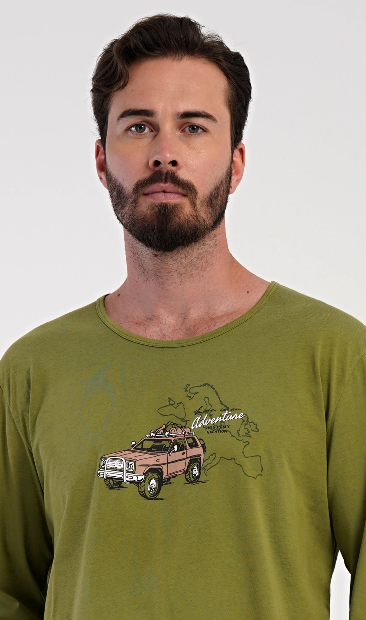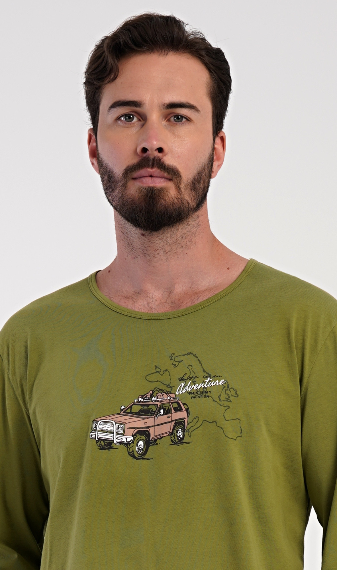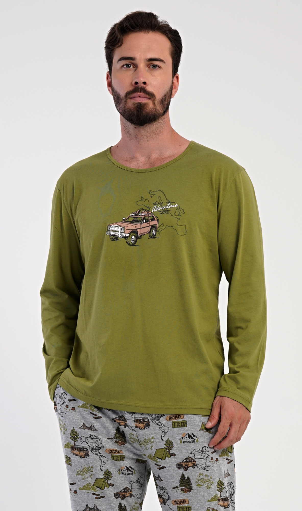 Pánské dlouhé pyžamo Adventure. Pánské pyžamo se skládá z trika s dlouhým rukávem a dlouhých kalhot. Triko je jednobarevné, zdobené na hrudi obrázkem terénního auta. Kalhoty mají v pase gumu, šňůrku na stažení a praktické kapsy. Použitý materiál je příjemný a poddaný na dotek. Obsah bavlny u trika je 100% a u kalhot 70%.