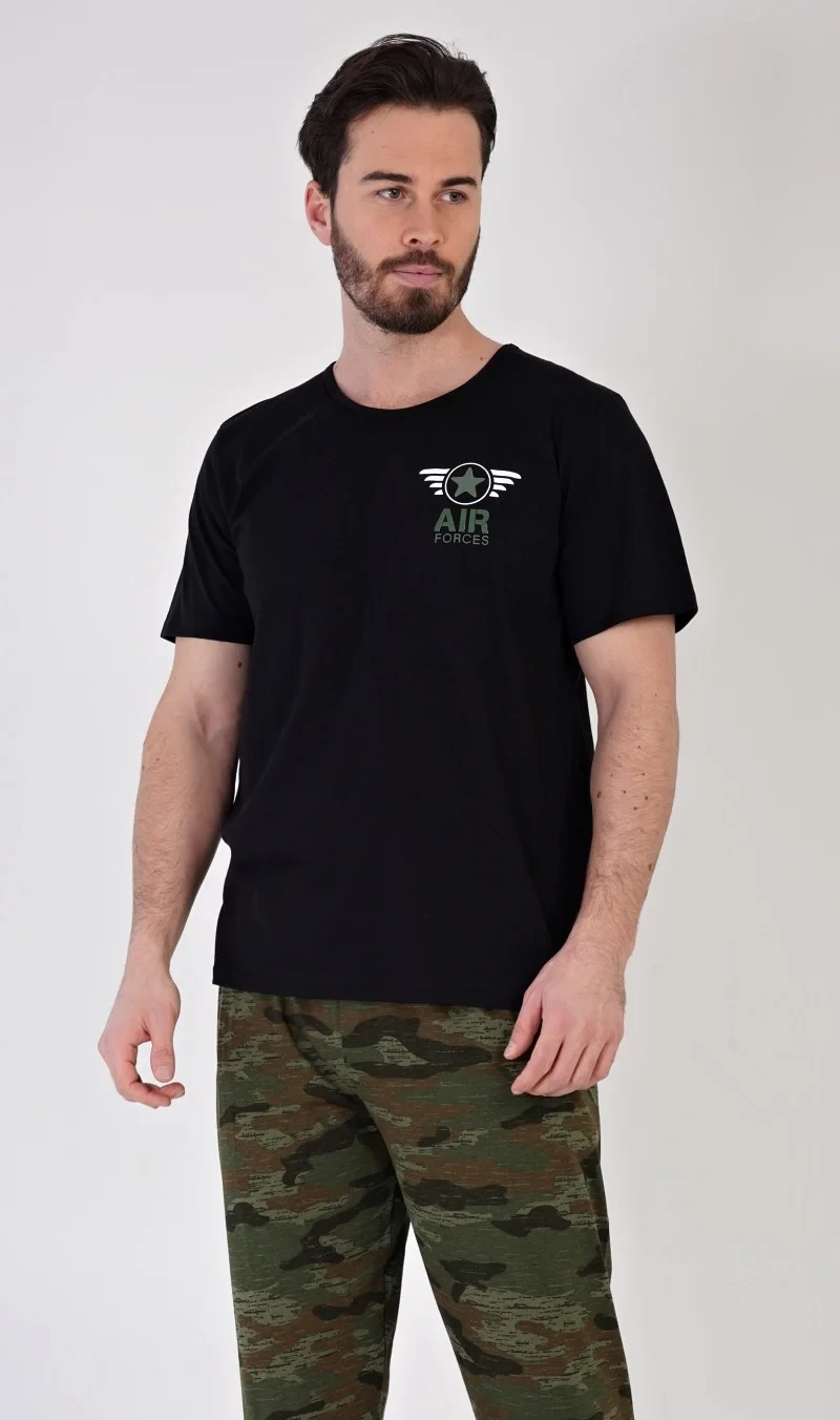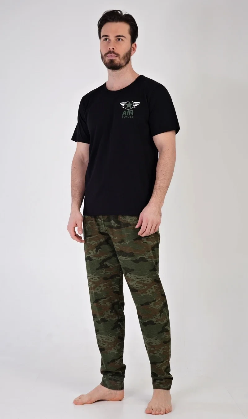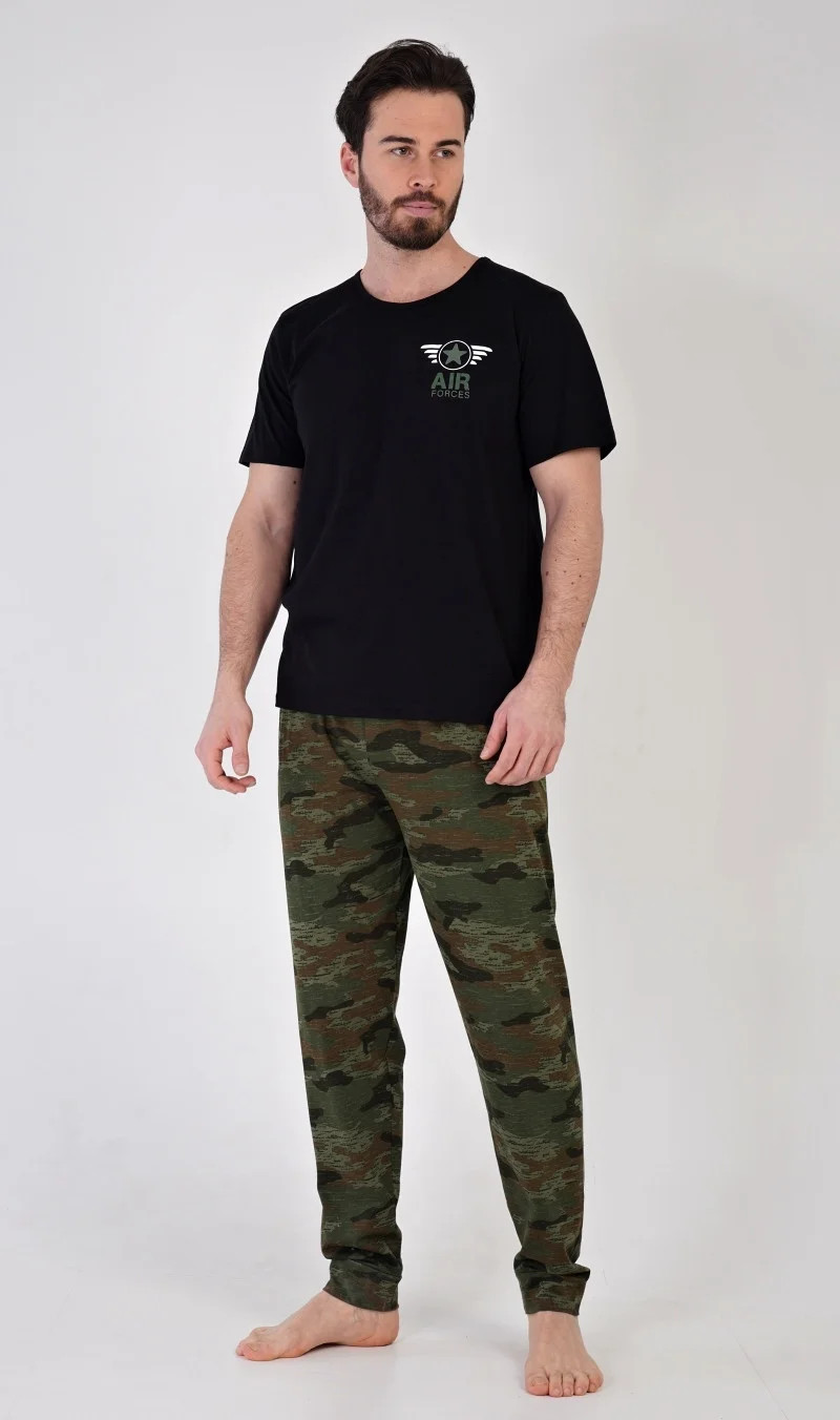 Pánské bavlněné pyžamo dlouhé s krátkým rukávem Air forces. Pánské pyžamo se skládá z trička s krátkým rukávem a dlouhých kalhot. Černé tričko s kulatým výstřihem zdobí menší nápis. Kalhoty s army potiskem mají v pase gumu a šňůrku na stažení, nohavice jsou zakončeny patenty. Kalhoty nemají kapsy. Použitý materiál s obsahem bavlny 100% je příjemný a poddajný na dotek.