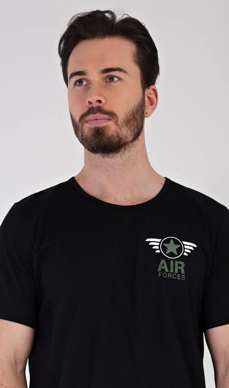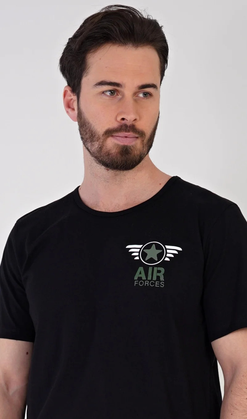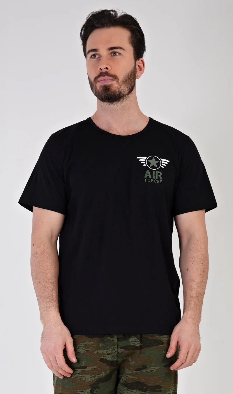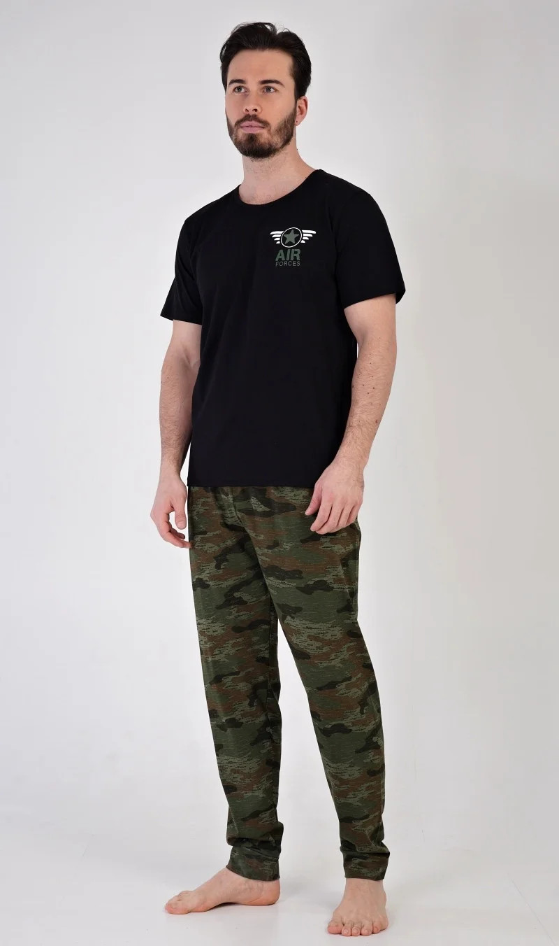 Pánské bavlněné pyžamo dlouhé s krátkým rukávem Air forces. Pánské pyžamo se skládá z trička s krátkým rukávem a dlouhých kalhot. Černé tričko s kulatým výstřihem zdobí menší nápis. Kalhoty s army potiskem mají v pase gumu a šňůrku na stažení, nohavice jsou zakončeny patenty. Kalhoty nemají kapsy. Použitý materiál s obsahem bavlny 100% je příjemný a poddajný na dotek.