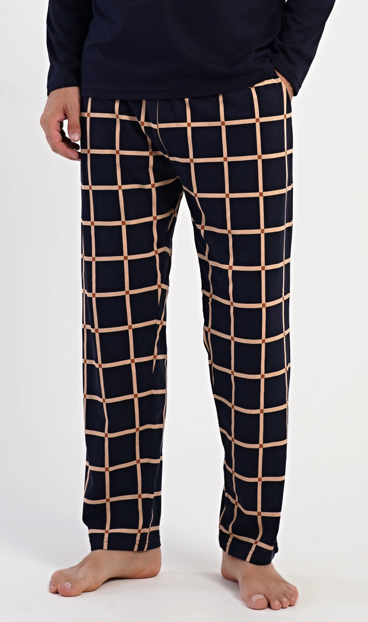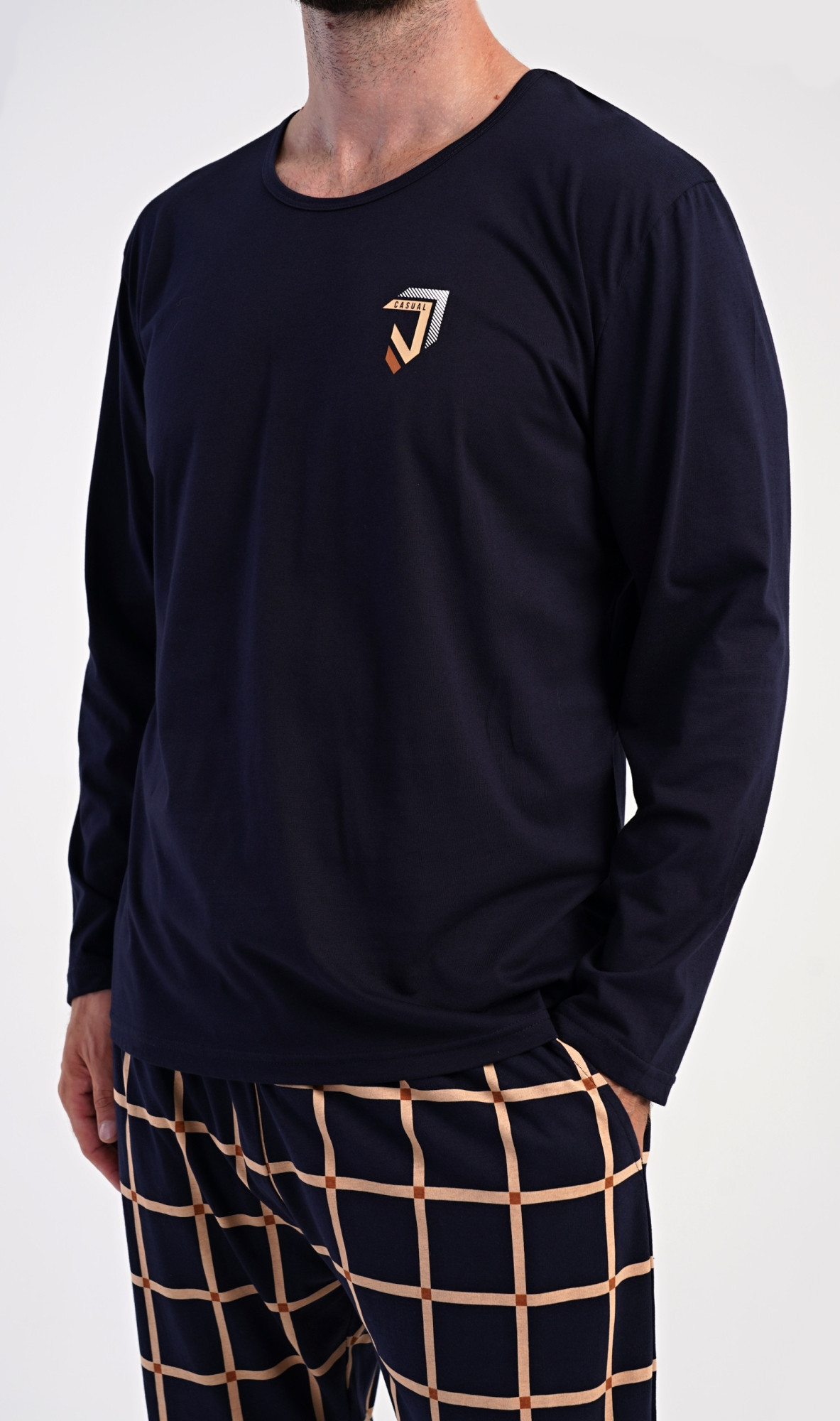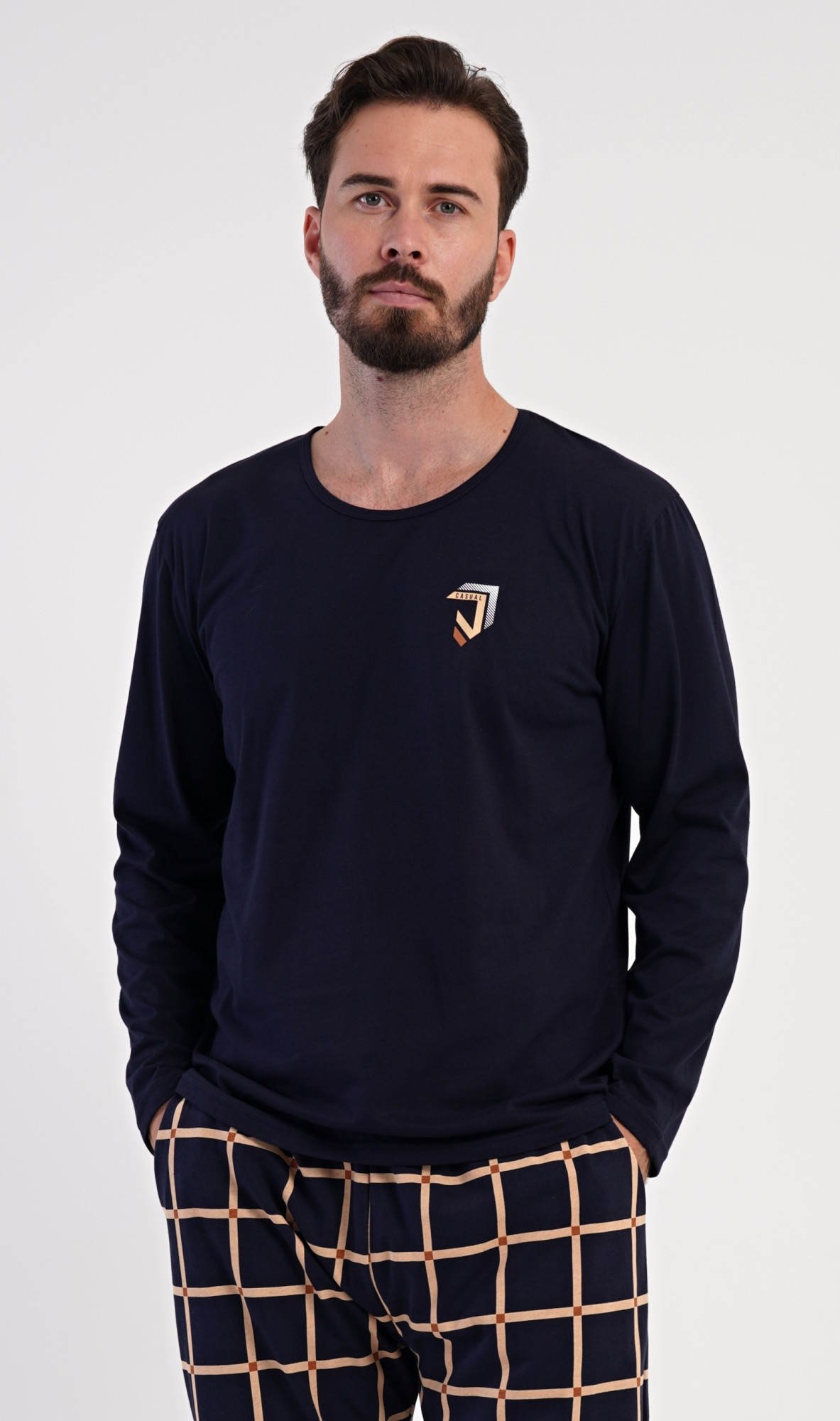 Pánské dlouhé bavlněné pyžamo Alfréd. Pánské pyžamo se skládá z trika s dlouhým rukávem a dlouhých kalhot. Triko je jednobarevné, zdobené na hrudi drobným obrázkem. Kostkované kalhoty mají v pase gumu, šňůrku na stažení a praktické kapsy. Použitý materiál s obsahem bavlny 100% je poddajný a příjemný na dotek.