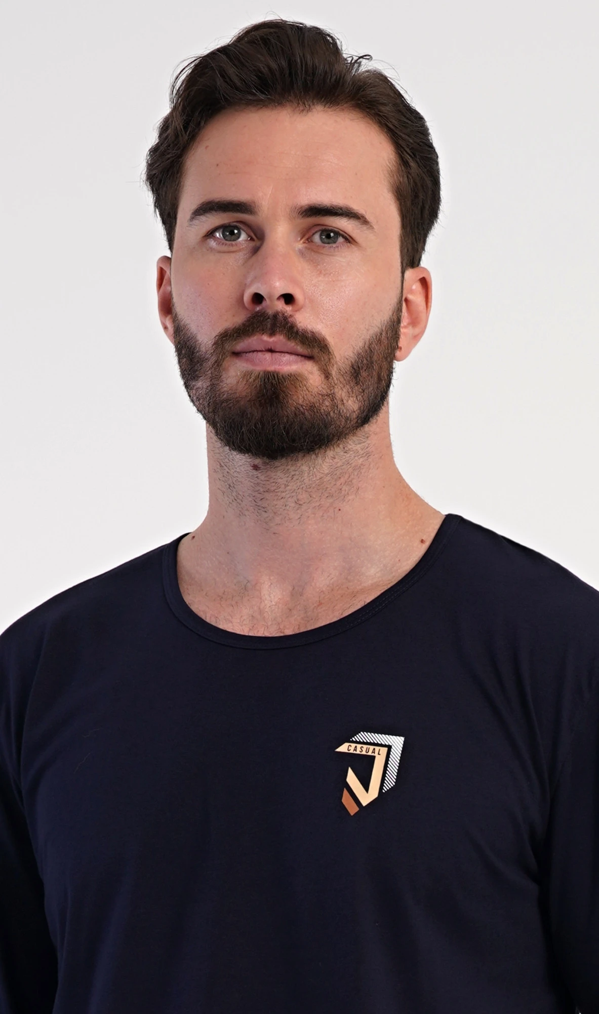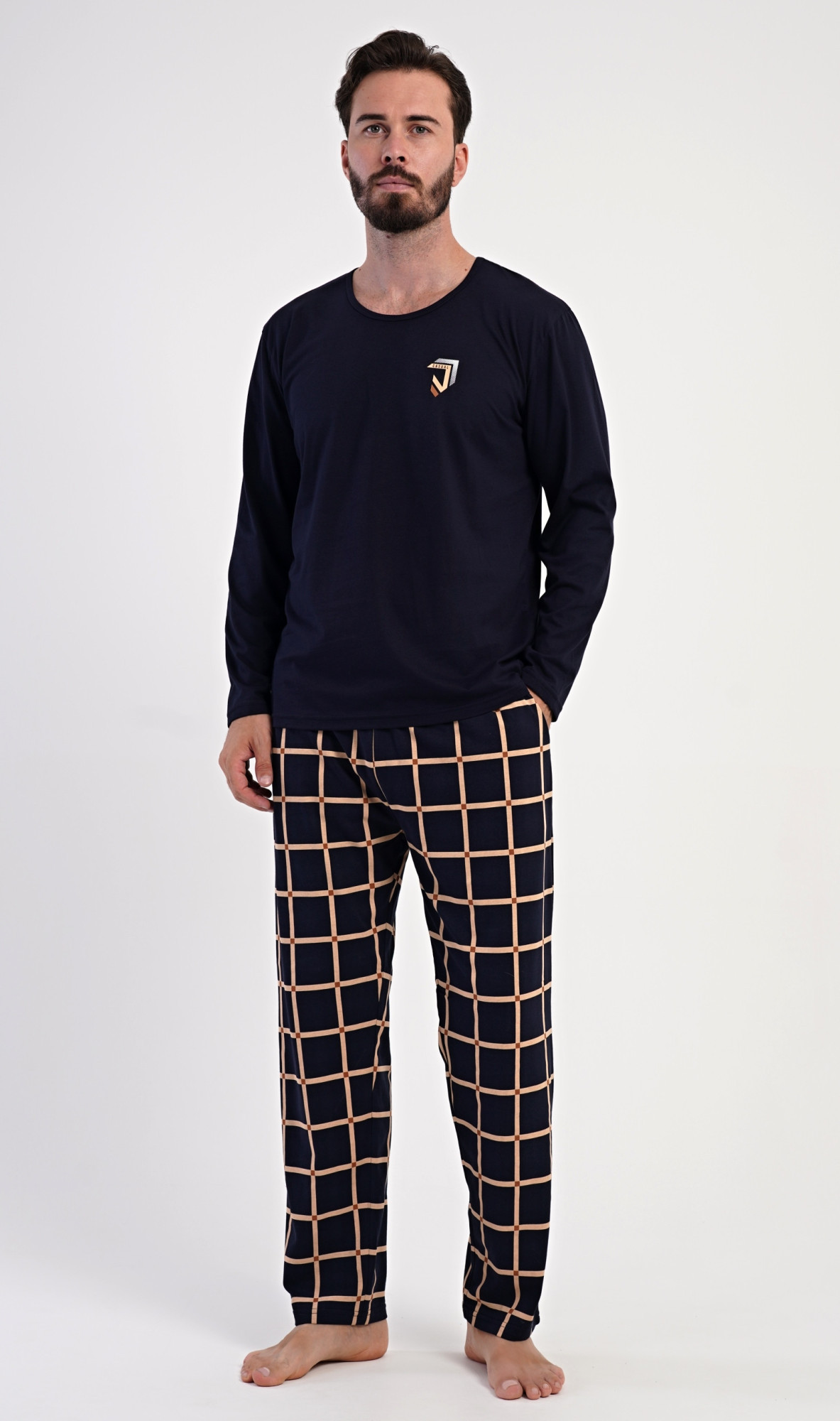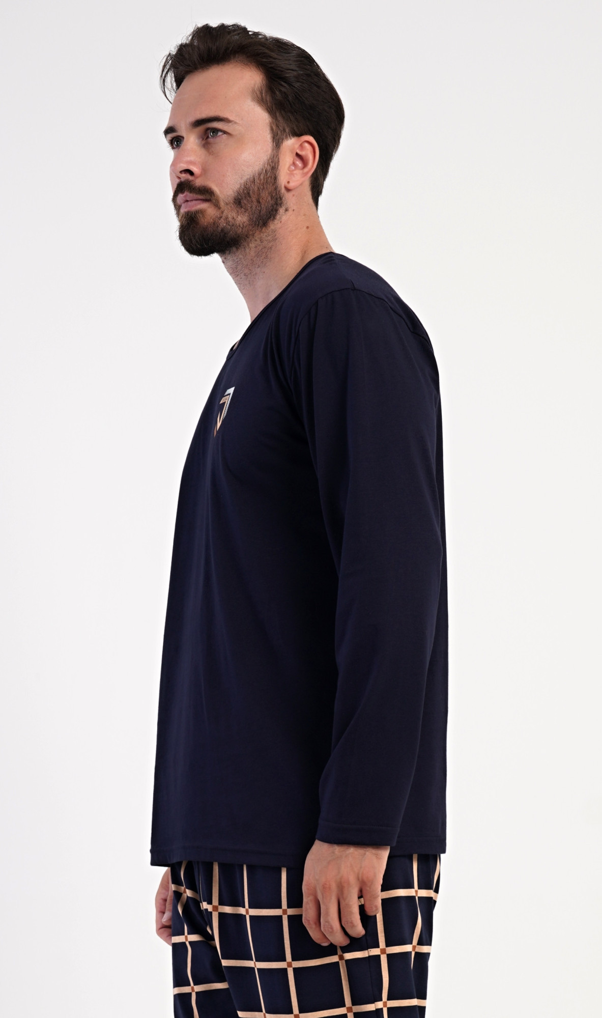 Pánské dlouhé bavlněné pyžamo Alfréd. Pánské pyžamo se skládá z trika s dlouhým rukávem a dlouhých kalhot. Triko je jednobarevné, zdobené na hrudi drobným obrázkem. Kostkované kalhoty mají v pase gumu, šňůrku na stažení a praktické kapsy. Použitý materiál s obsahem bavlny 100% je poddajný a příjemný na dotek.