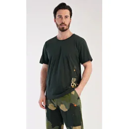 Pánské bavlněné pyžamo dlouhé s krátkým rukávem Army. Pánské pyžamo se skládá z trička s krátkým rukávem a dlouhých kalhot. Tmavě zelené tričko s kulatým výstřihem zdobí nápis. Kalhoty v army stylu a kapsami mají v pase gumu a šňůrku na stažení, nohavice jsou zakončeny patenty. Použitý materiál s obsahem bavlny 100% je příjemný a poddajný na dotek.