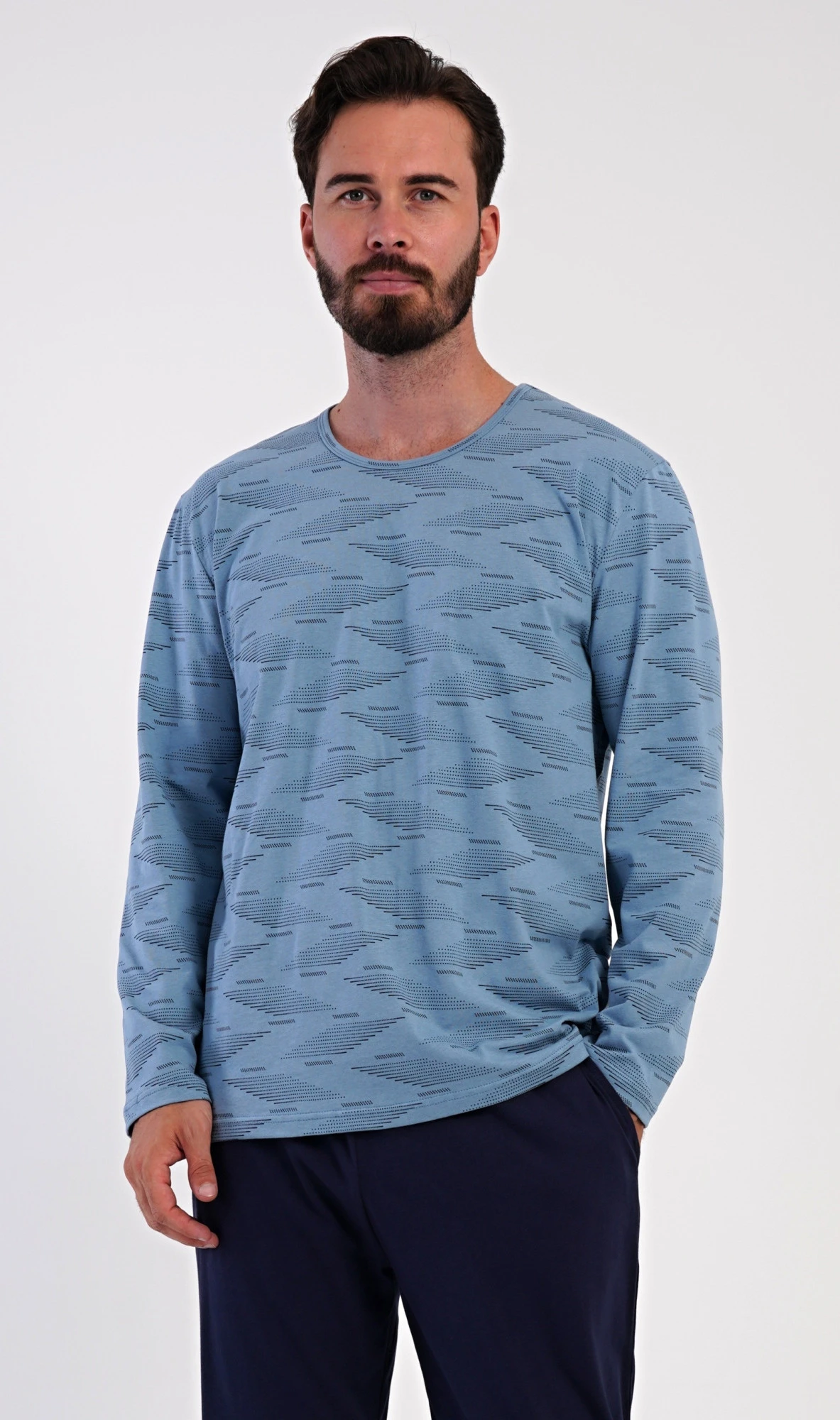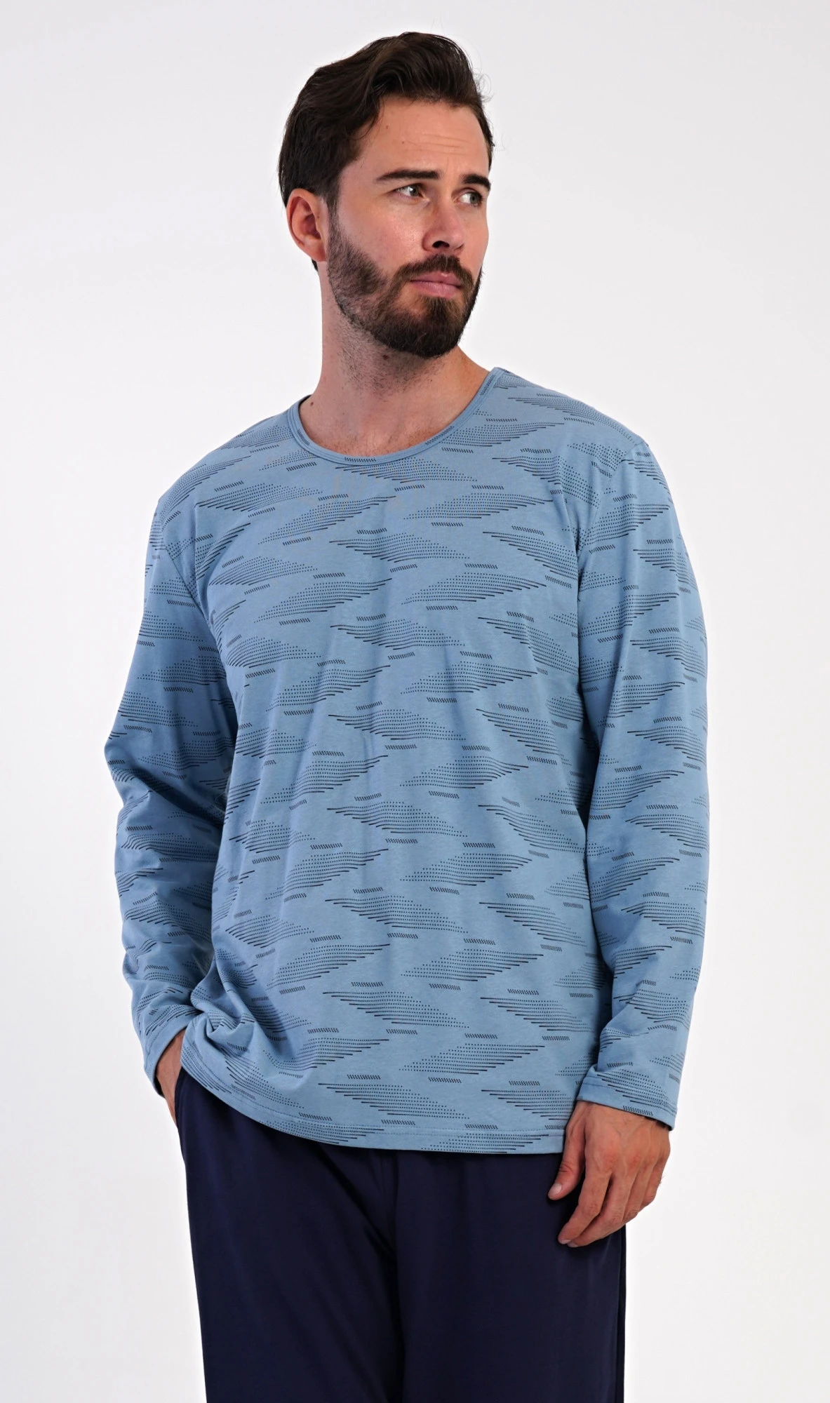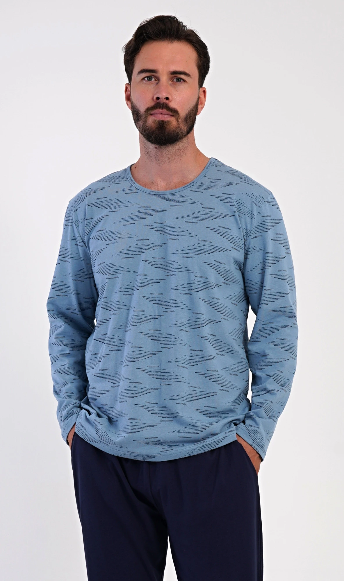 Pánské dlouhé bavlněné pyžamo Arny. Pánské pyžamo se skládá z trika s dlouhým rukávem a dlouhých kalhot. Triko s kulatým výstřihem je potištěno geometrickým vzorem. Jednobarevné kalhoty mají v pase gumu, šňůrku na stažení a praktické kapsy. Použitý materiál s obsahem bavlny 100% je poddajný a příjemný na dotek.