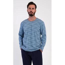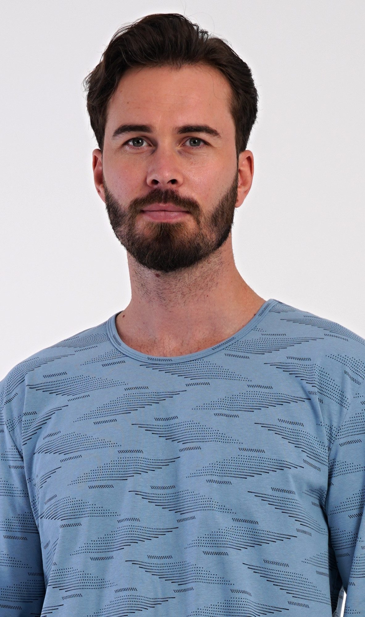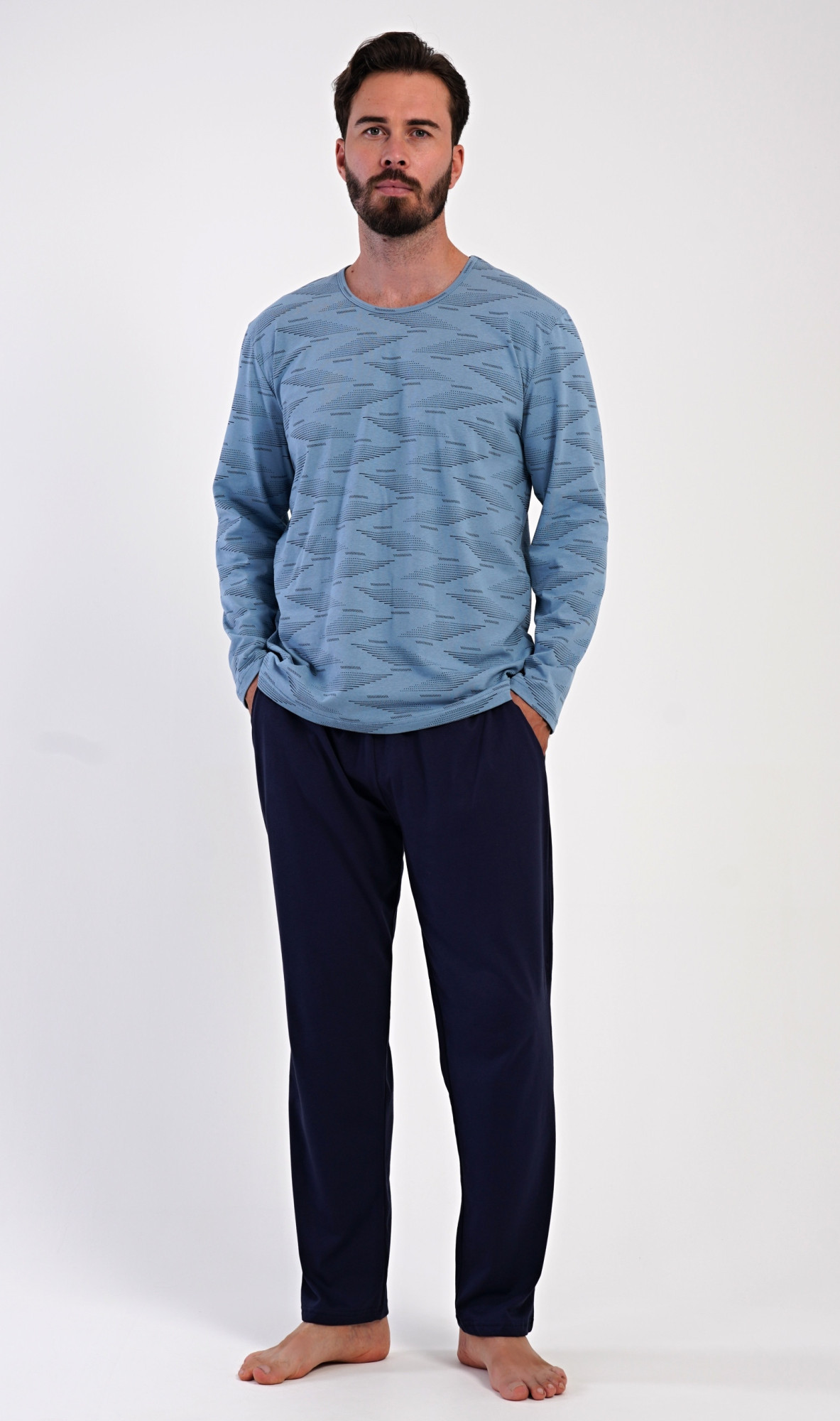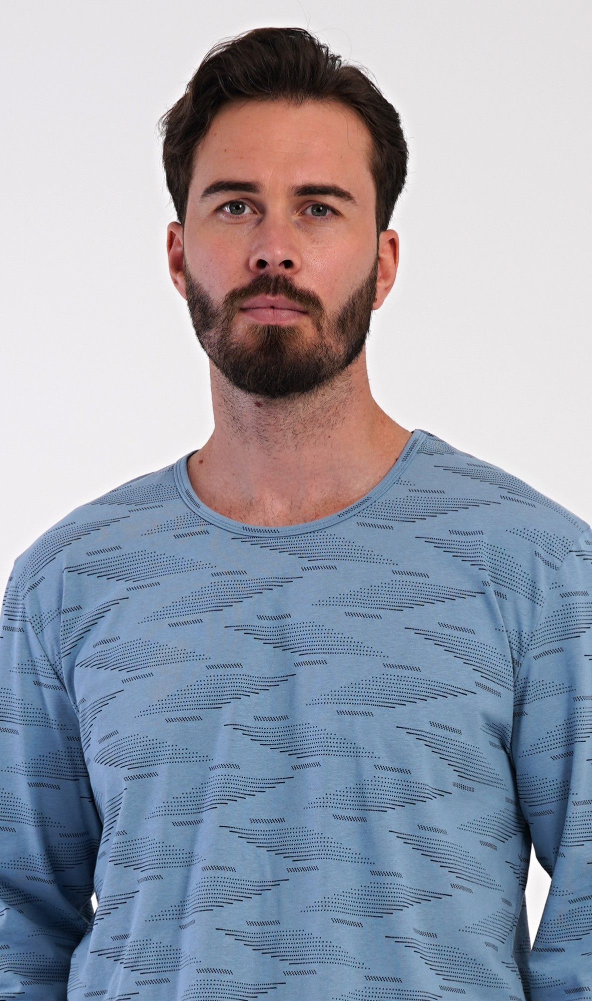 Pánské dlouhé bavlněné pyžamo Arny. Pánské pyžamo se skládá z trika s dlouhým rukávem a dlouhých kalhot. Triko s kulatým výstřihem je potištěno geometrickým vzorem. Jednobarevné kalhoty mají v pase gumu, šňůrku na stažení a praktické kapsy. Použitý materiál s obsahem bavlny 100% je poddajný a příjemný na dotek.