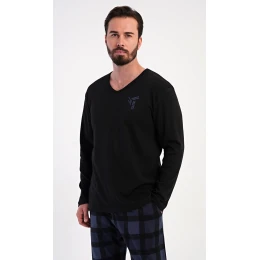 Pánské dlouhé bavlněné pyžamo Erik. Pánské pyžamo se skládá z trika s dlouhým rukávem a dlouhých kalhot. Triko s kulatým výstřihem zdobí na hrudi malý obrázek. Kárované kalhoty mají v pase gumu, šňůrku na stažení a praktické kapsy. Použitý materiál INTERLOK s obsahem bavlny 100% je poddajný a příjemný na dotek.