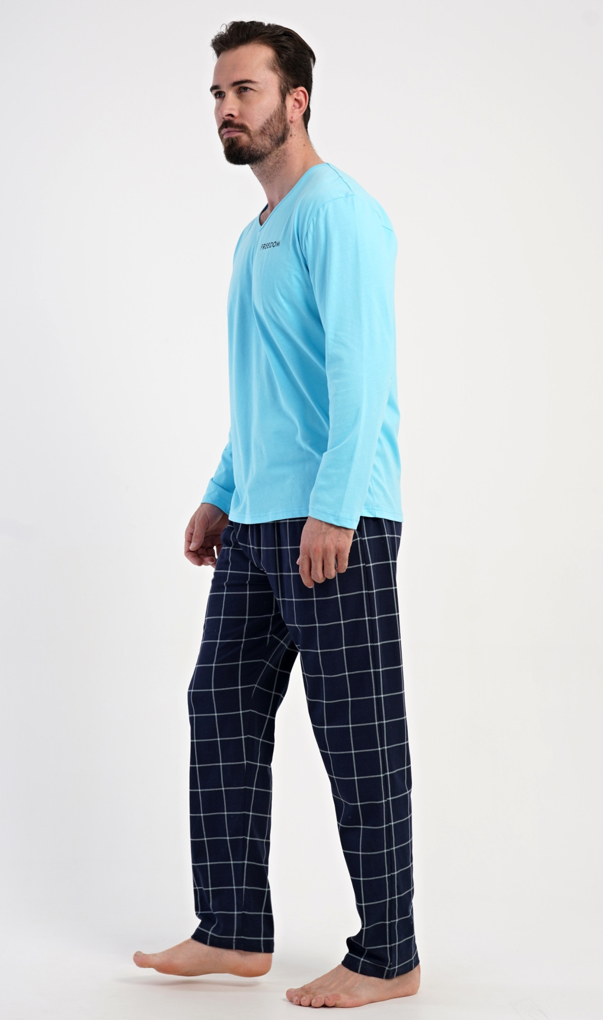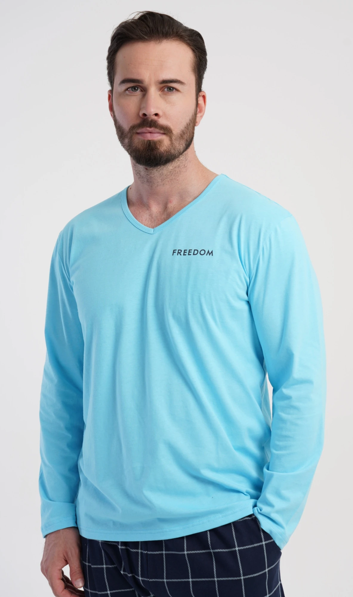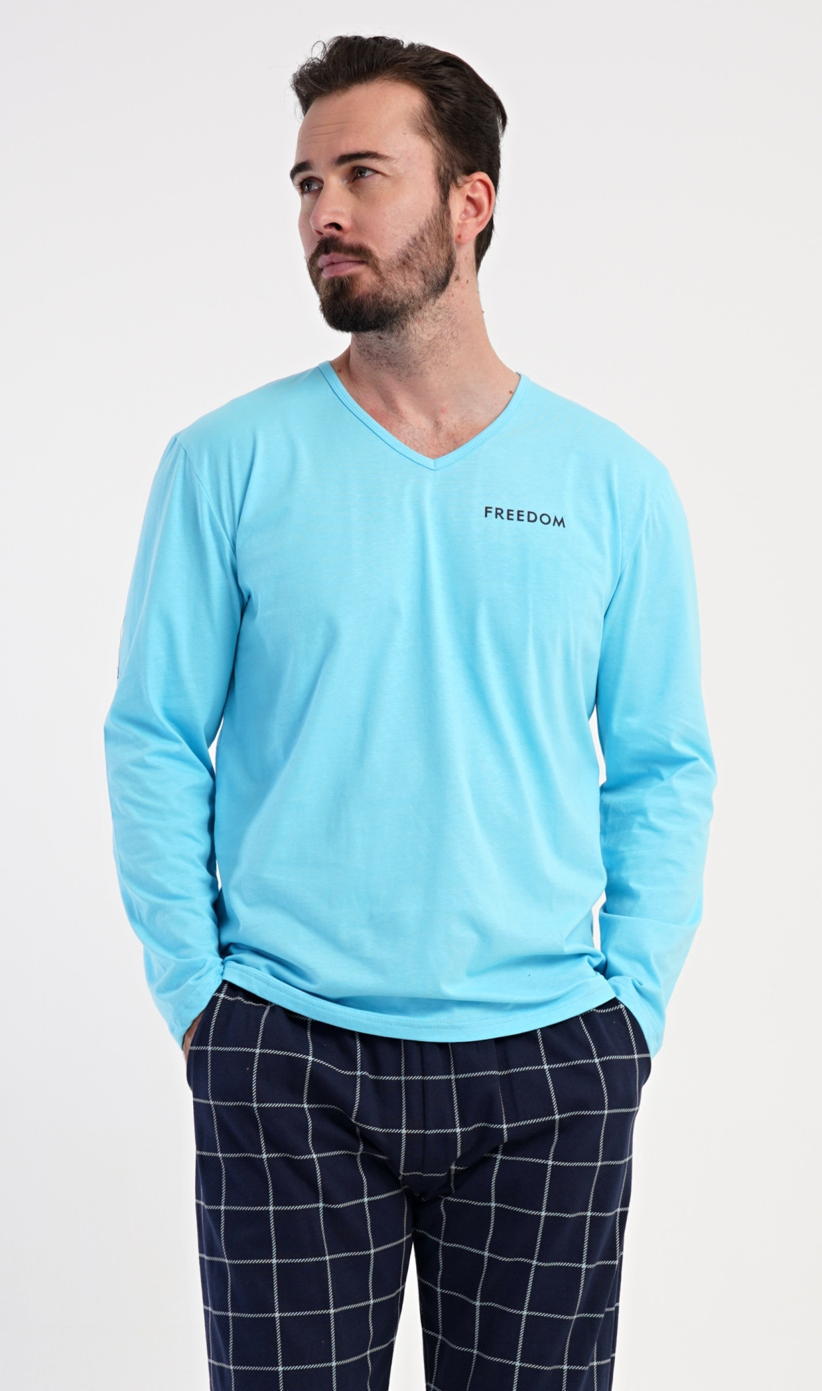 Pánské bavlněné pyžamo s dlouhým rukávem Freedom. Pánské pyžamo se skládá z trika s dlouhým rukávem a dlouhých kalhot. Triko s výstřihem do V zdobí na hrudi drobný nápis FREEDOM. Triko doplňují kárované kalhoty, které mají v pase gumu, šňůrku na stažení a praktické kapsy. Použitý materiál s obsahem bavlny 100% je příjemný a poddajný na dotek.
