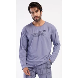 Pánské dlouhé bavlněné pyžamo Jakub. Pánské pyžamo se skládá z trika s dlouhým rukávem a dlouhých kalhot. Triko je jednobarevné, zdobené na hrudi obrázkem motocyklu a nápisem 'Legendary vintage machines'. Kostkované kalhoty mají v pase gumu, šňůrku na stažení a praktické kapsy. Použitý materiál s obsahem bavlny 100% je poddajný a příjemný na dotek.