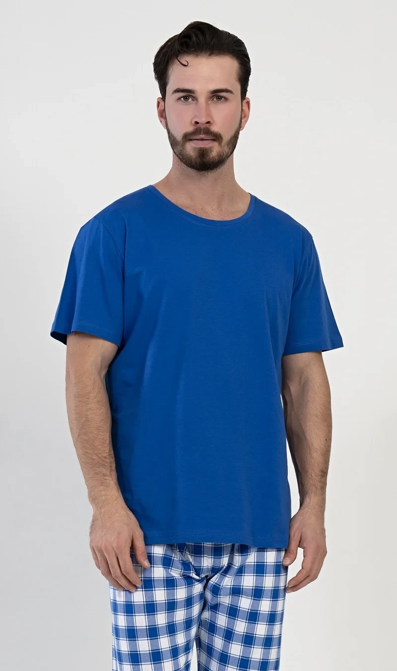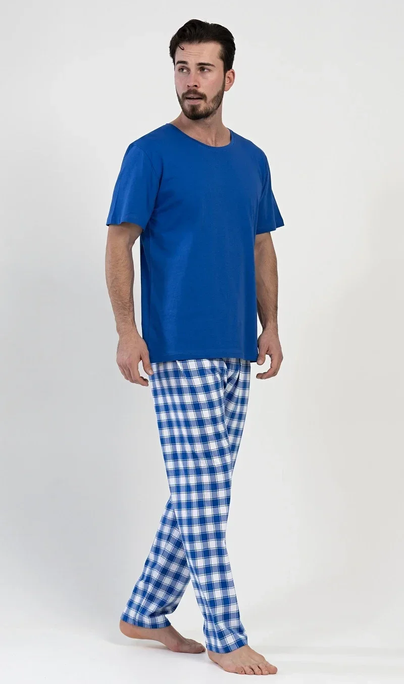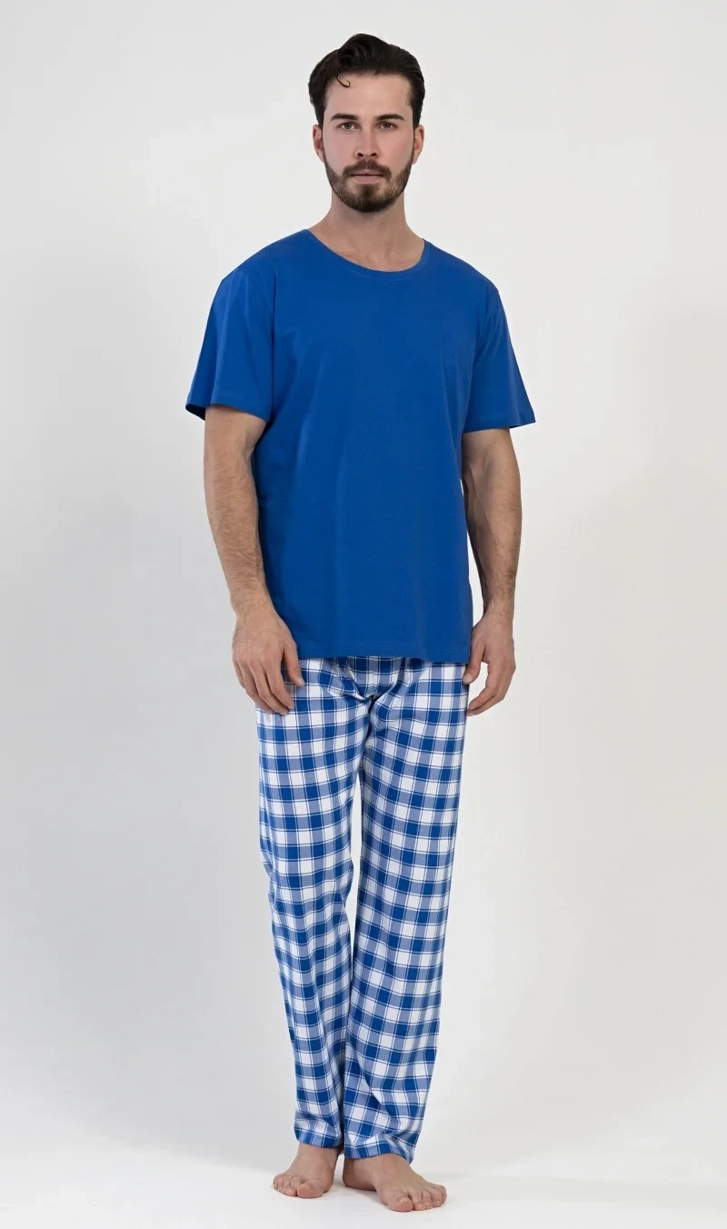 Pánské pyžamo se skládá z trička s krátkým rukávem a dlouhých kalhot. Jednobarevné tričko vhodně doplňují kostkované kalhoty..Kalhoty nemají kapsy. Použitý materiál je jemný a poddajný na dotek. Pyžamo je vhodné na denní nošení.