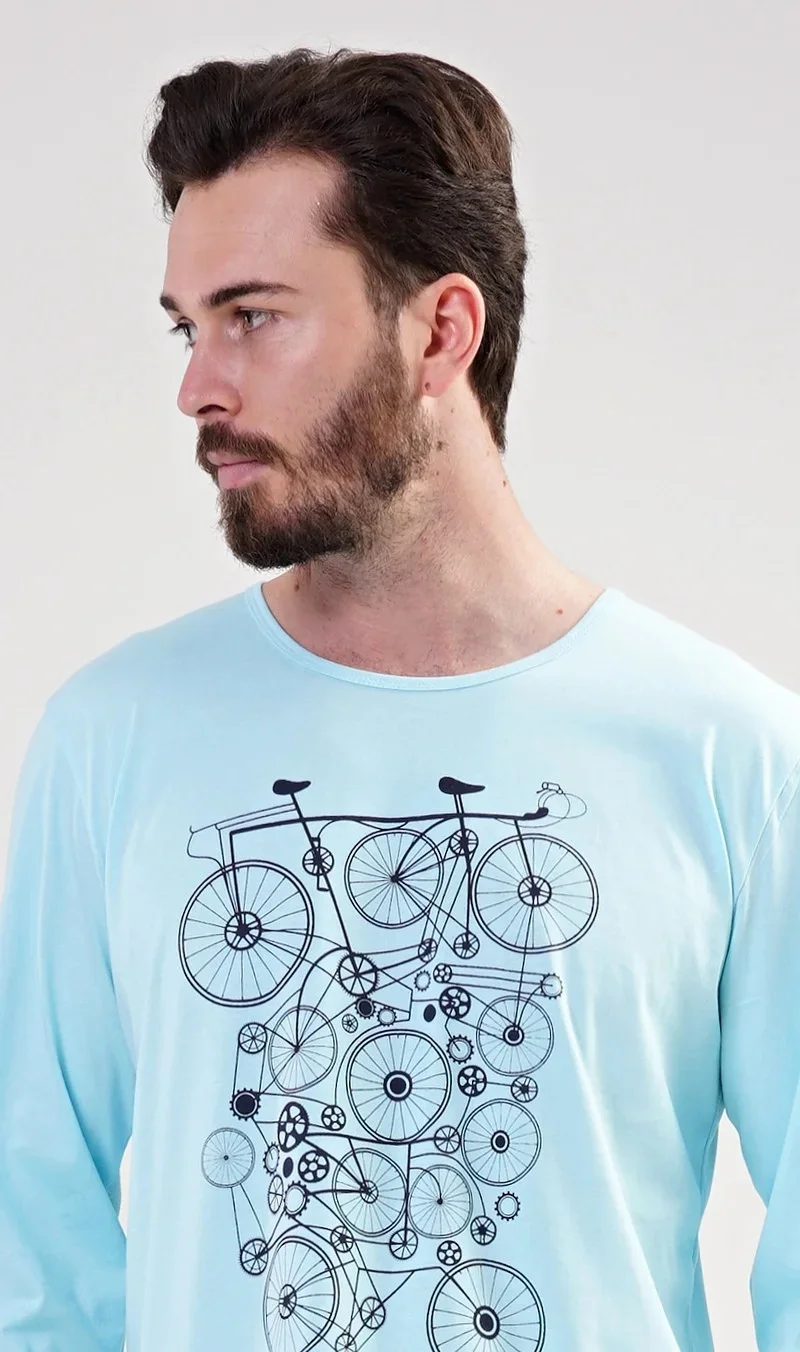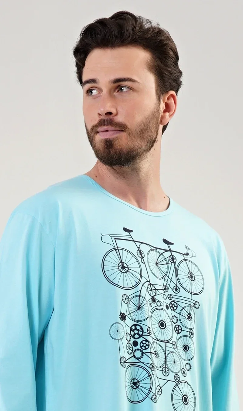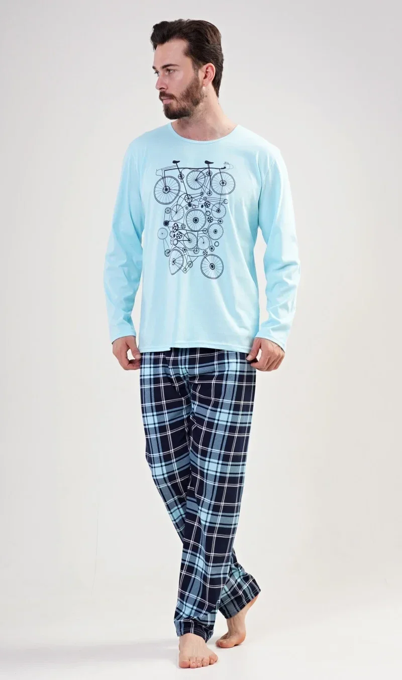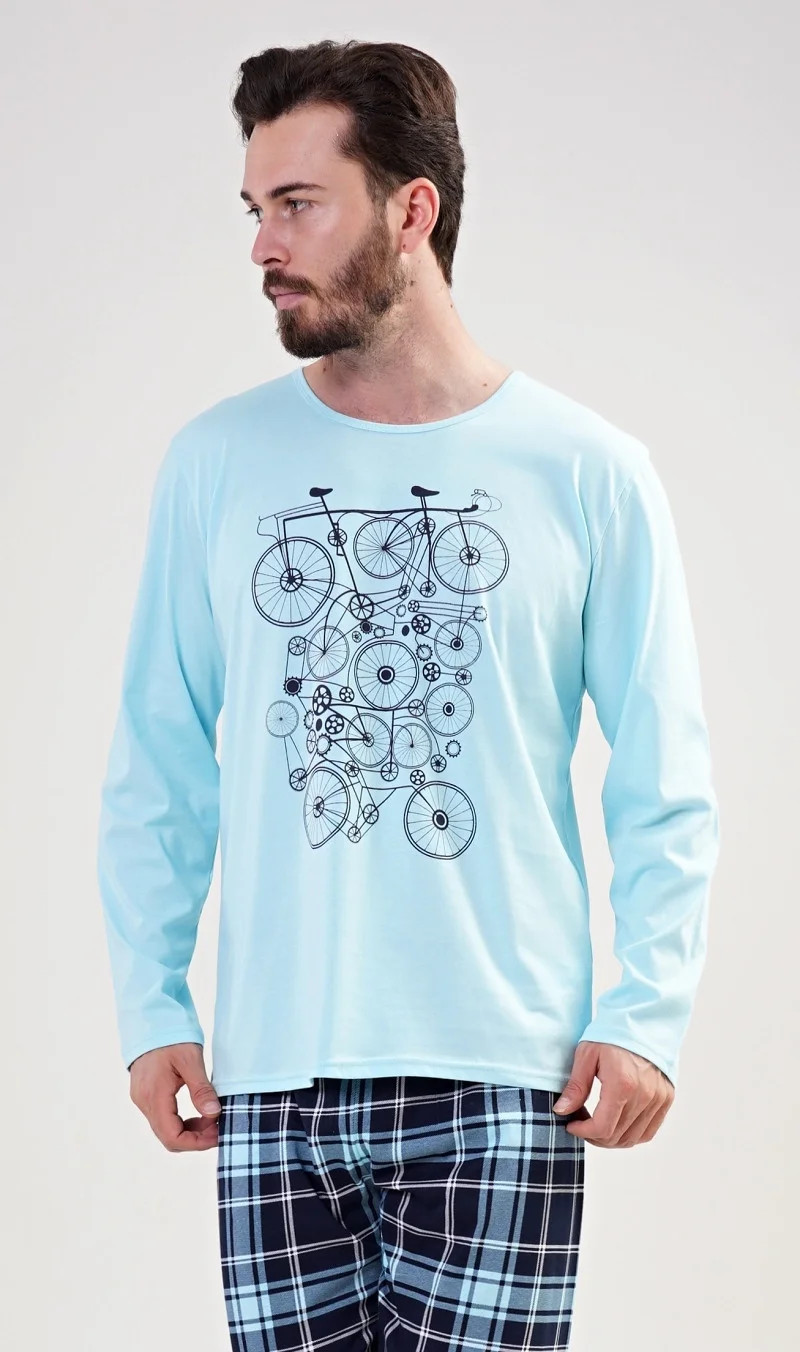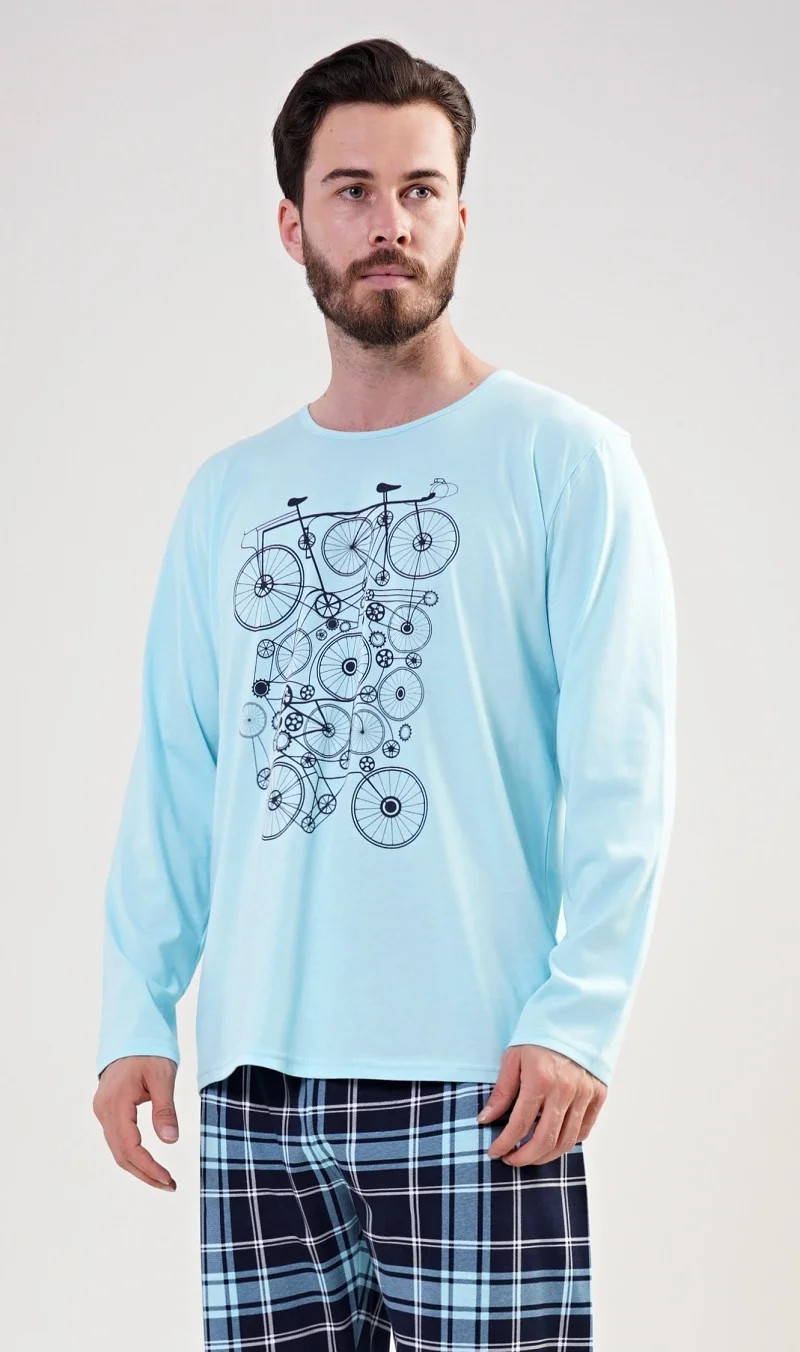 Pánské pyžamo dlouhé Kolo. Pánské pyžamo se skládá z trička s dlouhým rukávem a dlouhých kalhot. Na jednobarevném tričku je velký obrázek několika kol. Výrazný potisk trička vhodně doplňují kárované kalhoty BEZ KAPES. Použitý materiál je jemný a poddajný na dotek.