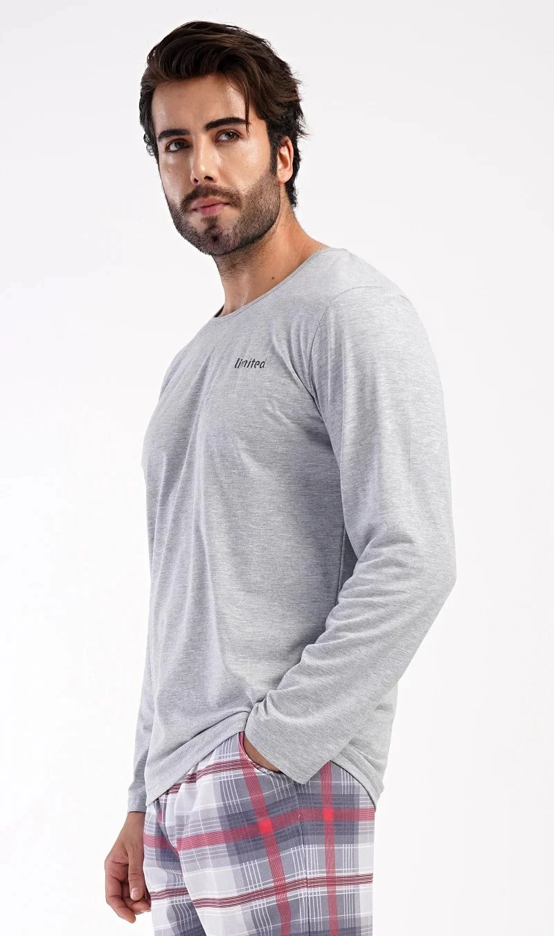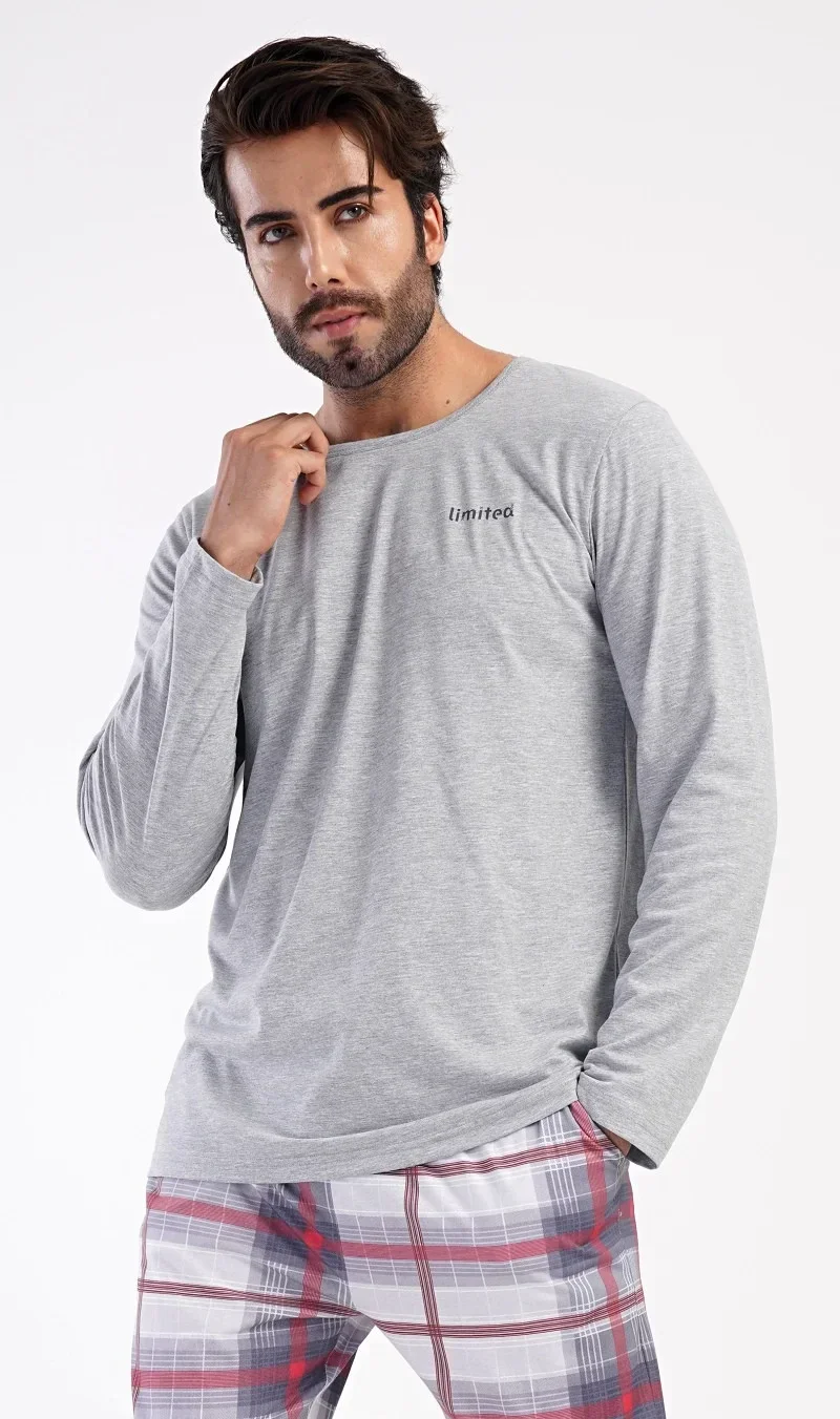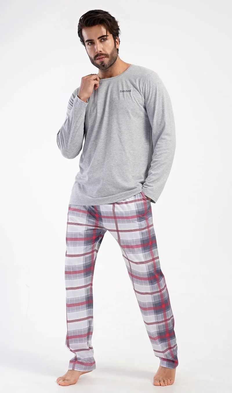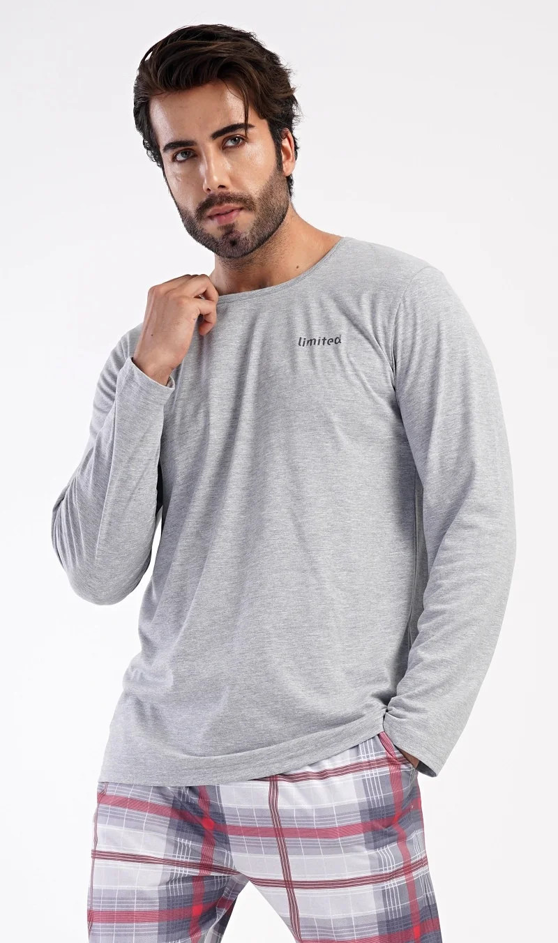 Pánské dlouhé bavlněné pyžamo Marek. Pánské pyžamo se skládá z trika s dlouhým rukávem a dlouhých kalhot. Triko je jednobarevné, zdobené na hrudi drobným nápisem 'Limited'. Kostkované kalhoty mají v pase gumu, šňůrku na stažení a praktické kapsy. Použitý materiál je poddajný a příjemný na dotek. Obsah bavlny u trika je 70% a u kalhot 100%.