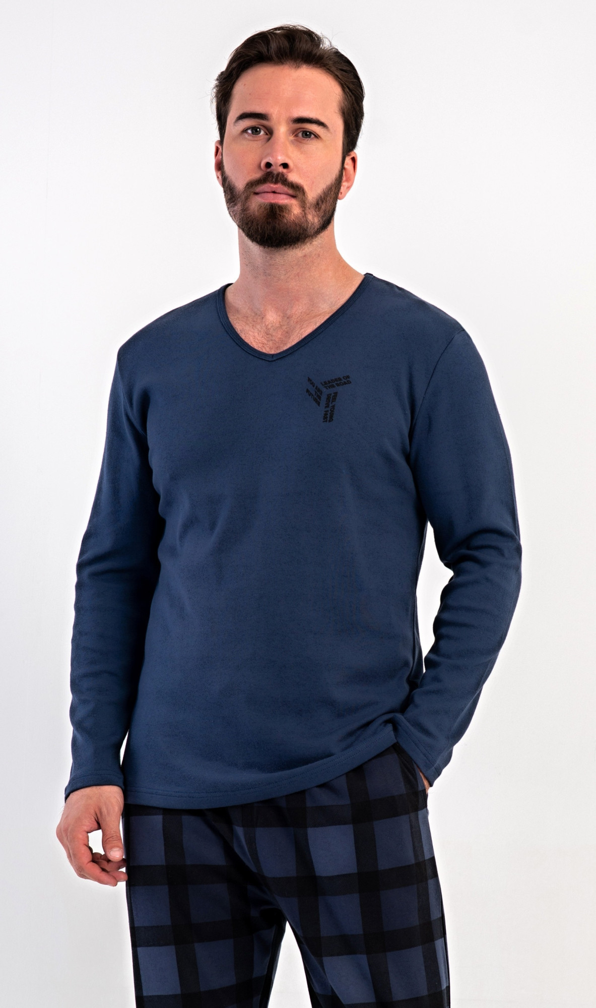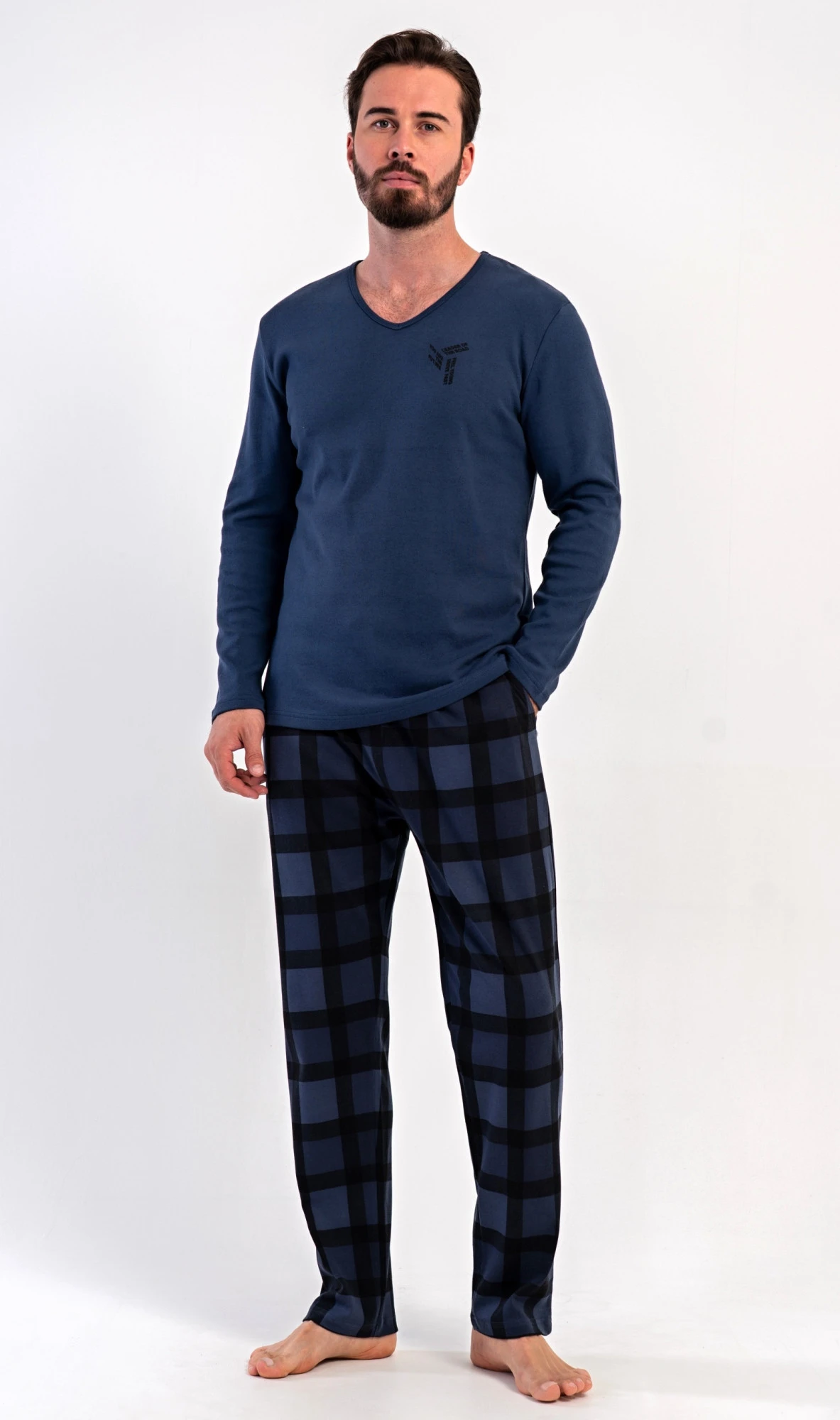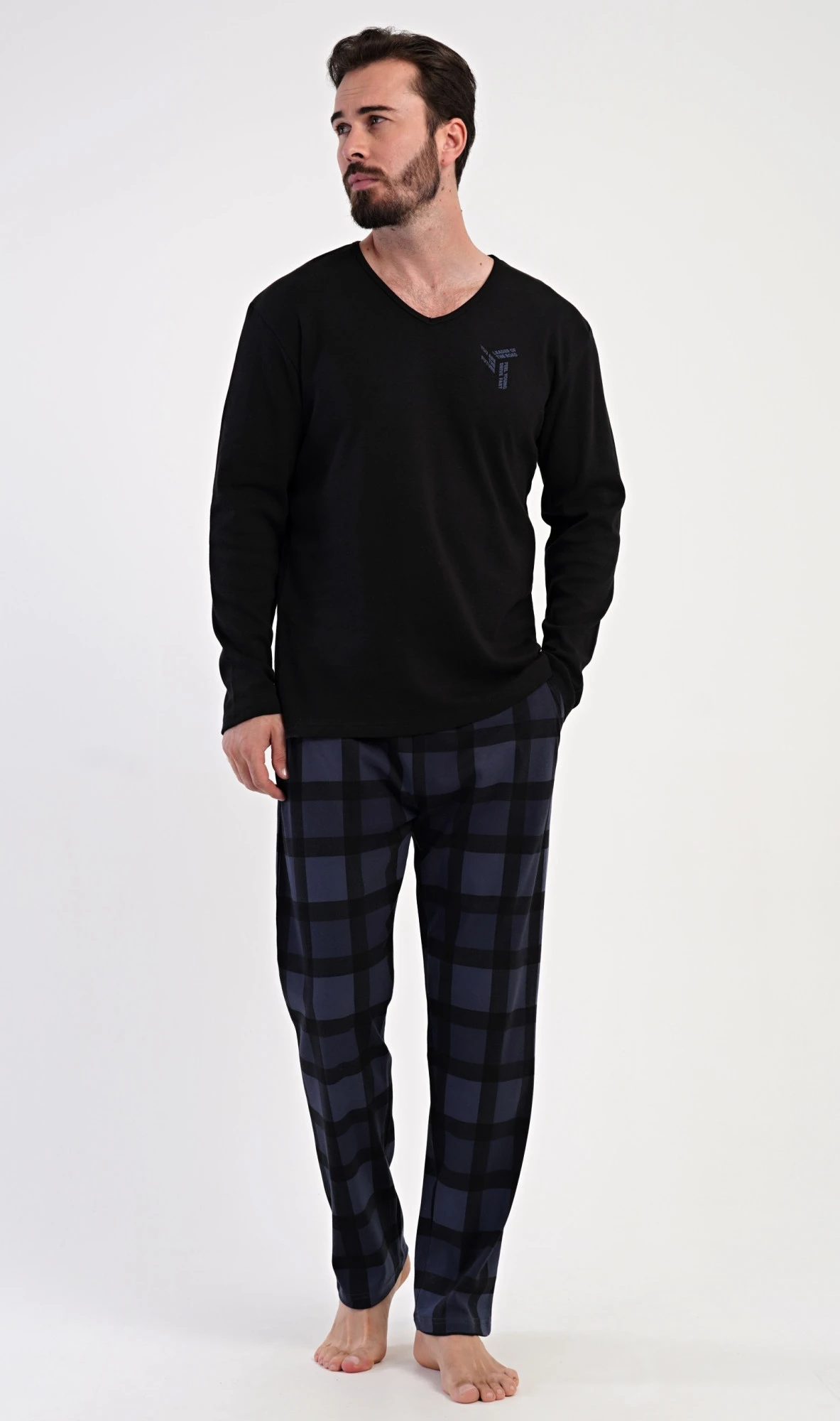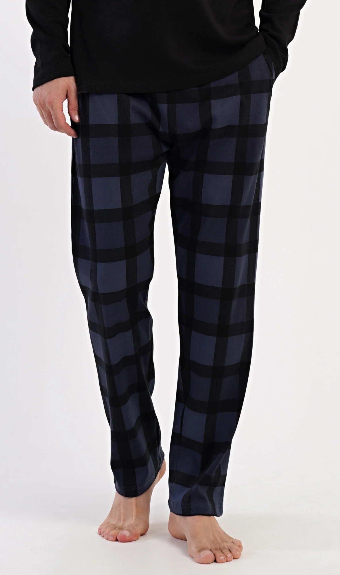 Pánské dlouhé bavlněné pyžamo Erik. Pánské pyžamo se skládá z trika s dlouhým rukávem a dlouhých kalhot. Triko s kulatým výstřihem zdobí na hrudi malý obrázek. Kárované kalhoty mají v pase gumu, šňůrku na stažení a praktické kapsy. Použitý materiál INTERLOK s obsahem bavlny 100% je poddajný a příjemný na dotek.