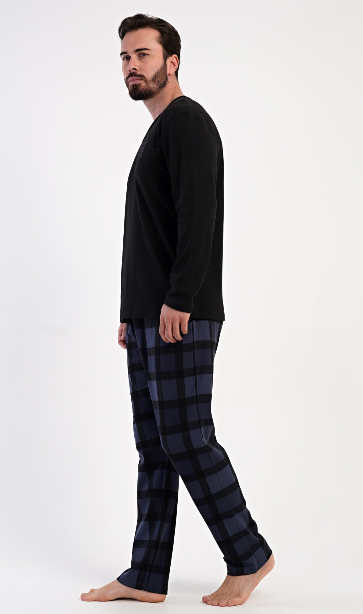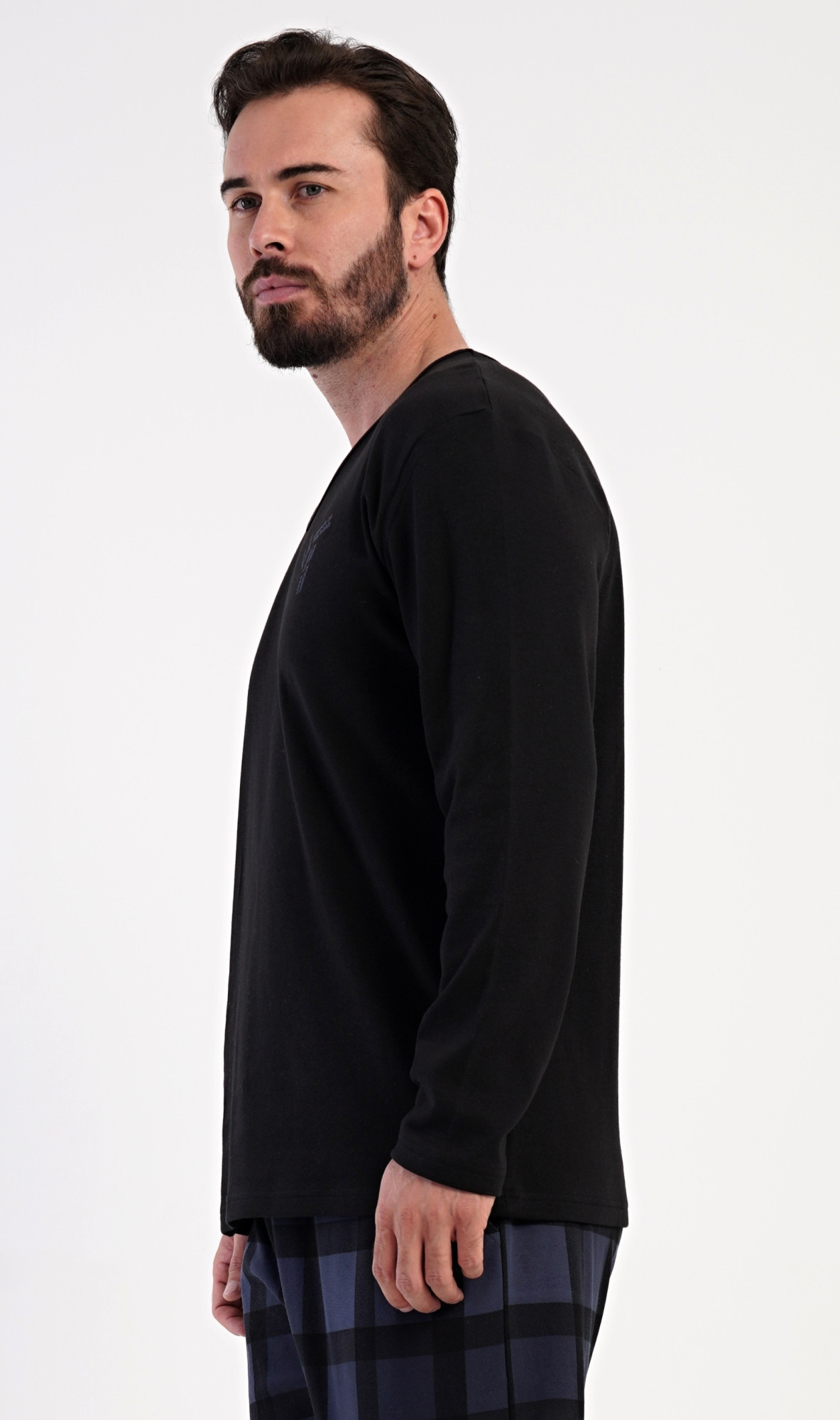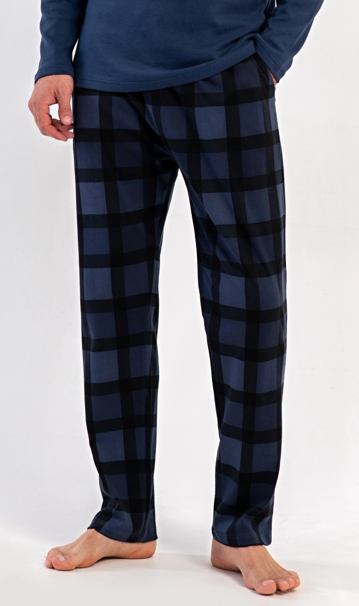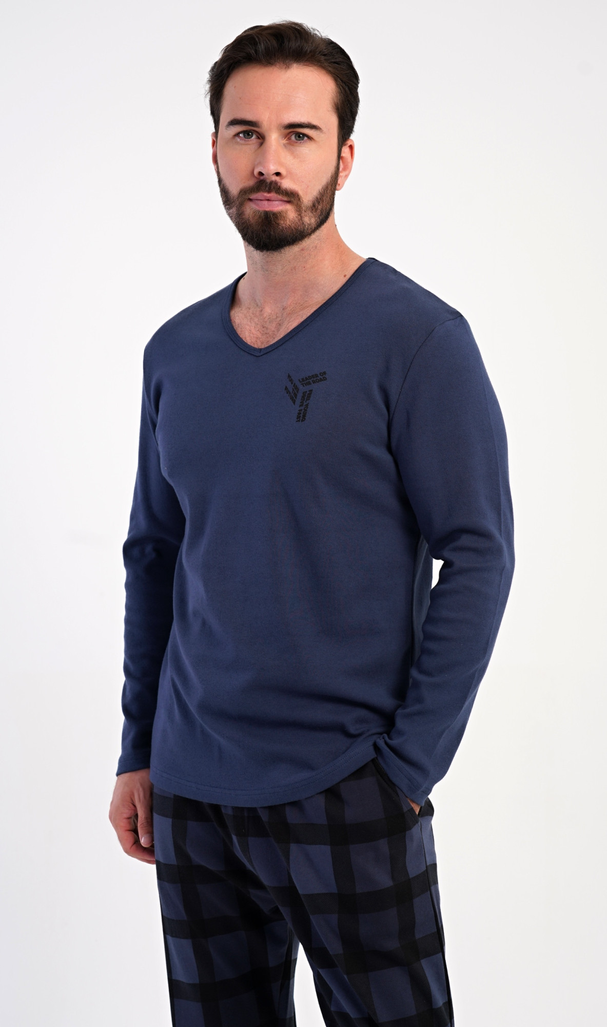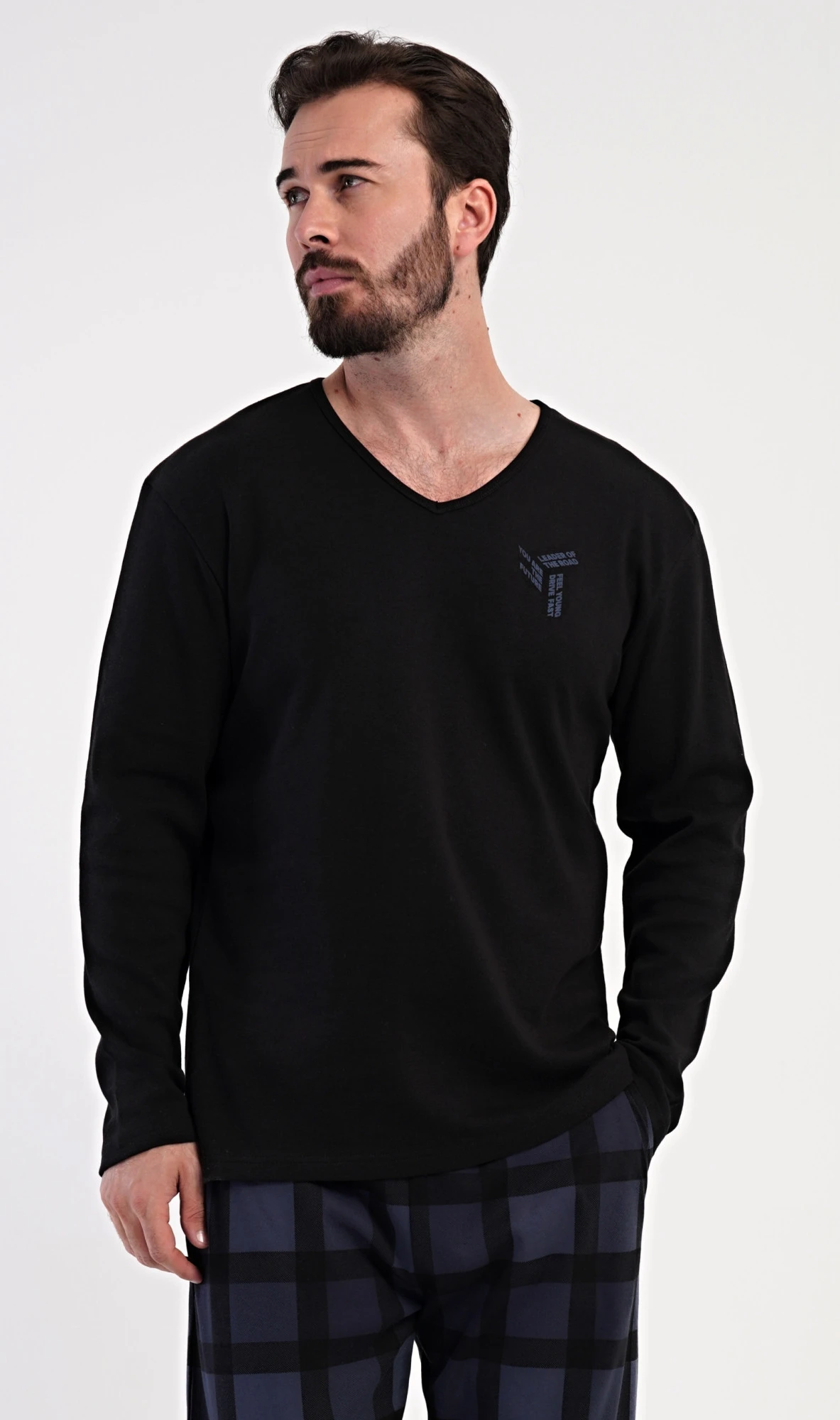 Pánské dlouhé bavlněné pyžamo Erik. Pánské pyžamo se skládá z trika s dlouhým rukávem a dlouhých kalhot. Triko s kulatým výstřihem zdobí na hrudi malý obrázek. Kárované kalhoty mají v pase gumu, šňůrku na stažení a praktické kapsy. Použitý materiál INTERLOK s obsahem bavlny 100% je poddajný a příjemný na dotek.