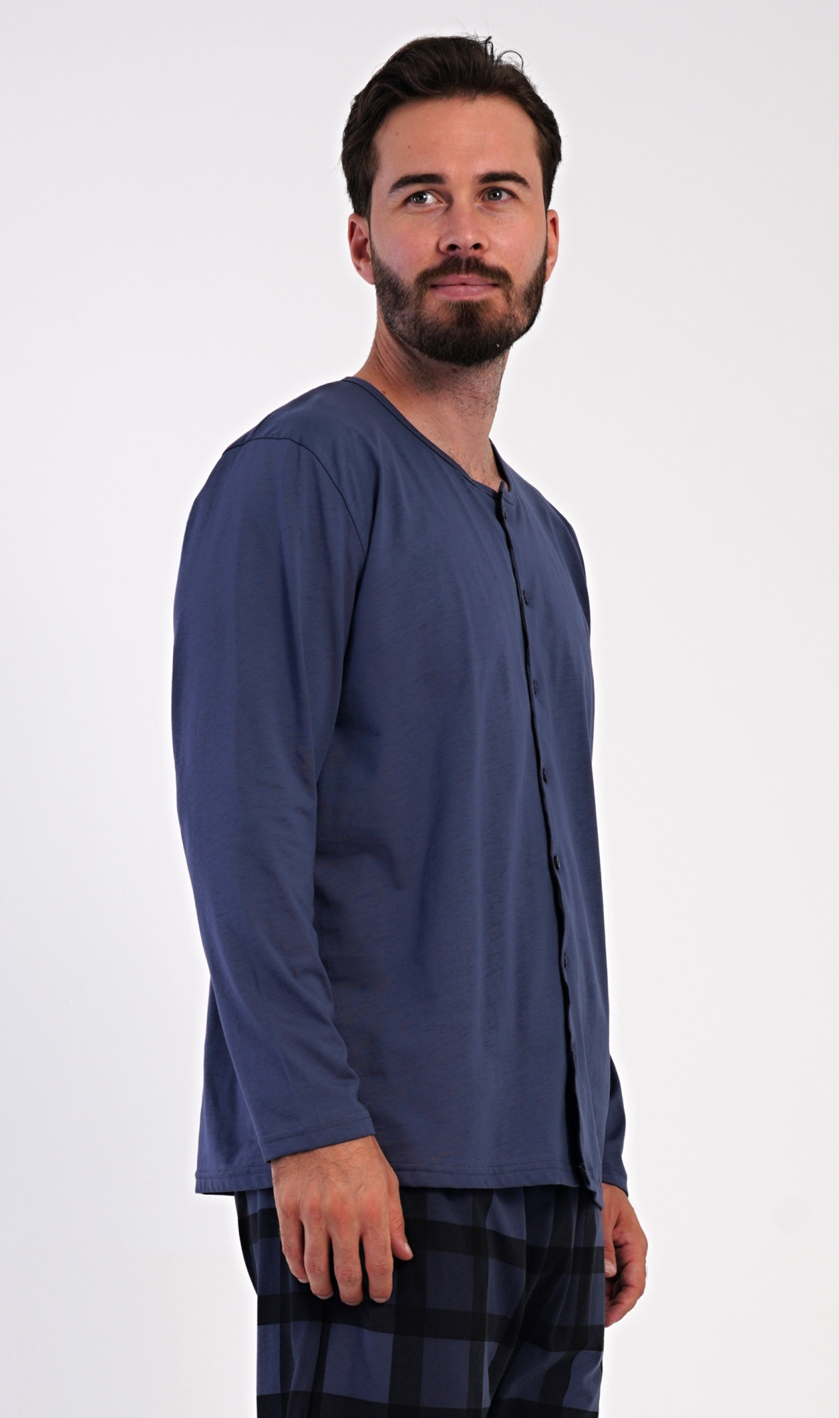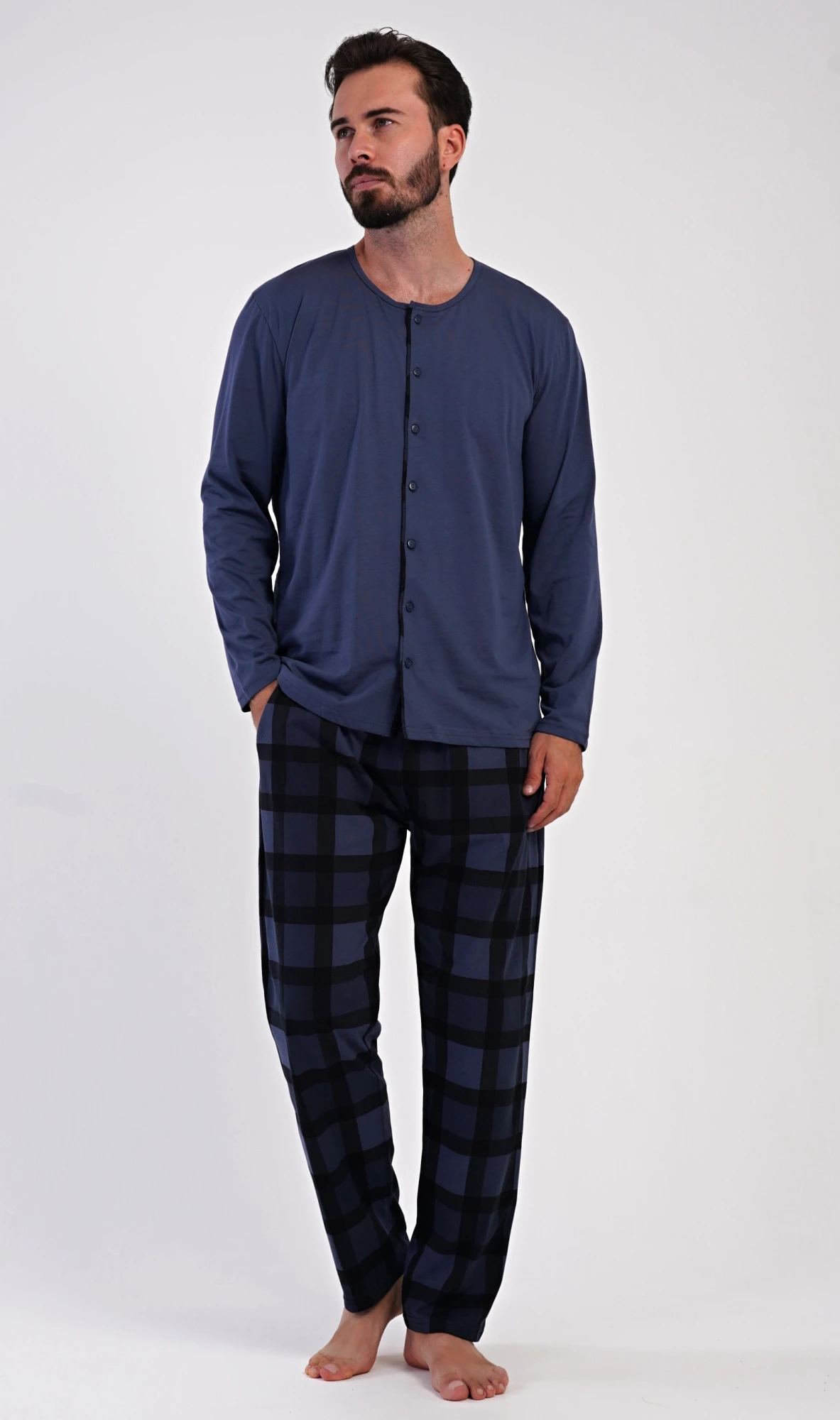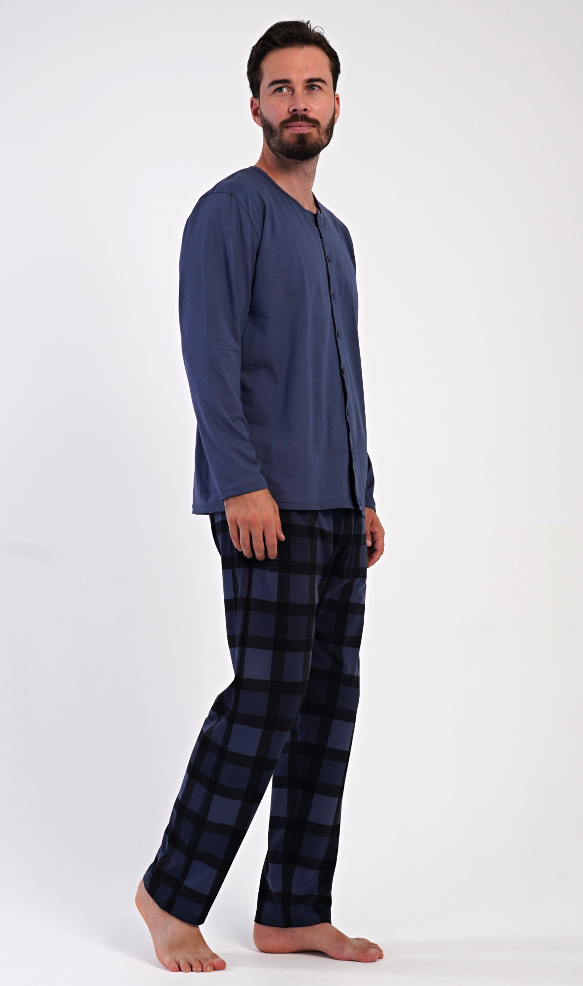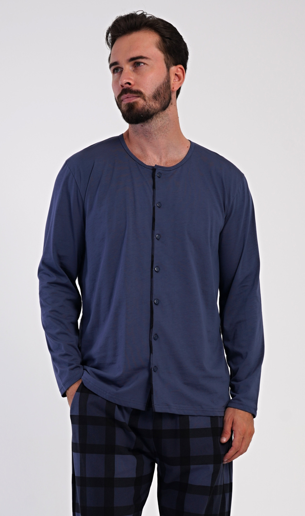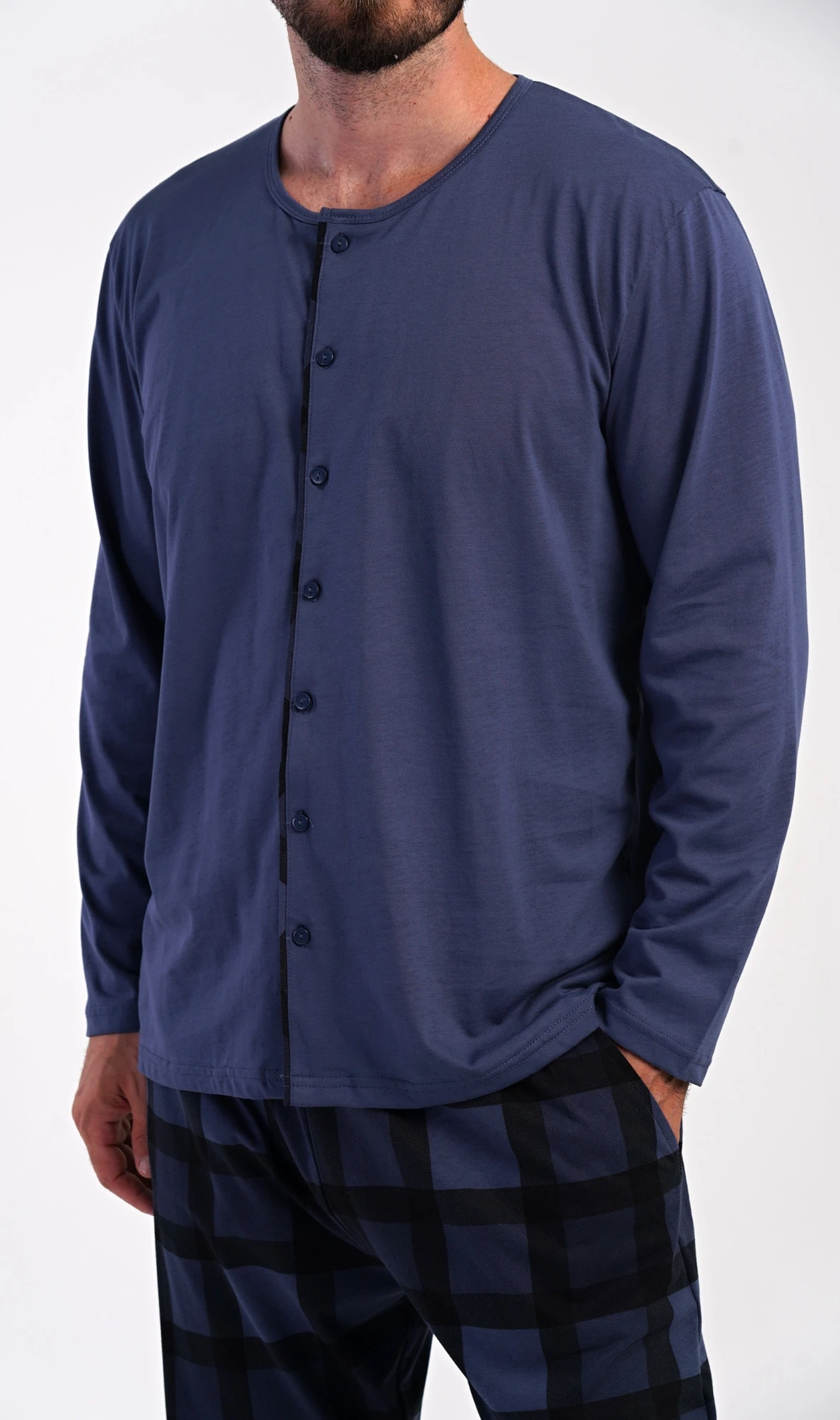 Pánské dlouhé bavlněné pyžamo Rudolf. Pánské pyžamo se skládá z trika s dlouhým rukávem a dlouhých kalhot. Triko s kulatým výstřihem má zapínání na knoflíky. Kárované kalhoty mají v pase gumu, šňůrku na stažení a praktické kapsy. Použitý materiál s obsahem bavlny 100% je poddajný a příjemný na dotek.