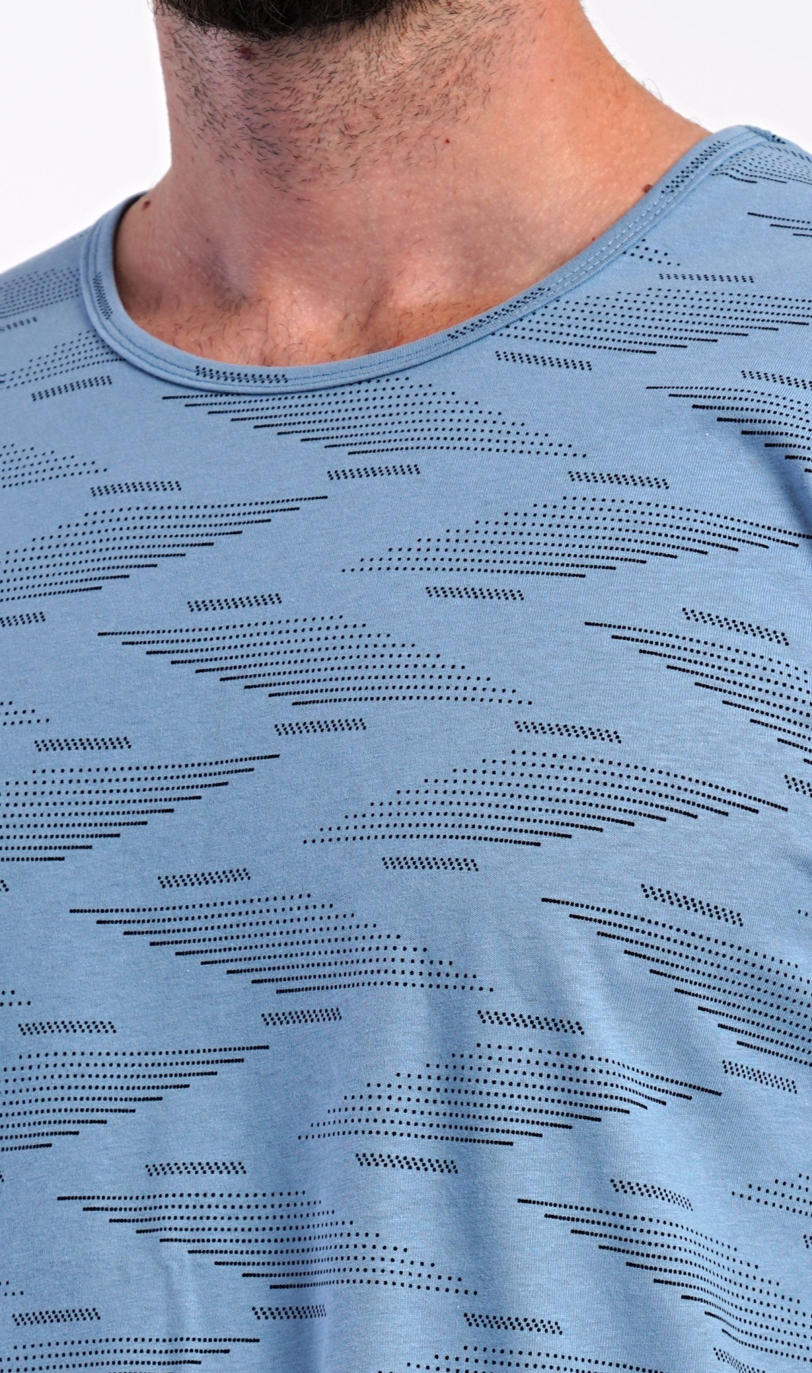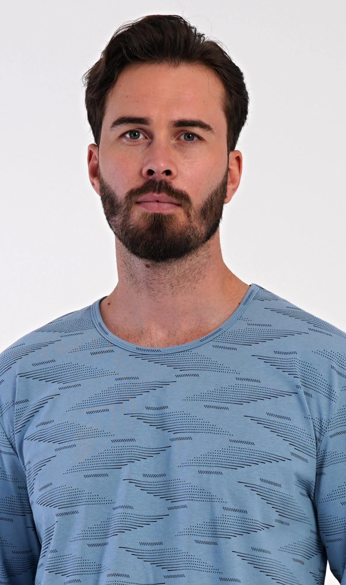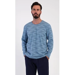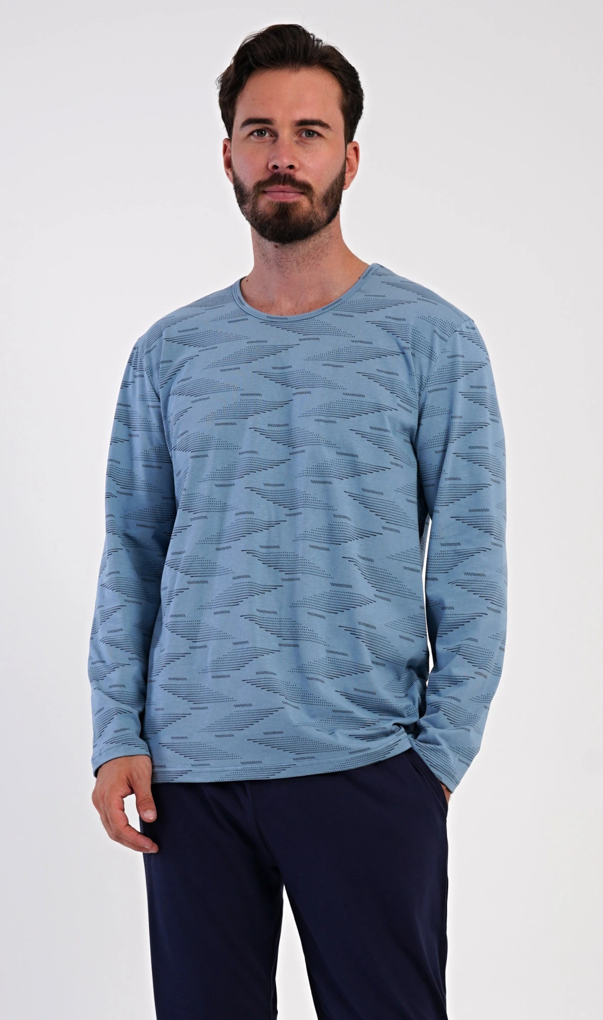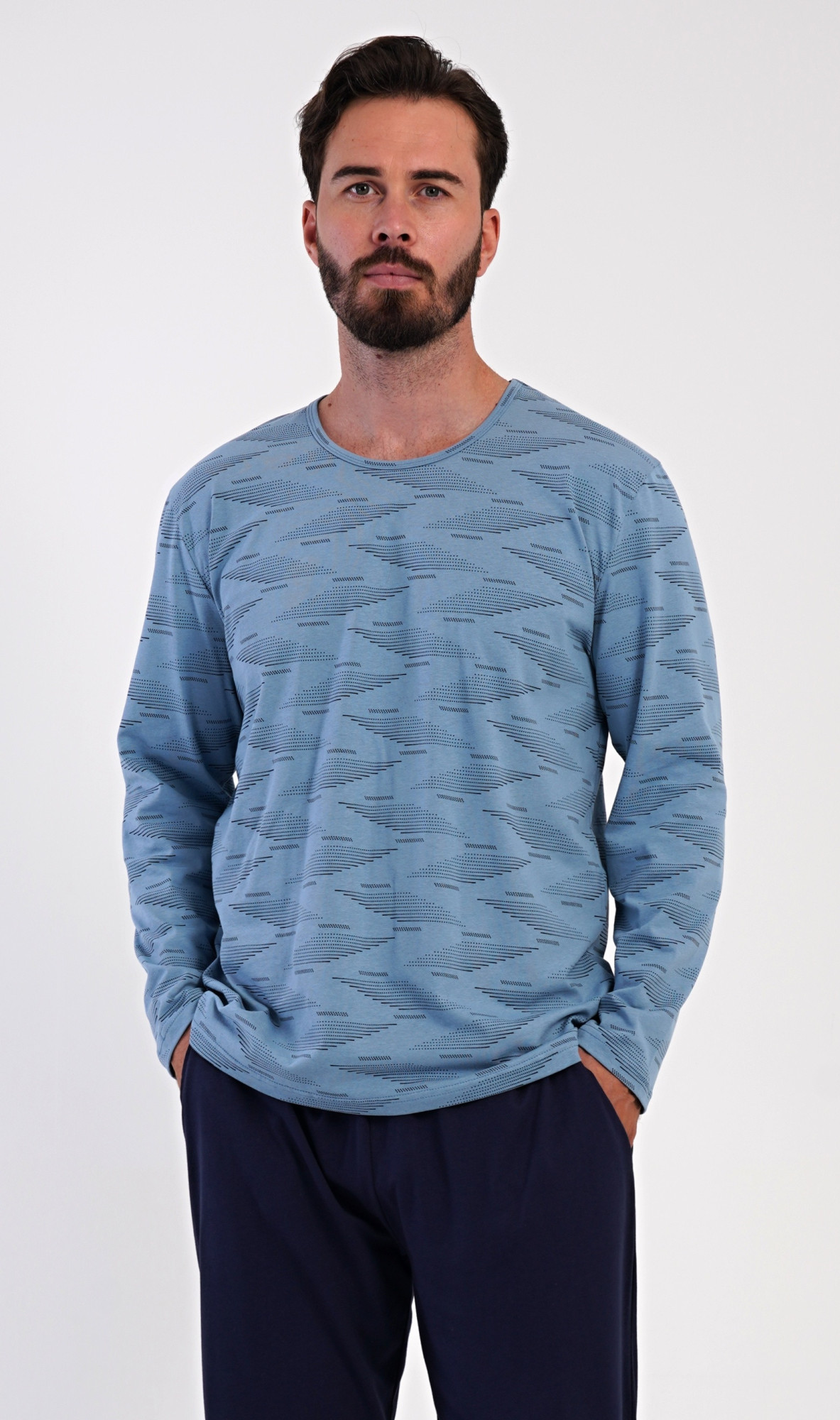 Pánské dlouhé bavlněné pyžamo Arnošt. Pánské pyžamo se skládá z trika s dlouhým rukávem a dlouhých kalhot. Triko s kulatým výstřihem je potištěno geometrickým vzorem. Jednobarevné kalhoty mají v pase gumu, šňůrku na stažení a praktické kapsy. Použitý materiál s obsahem bavlny 100% je poddajný a příjemný na dotek.