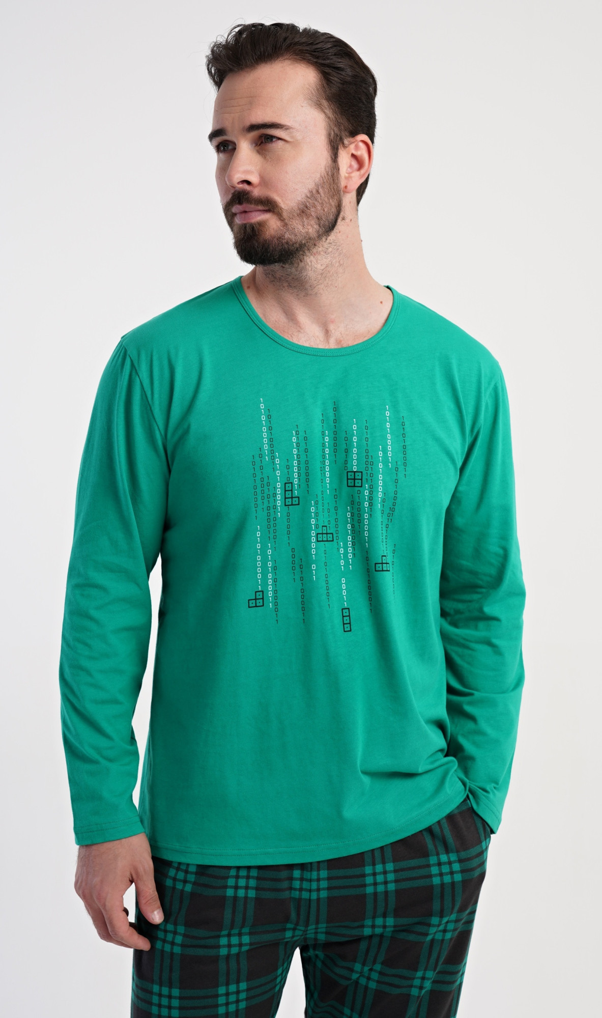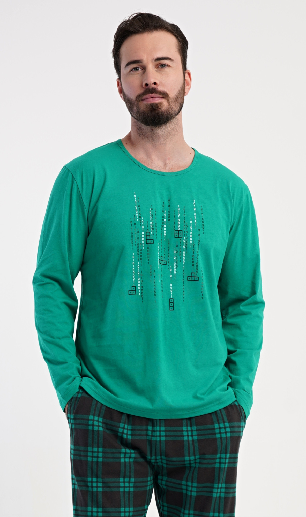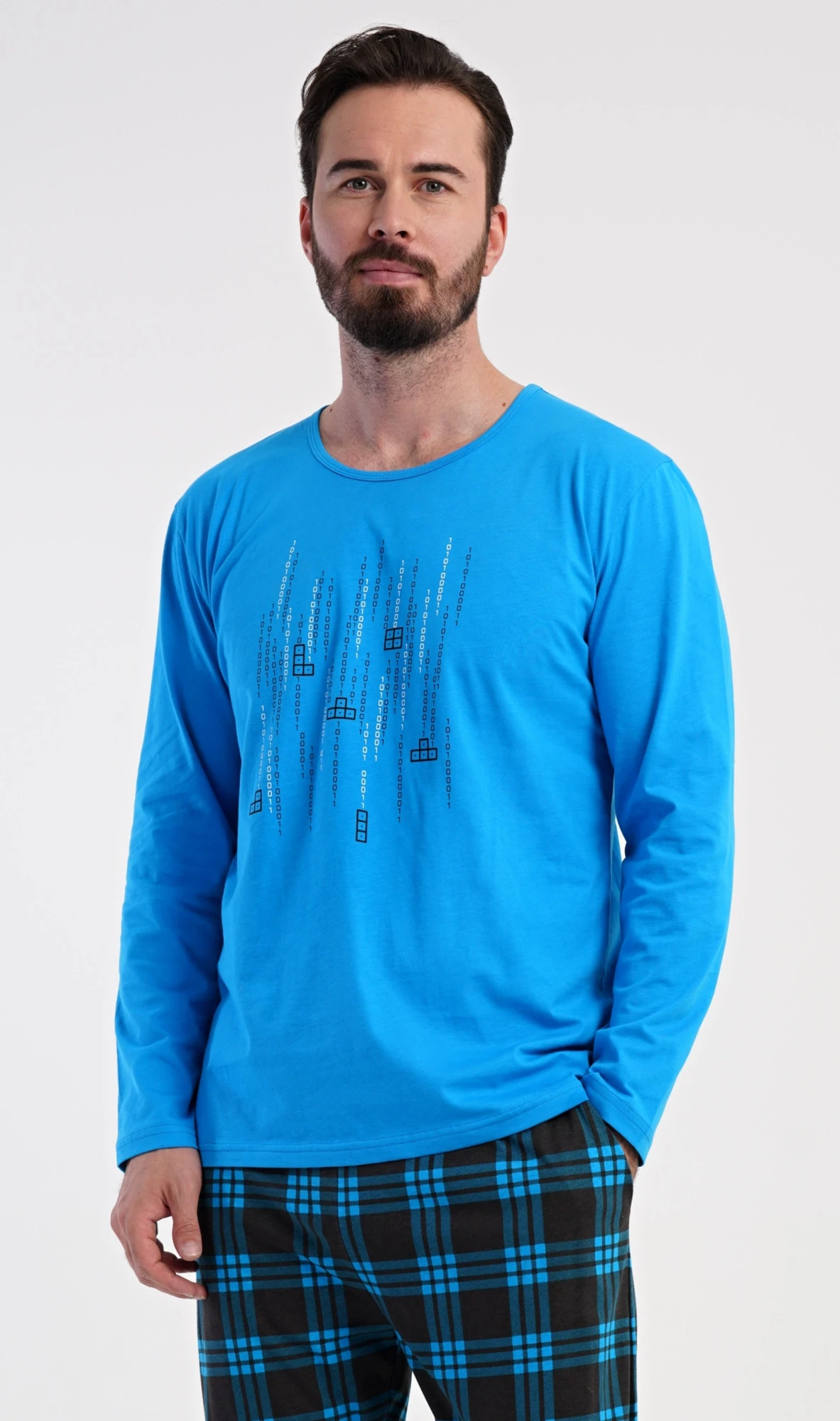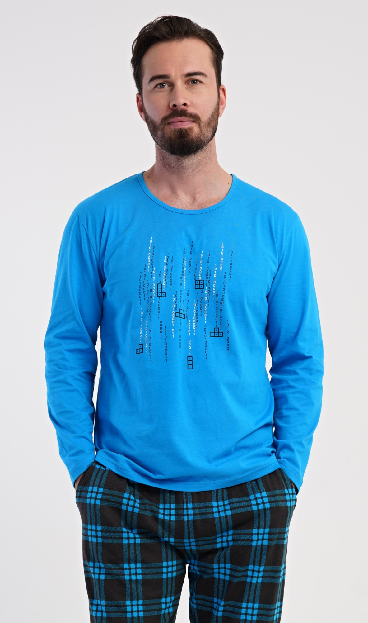 Pánské bavlněné pyžamo s dlouhým rukávem Tetris. Pánské pyžamo se skládá z trika s dlouhým rukávem a dlouhých kalhot. Triko s kulatým výstřihem zdobí na hrudi obrázek hry Tetris. Triko doplňují kárované kalhoty, které mají v pase gumu, šňůrku na stažení a praktické kapsy. Použitý materiál s obsahem bavlny 100% je příjemný a poddajný na dotek.