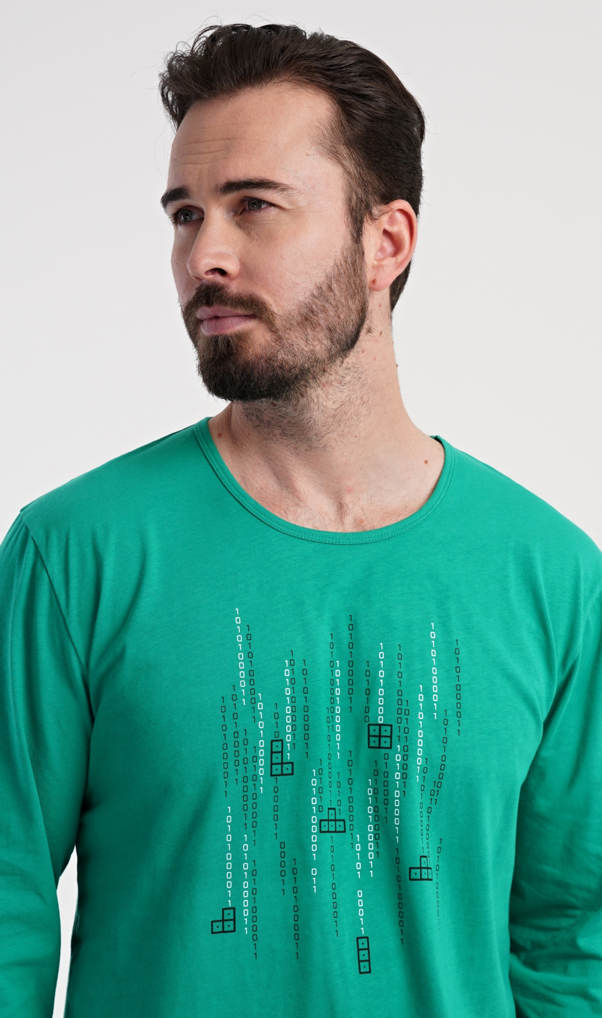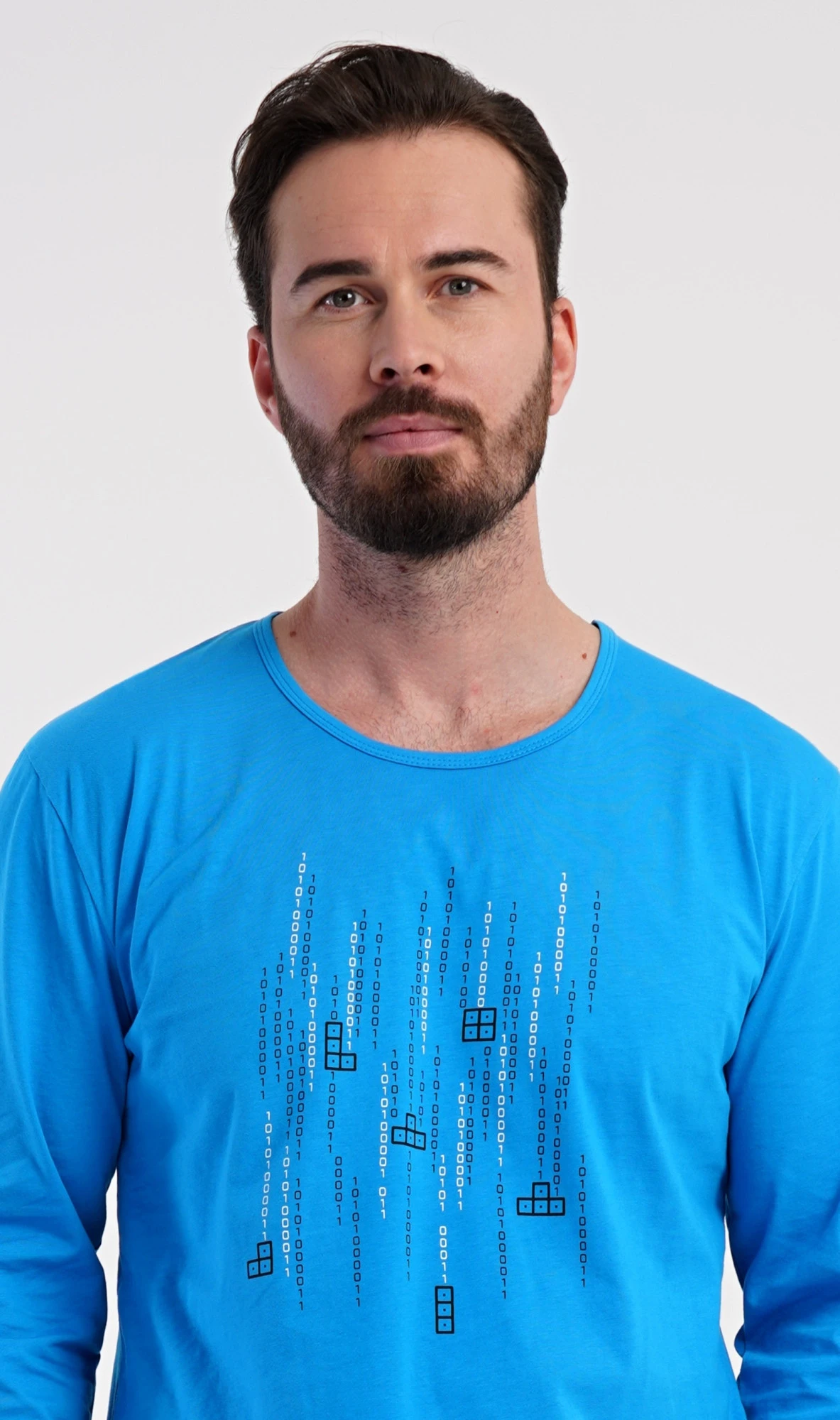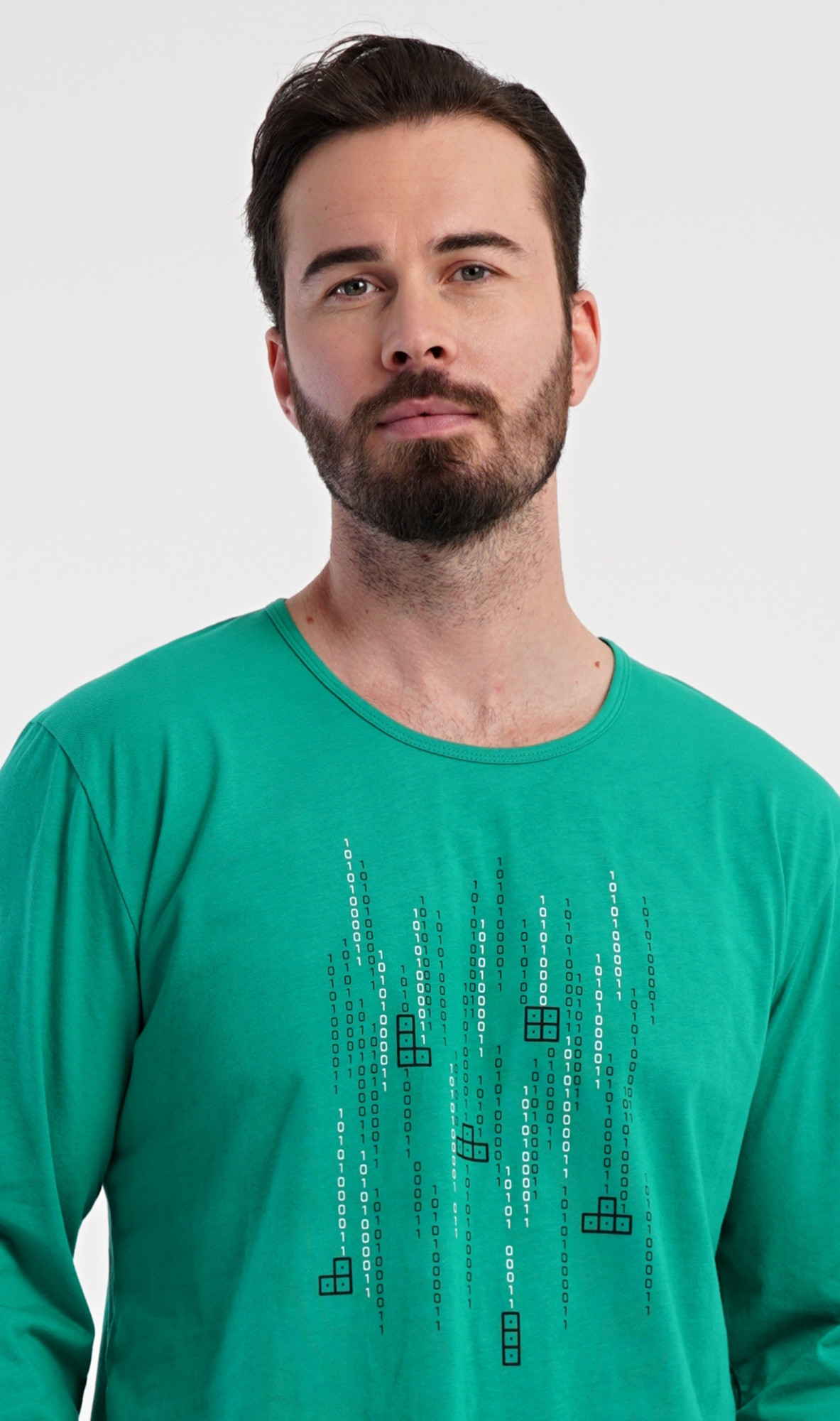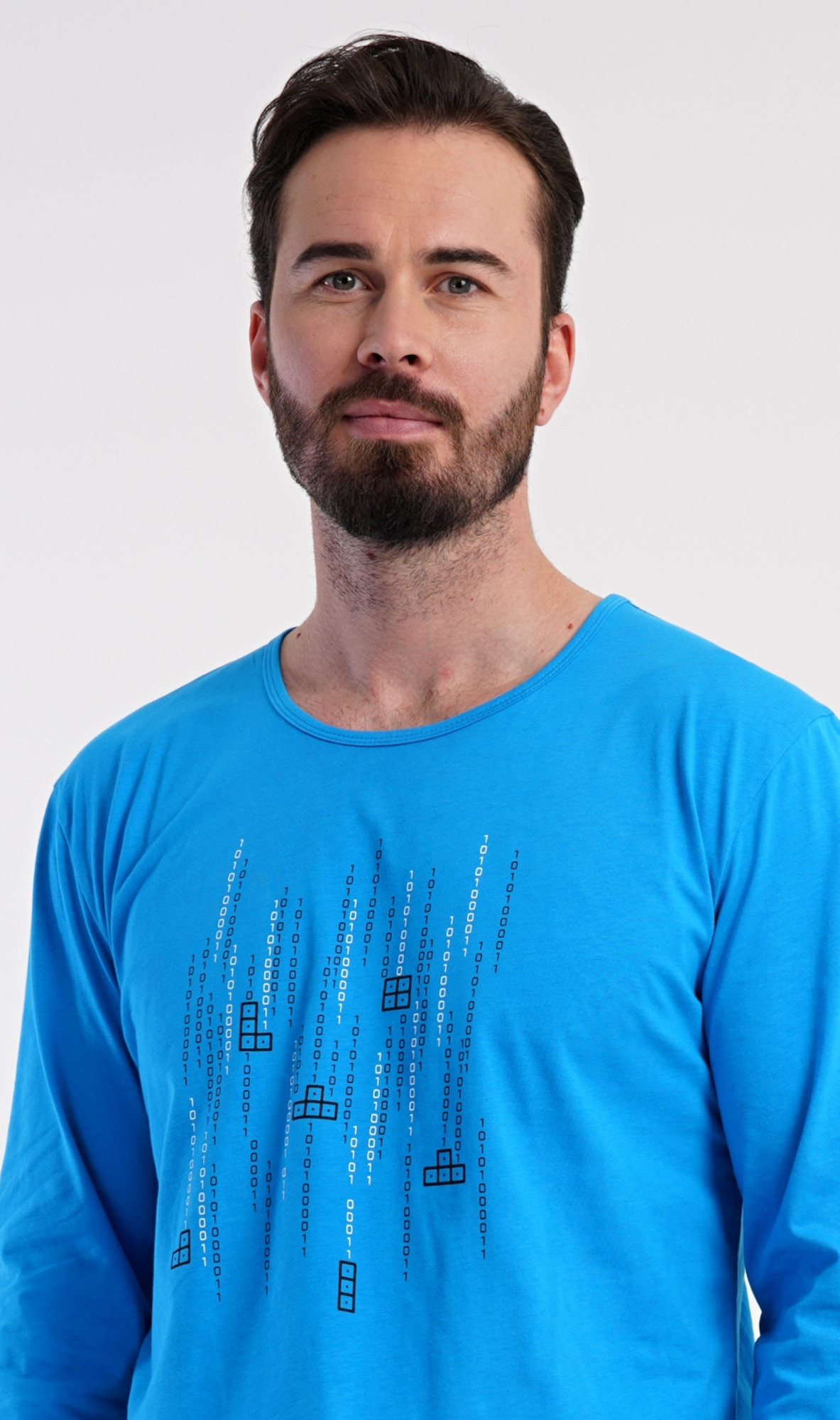 Pánské bavlněné pyžamo s dlouhým rukávem Tetris. Pánské pyžamo se skládá z trika s dlouhým rukávem a dlouhých kalhot. Triko s kulatým výstřihem zdobí na hrudi obrázek hry Tetris. Triko doplňují kárované kalhoty, které mají v pase gumu, šňůrku na stažení a praktické kapsy. Použitý materiál s obsahem bavlny 100% je příjemný a poddajný na dotek.