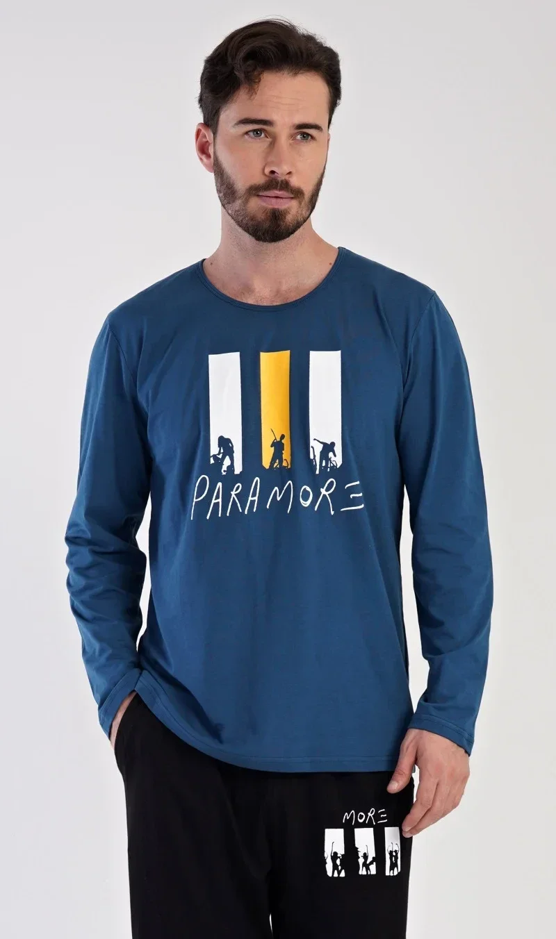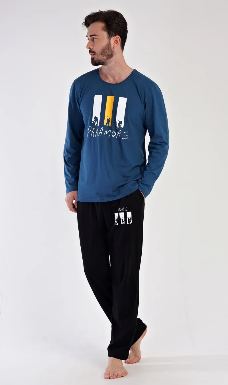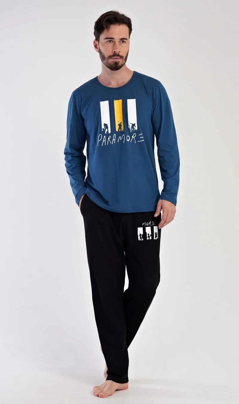 Pánské bavlněné pyžamo dlouhé Oliver. Pánské pyžamo se skládá z trika s dlouhým rukávem a dlouhých kalhot. Na jednobarevném triku s kulatým výstřihem je nápis PARAMORE, který se opakuje i na kalhotách. Triko zdobí obrázky rockové kapely. Kalhoty mají v pase gumu, šňůrku na stažení a praktické kapsy. Použitý materiál je jemný a poddajný na dotek. Podíl bavlny u trika a kalhot je 100%.