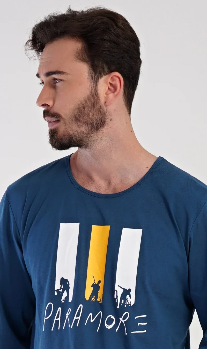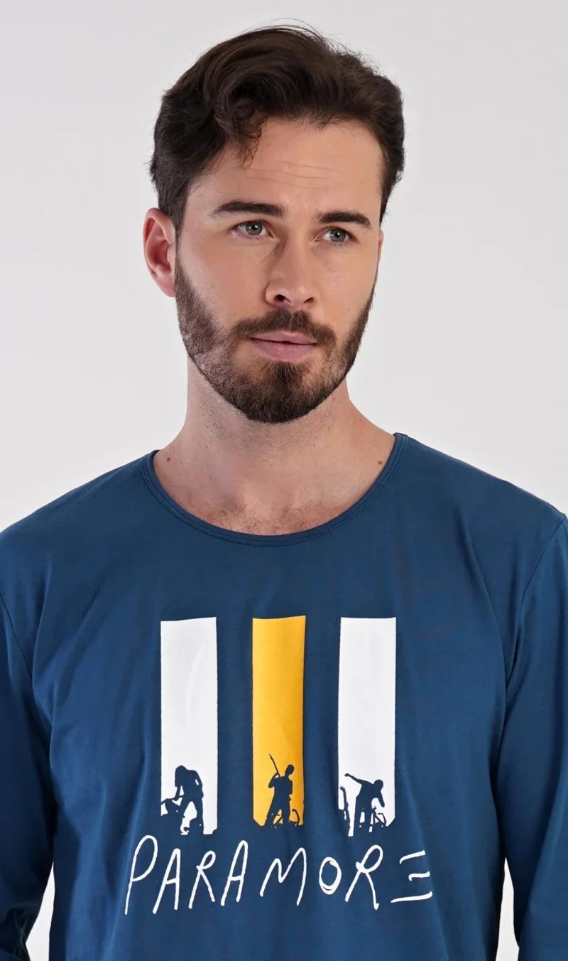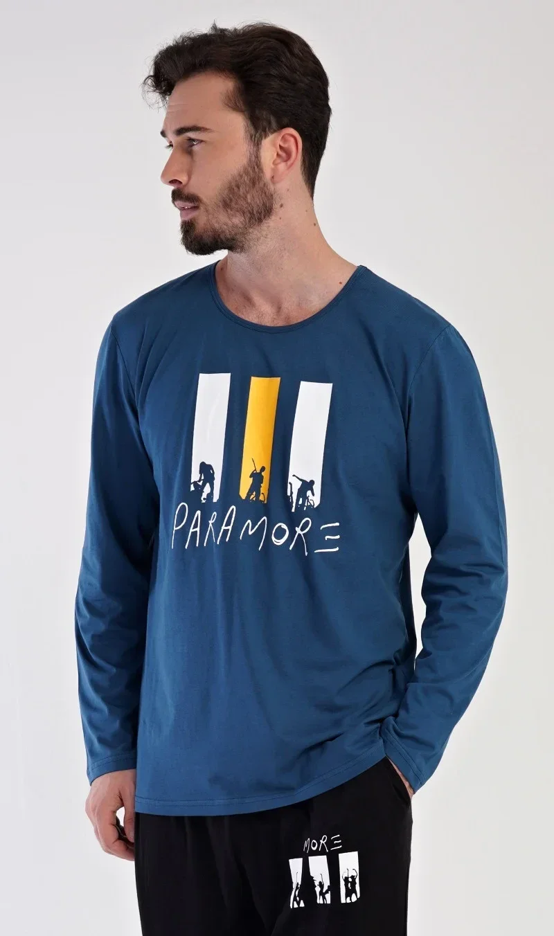 Pánské bavlněné pyžamo dlouhé Oliver. Pánské pyžamo se skládá z trika s dlouhým rukávem a dlouhých kalhot. Na jednobarevném triku s kulatým výstřihem je nápis PARAMORE, který se opakuje i na kalhotách. Triko zdobí obrázky rockové kapely. Kalhoty mají v pase gumu, šňůrku na stažení a praktické kapsy. Použitý materiál je jemný a poddajný na dotek. Podíl bavlny u trika a kalhot je 100%.