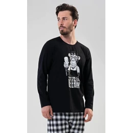 Pánské bavlněné dlouhé pyžamo Opice. Pánské pyžamo se skládá z trika s dlouhým rukávem a dlouhých kalhot. Na triku je obrázek veliké opice s pivem. Kalhoty jsou kostkované, mají gumu a šňůrku na stažení. Použitý materiál s podílem bavlny 100% je příjemný a poddajný na dotek.
