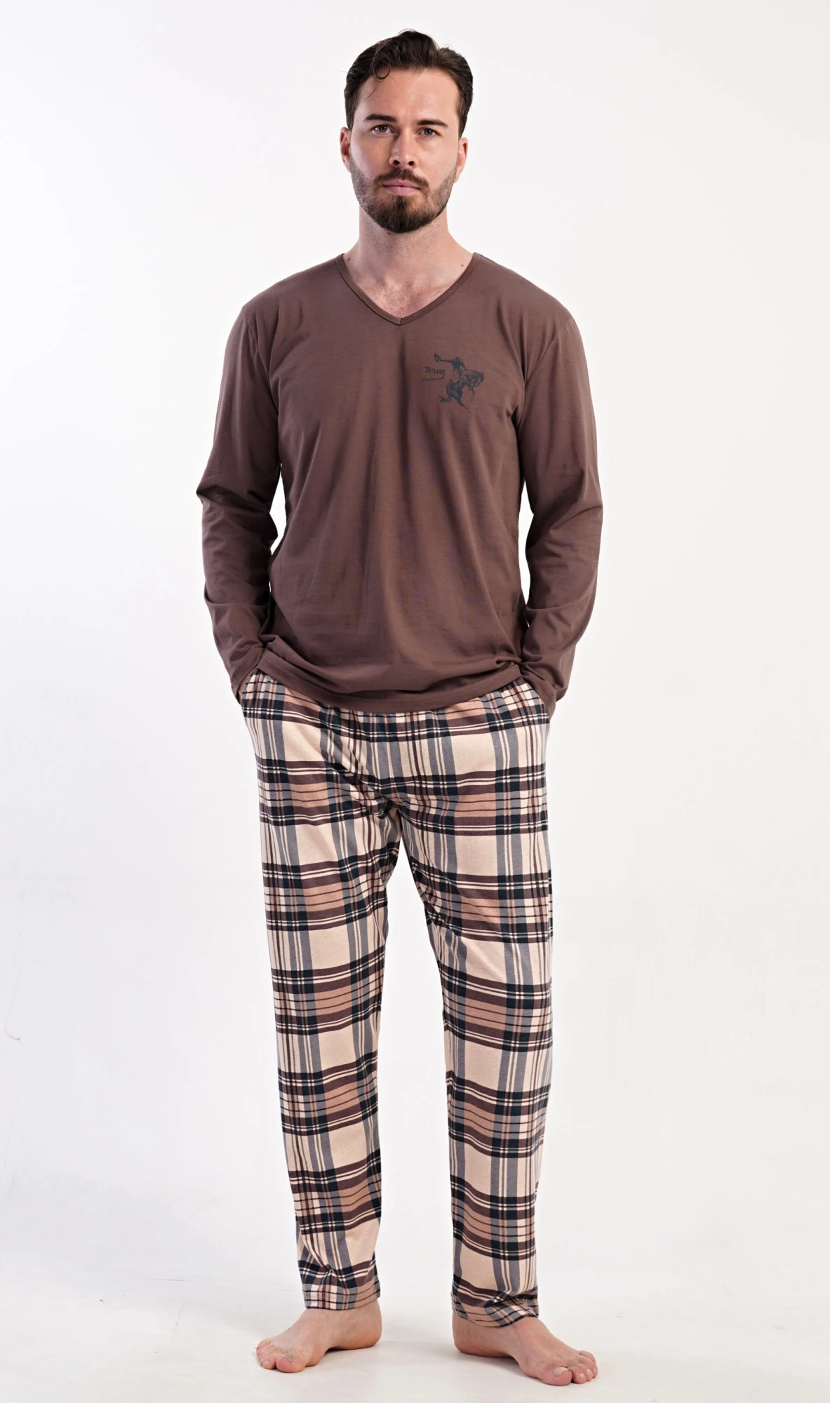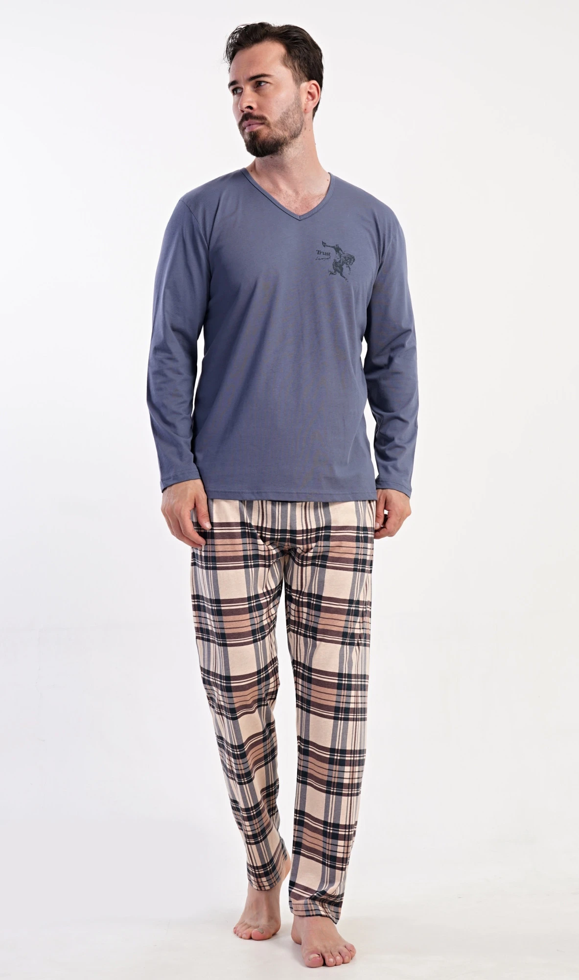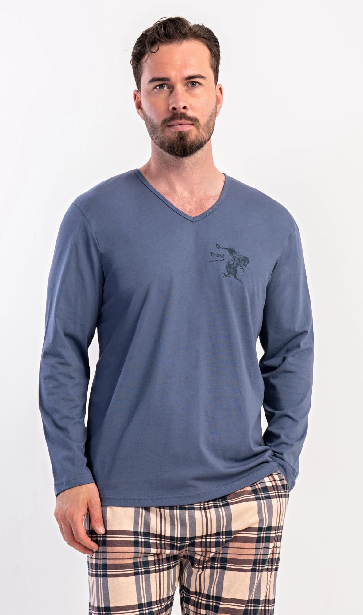 Pánské dlouhé bavlněné pyžamo Paul. Pánské pyžamo se skládá z trika s dlouhým rukávem a dlouhých kalhot. Triko je jednobarevné, zdobené na hrudi drobným obrázkem. Kostkované kalhoty mají v pase gumu, šňůrku na stažení a praktické kapsy. Použitý materiál s obsahem bavlny 100% je poddajný a příjemný na dotek.