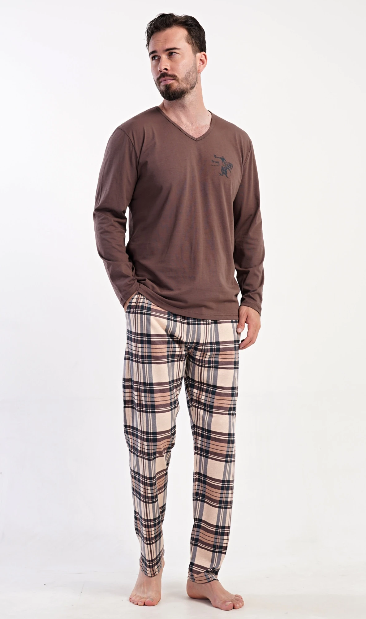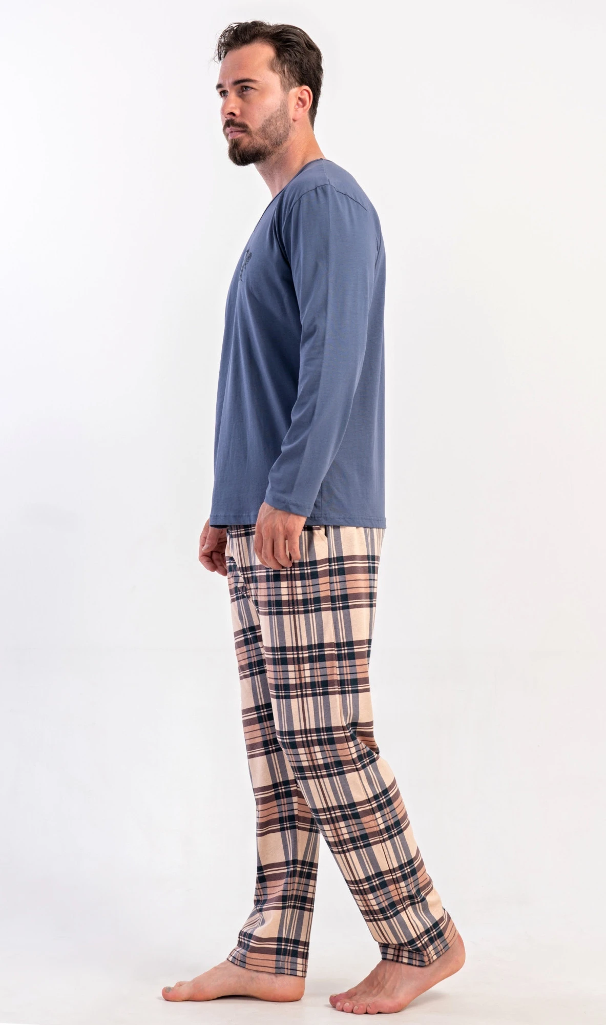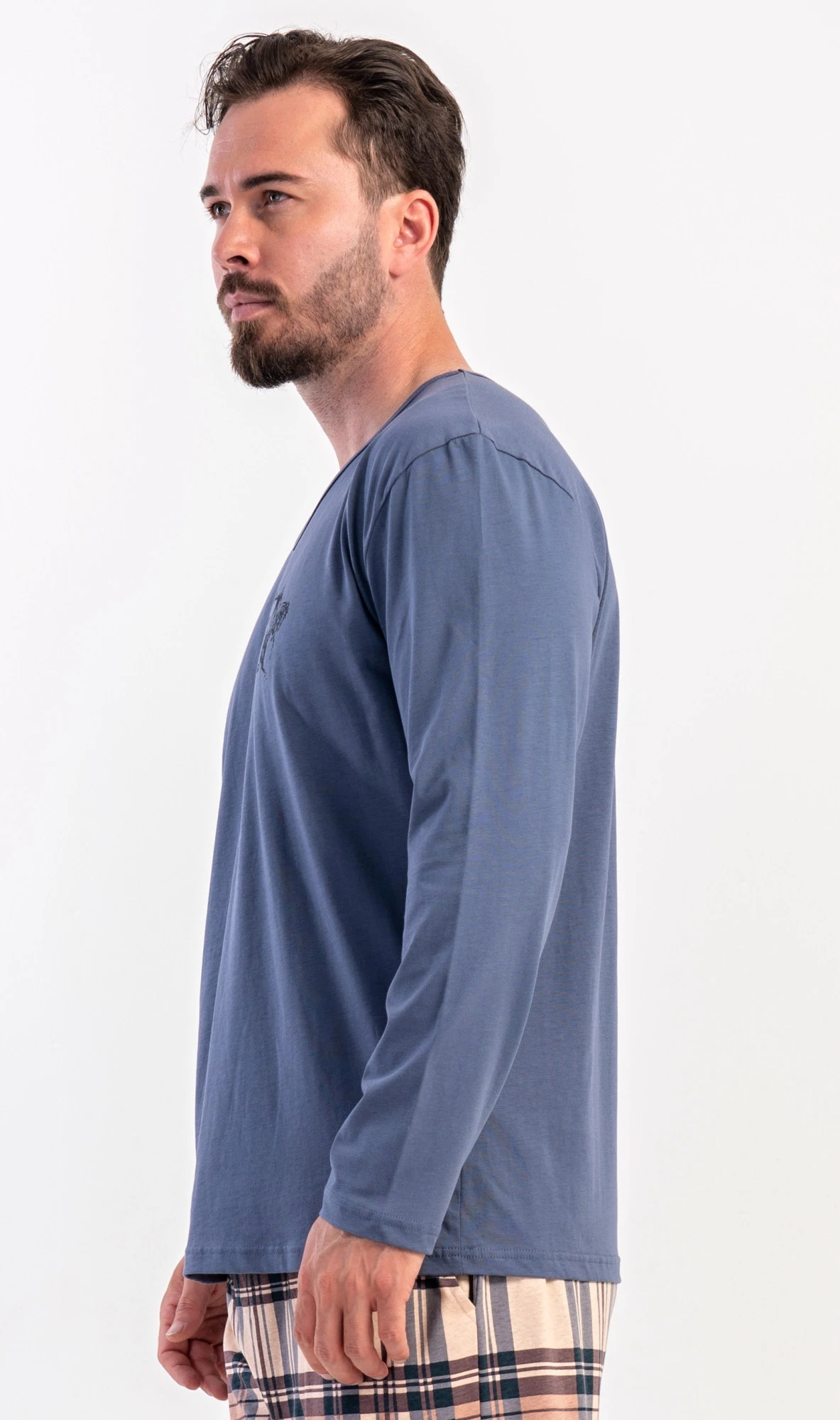 Pánské dlouhé bavlněné pyžamo Paul. Pánské pyžamo se skládá z trika s dlouhým rukávem a dlouhých kalhot. Triko je jednobarevné, zdobené na hrudi drobným obrázkem. Kostkované kalhoty mají v pase gumu, šňůrku na stažení a praktické kapsy. Použitý materiál s obsahem bavlny 100% je poddajný a příjemný na dotek.