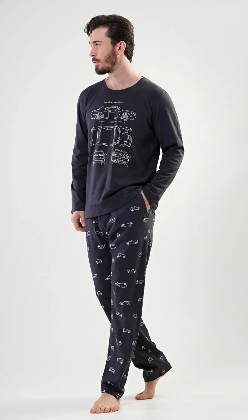Pánské bavlněné pyžamo dlouhé Radim. Pánské pyžamo se skládá z trika s dlouhým rukávem a dlouhých kalhot. Triko je jednobarevné s obrázky závodních aut. Kalhoty jsou tmavě šedé s celopotiskem autíček. Kalhoty jsou do gumy a na stažení šňůrkou v pase. Oceníte i praktické kapsy. Použitý materiál je poddajný a příjemný na dotek.